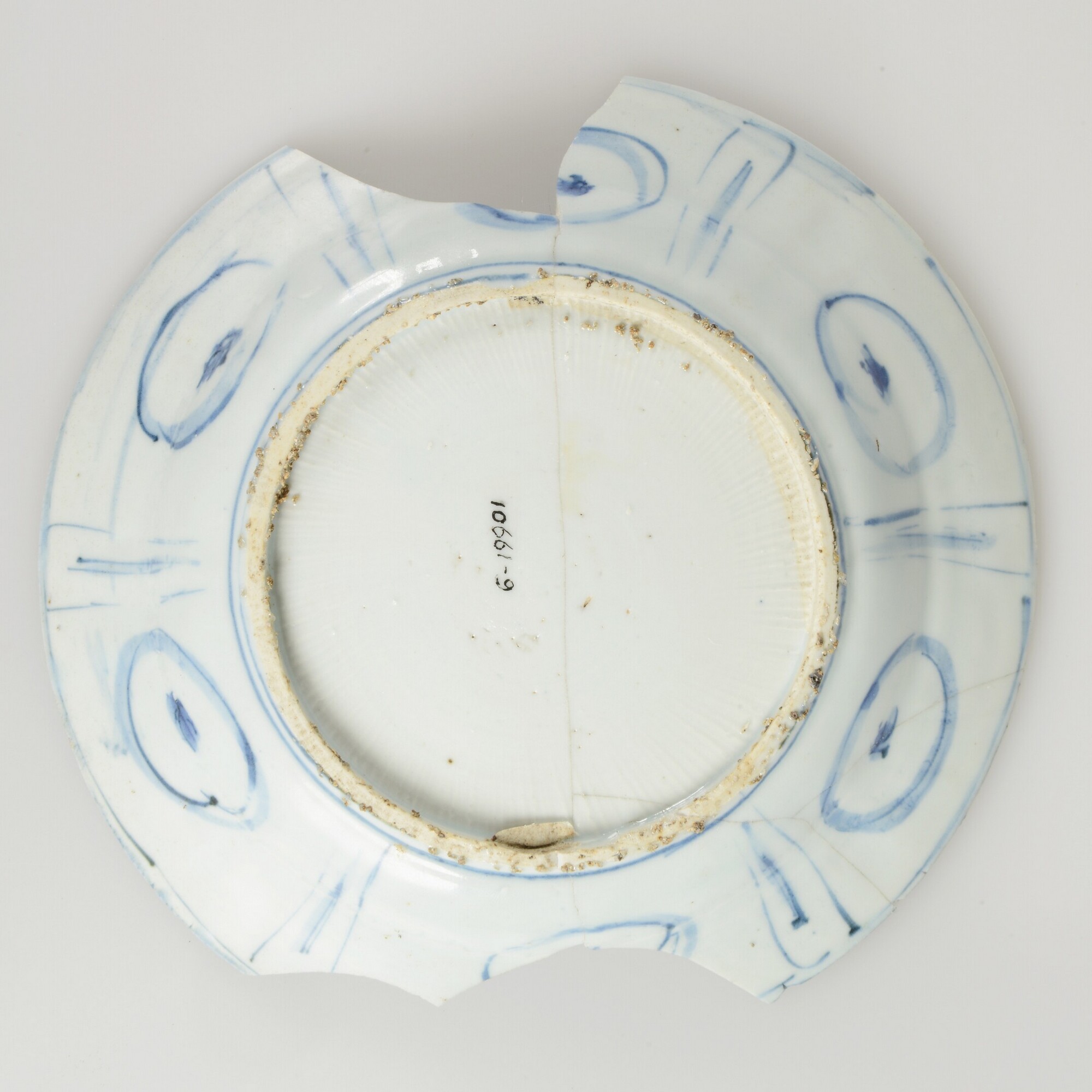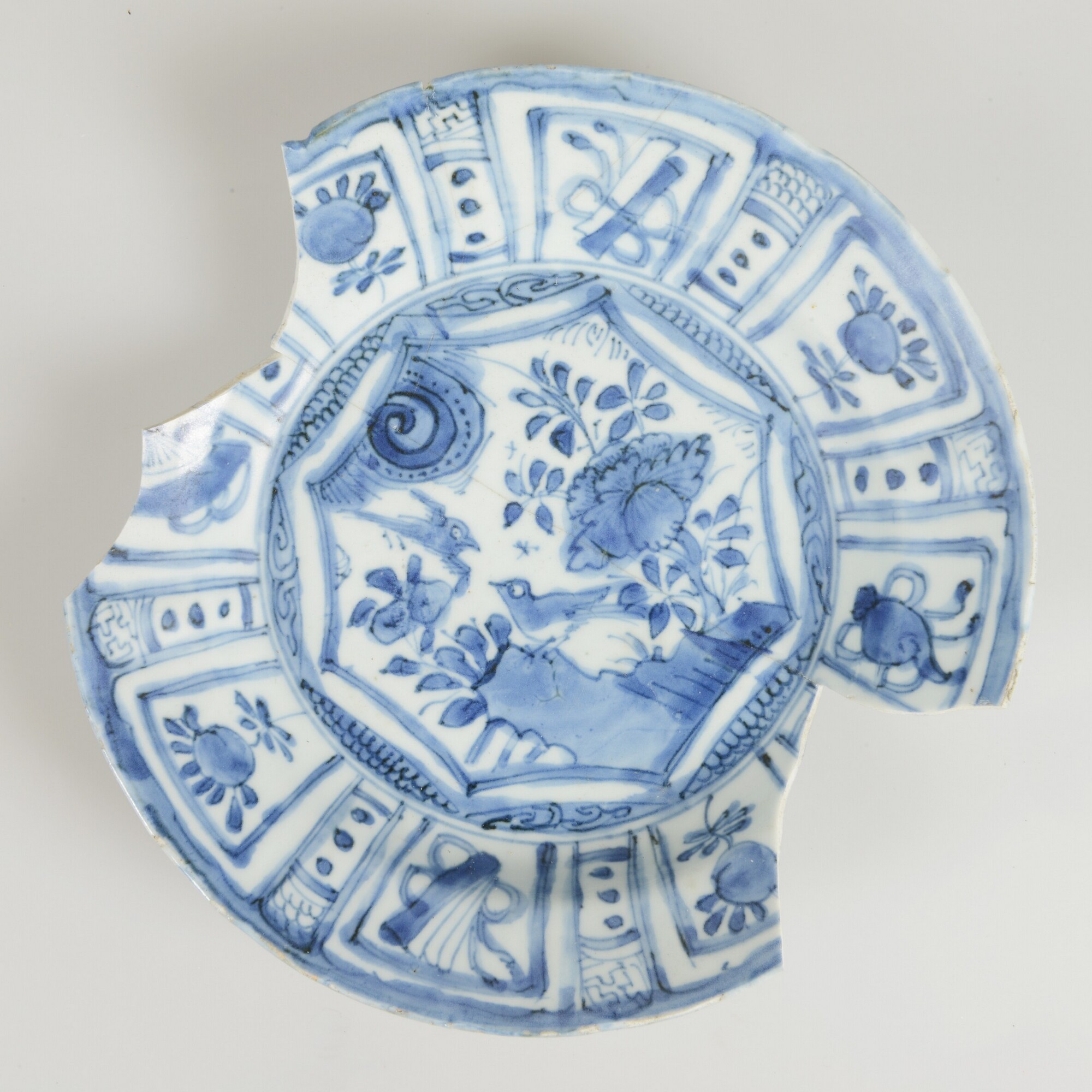 Bord; p-bor-4; bord met naar buiten geknikte vlag; standring; Aziatisch porselein (kraakporselein); veldspaatglazuur; onderglazuur blauwe beschildering: spiegel: vogel in landschap, vlag: Boeddhistische symbolen binnen panelen; herkomst: Jingdezhen, China
