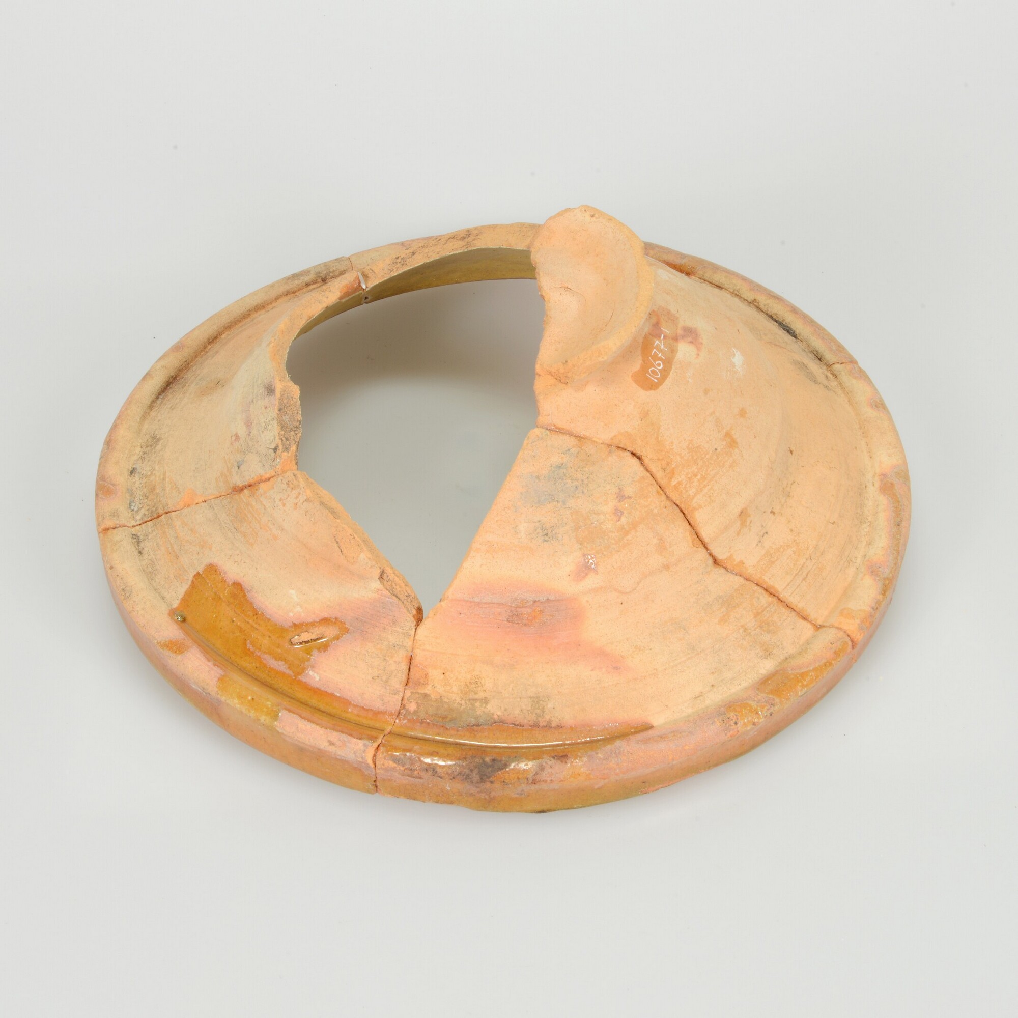 Kom; r-kom-68; roodbakkend aardewerk; inwendig loodglazuur; diepe kom met naar buiten geknikte vlag; manchetrand; standring; slibdecoratie: gele sliblaag op binnenzijde tot aanzet rand en ringeloorversiering op vlag