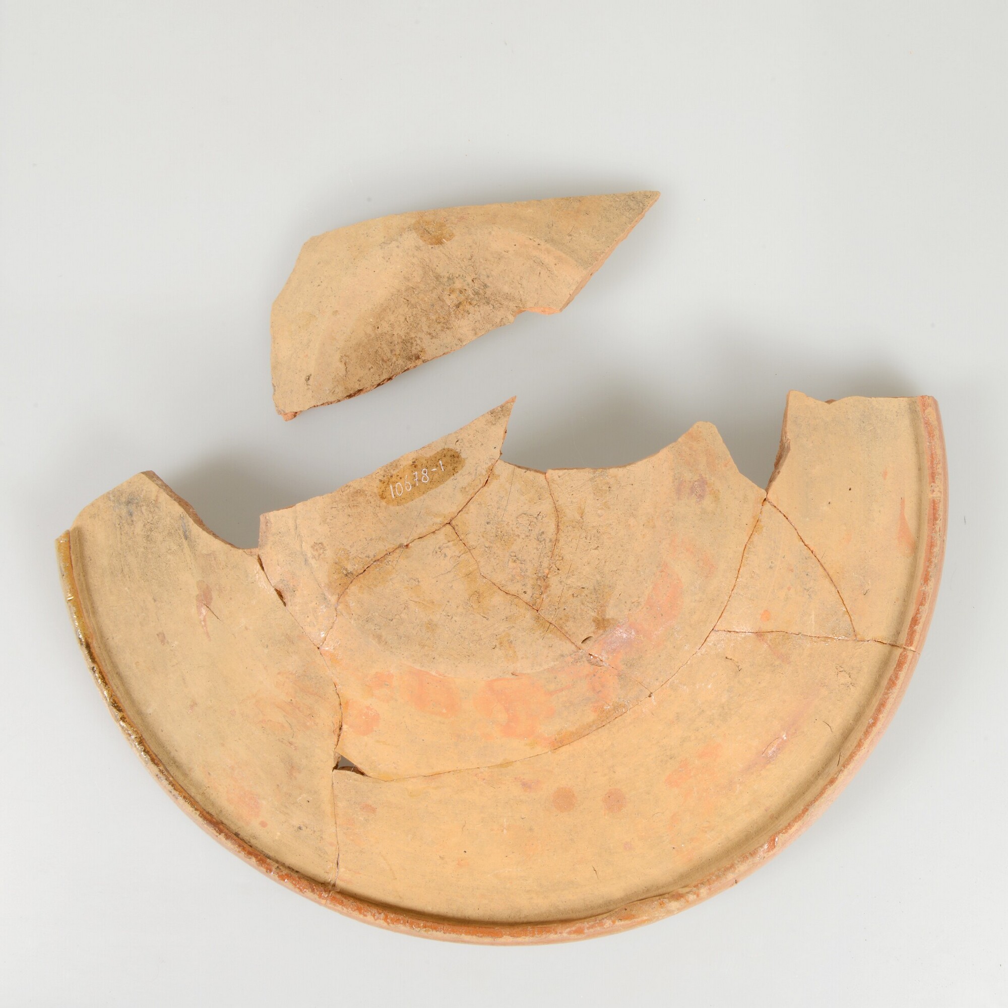 Bord; wa-bor-1; roodbakkend; loodglazuur, slibversiering; slib-krastechniek; vlag: concentrische cirkels en bladermotief met niet ingevulde bladeren, spiegel: vaas met distels en eikenbladeren; standvlak