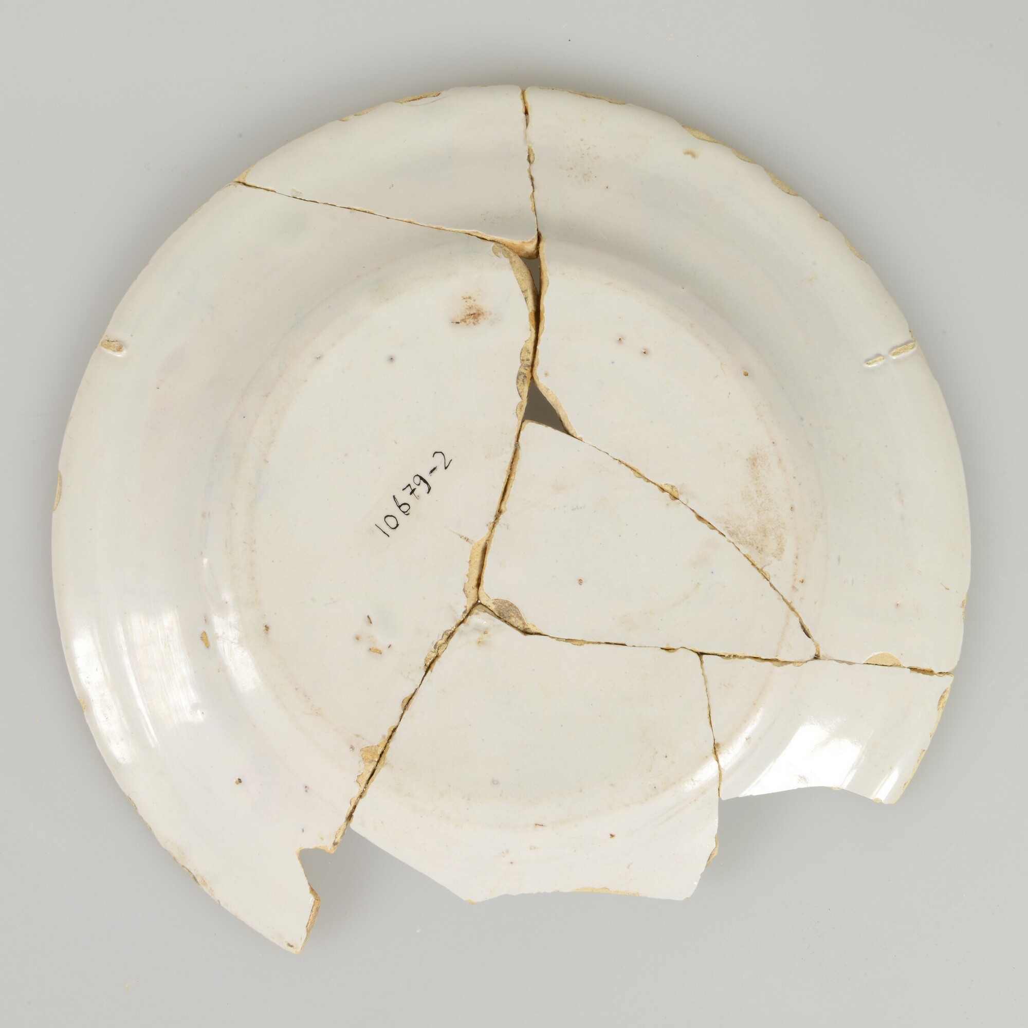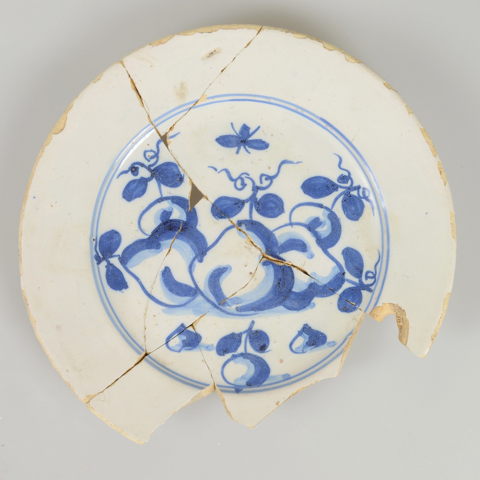 Bord; f-bor-2; Nederlands faience; voor- en achterzijde tinglazuur; spiegel: fruit en nachtvlinder binnen twee cirkels in blauw; standvlak; herkomst: Delft