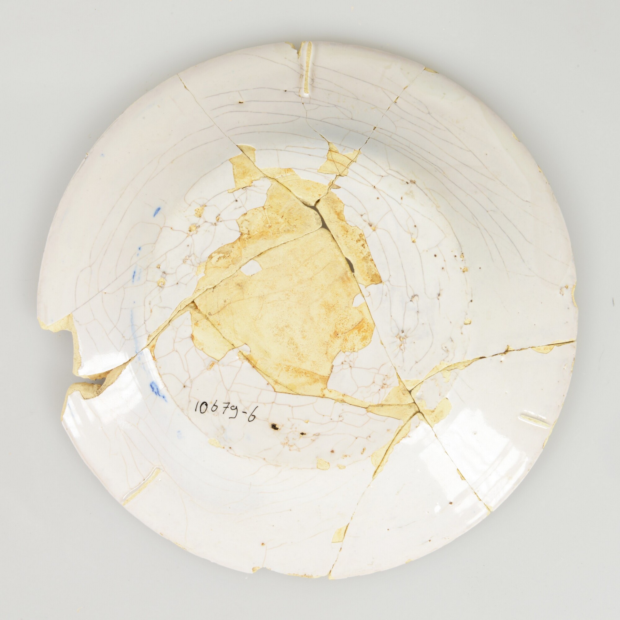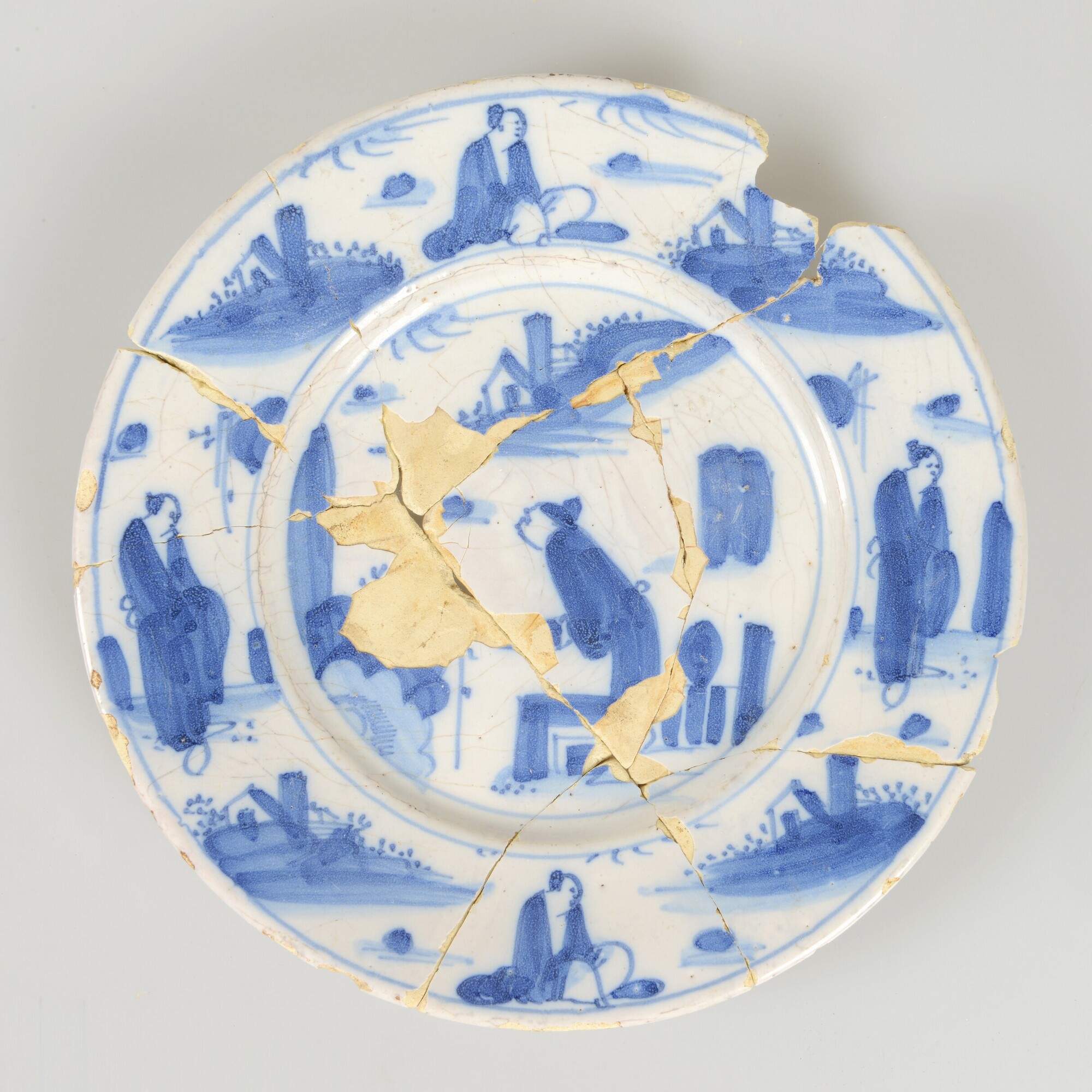 Bord; f-bor-2; plat bord met knik platte spiegel naar platte vlag; Nederlands faience; voor- en achterzijde tinglazuur; spiegel: landschap met Chinees figuur, vlag: Chinese figuren; standvlak; herkomst: Delft