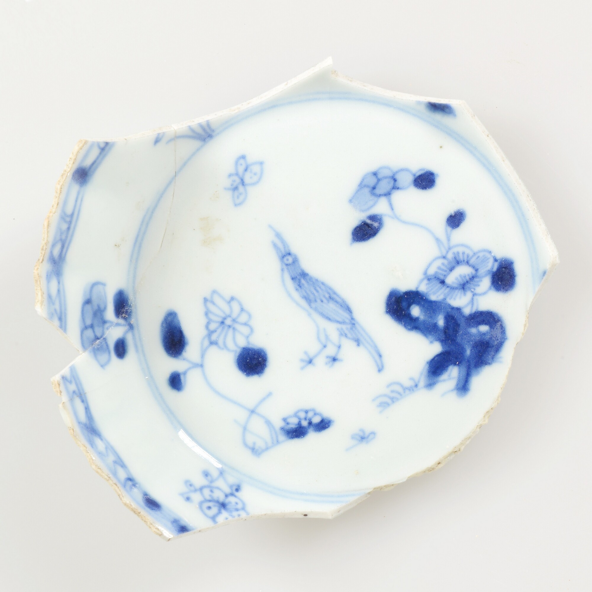 Bord; p-bor-9; in mal gevormd diep bord met reliefwand en licht uitgebogen rand; porselein; veldspaatglazuur; blauwe beschildering; spiegel: vogel en bloemen; vlag: bloemen; standring; herkomst: China