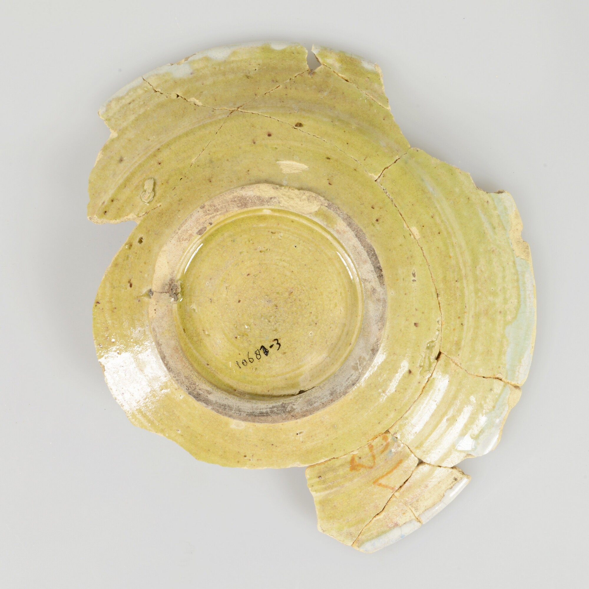 Bord; m-bor-3; bord met vlakke spiegel, knik spiegel naar vlag en uitgebogen rand; Nederlandse majolica; bovenzijde tinglazuur, onderzijde loodglazuur; beschildering in blauw, geel en oranje; spiegel: lopende engel; vlag: gestileerde aigretterand; onderzijde gemerkt: ´SL´; standring met secundaire doorboring; herkomst: Nederland