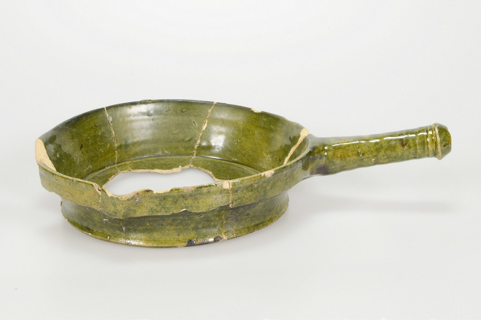 Steelpan; w-bak-3; steelpan met scherpe knik bodem naar wand en kraagrand; witbakkend aardewerk; in- en uitwendig loodglazuur met koperoxide; schenklip; één holle steel; herkomst: Alkmaar?