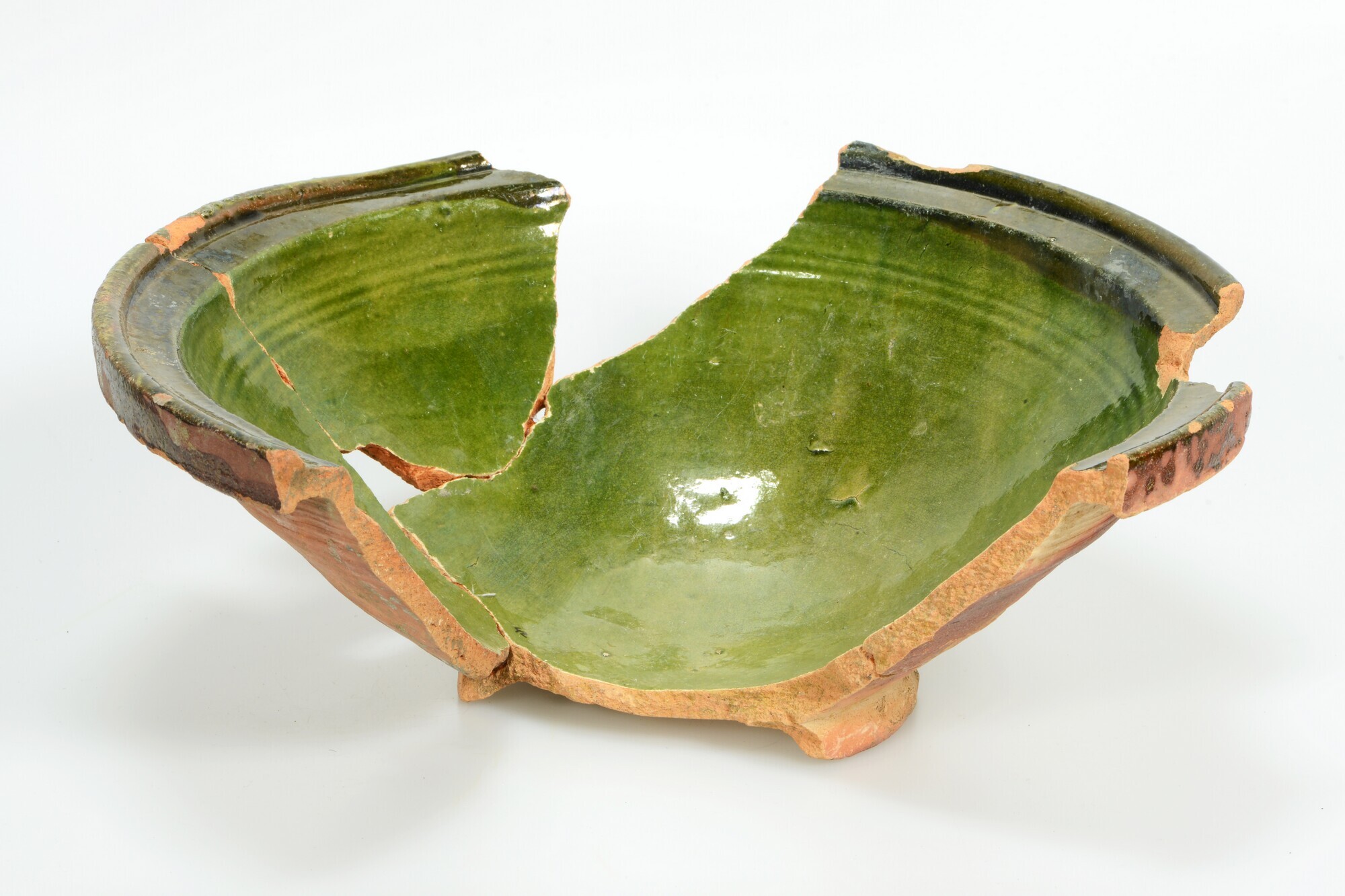 Kom; r-kom-58; bolle kom met naar buiten geknikte rand; roodbakkend aardewerk; inwendig loodglazuur met koperoxide; standring