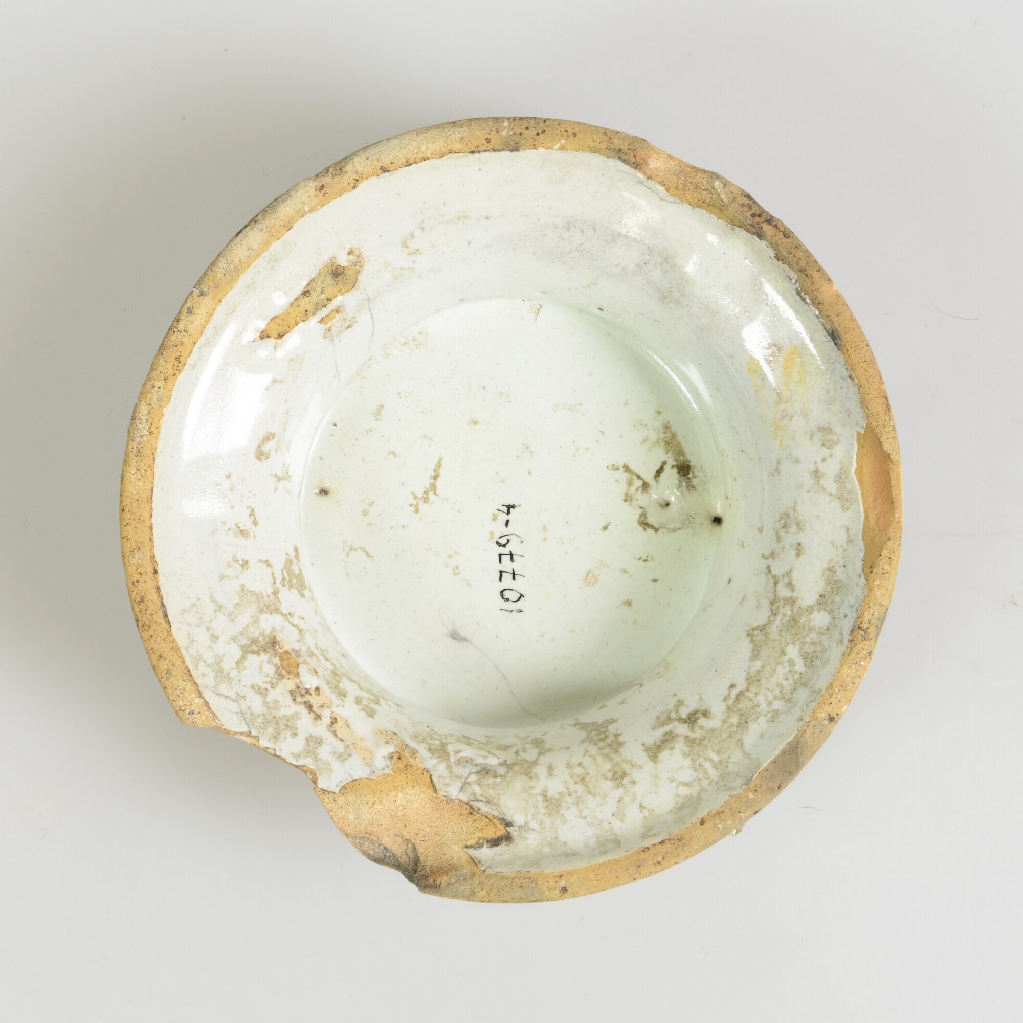 Plooischotel; i-plo-; Italiaans majolica/faience; tinglazuur; heilige in landschap met een lelie in de hand, mogelijk Antonius van Padua; standvoet met blauwe en gele band; herkomst: Italië