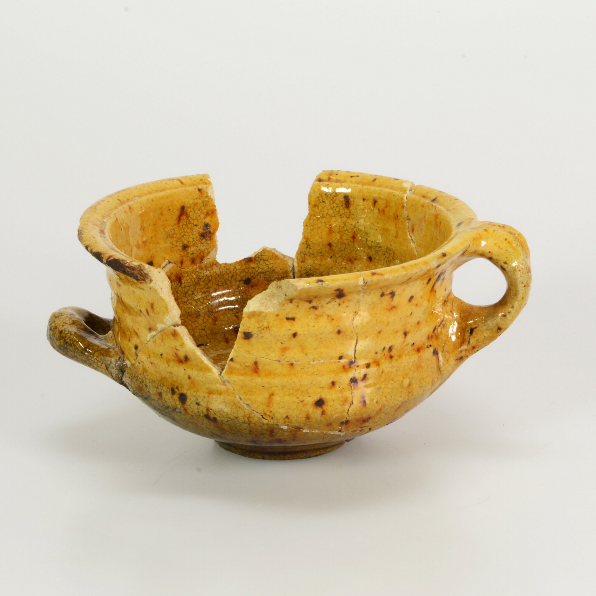 Kop; w-kop-16; witbakkend aardewerk; kop met steile, naar buiten geknikte wand; volledig geglazuurd; bruine spikkels aan de buitenzijde; standvlak; horizontaal worstoor; verticaal geknepen lintoor