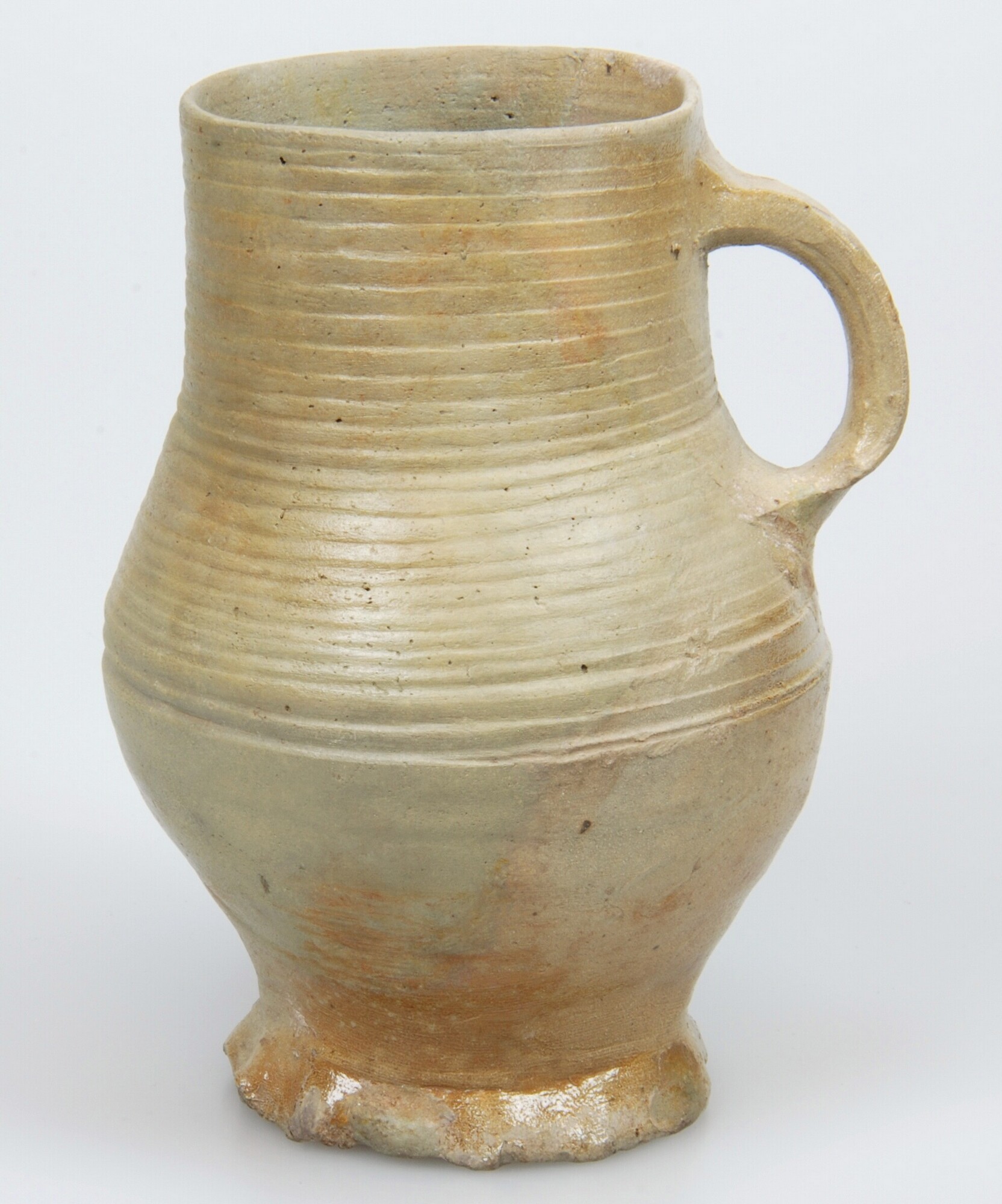 Kan; s2-kan-51; biconische kan met buikknik met ribbel en hoge hals met rechte rand; geknepen standring; één verticaal lintoor; herkomst: Langerwehe