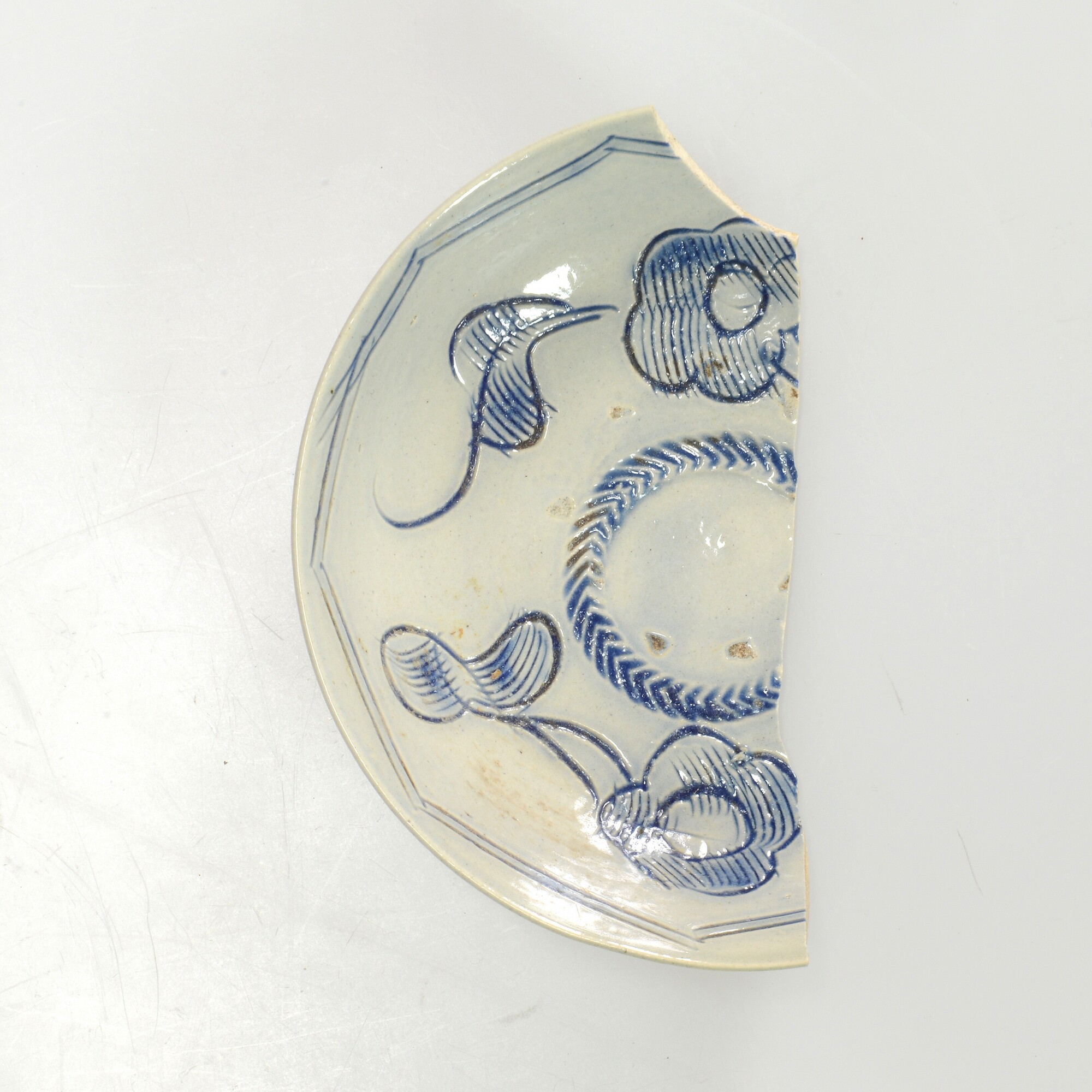 Bord; s3-bor-1; bord met omgebogen rand; industrieel steengoed; zoutglazuur; versiering van ingekerfde florale en geometrische motieven, opgevuld met kobaltblauw, scratchware; herkomst: Engeland