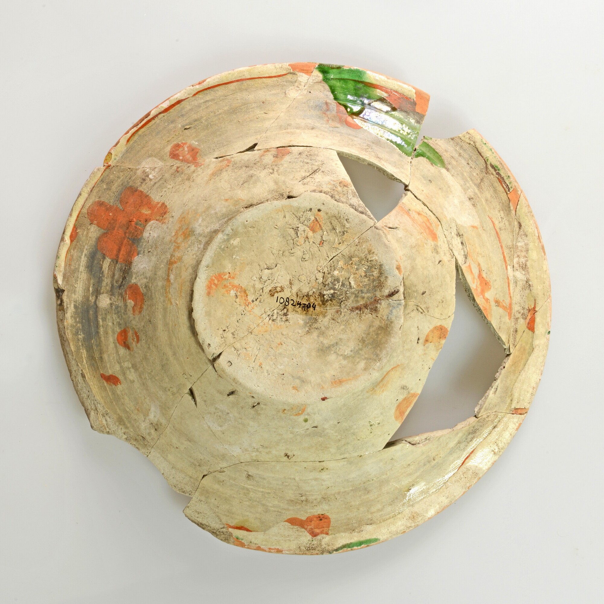 Bord; wf-bor-1; bord met licht gebolde spiegel, platte vlag en verdikte rand, standvlak; witbakkend aardewerk; inwendig loodglazuur; witte kleislib met koperoxide op rode kleislib; ingekraste sgraffito-versiering: spiegel: lijnen en gestileerde bladeren, vlag: golvend lijnenmotief; herkomst: Beauvais, Frankrijk