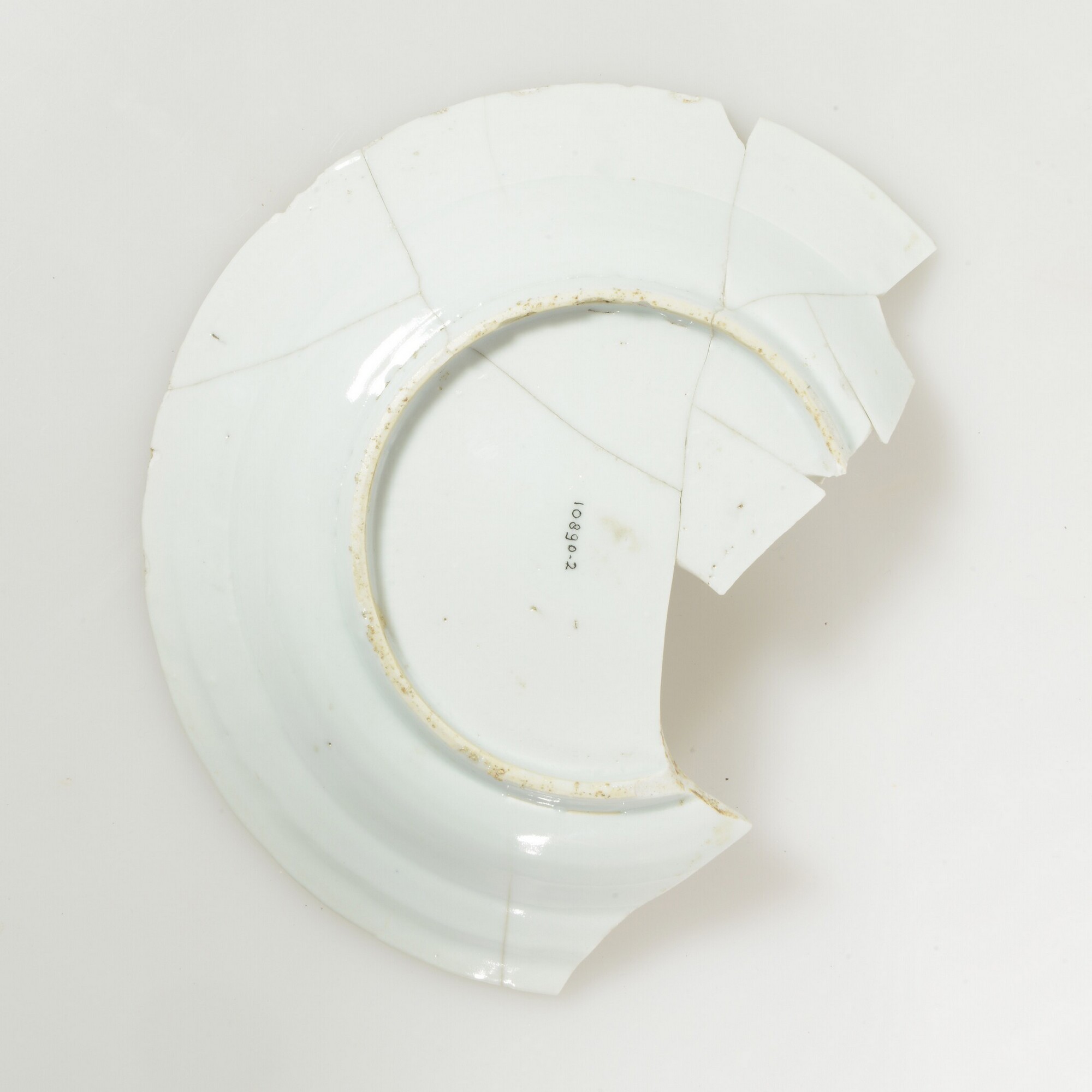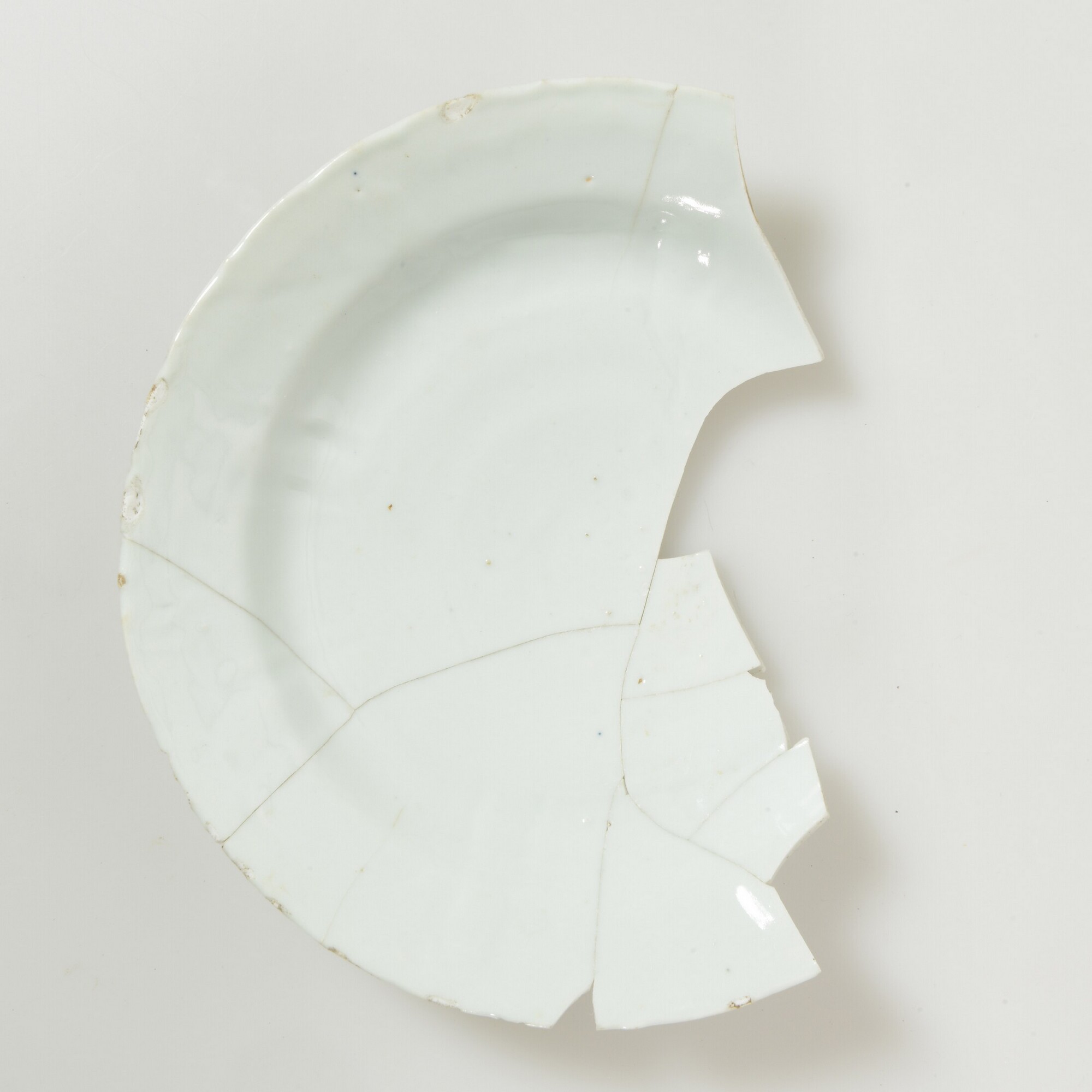 Bord; p-bor-4; in mal gevormd bord met vlakke spiegel en naar buiten geknikte platte vlag, kraakrand, standring; Aziatisch porselein; veldspaatglazuur; op zand gebakken; onbeschilderd; herkomst: China