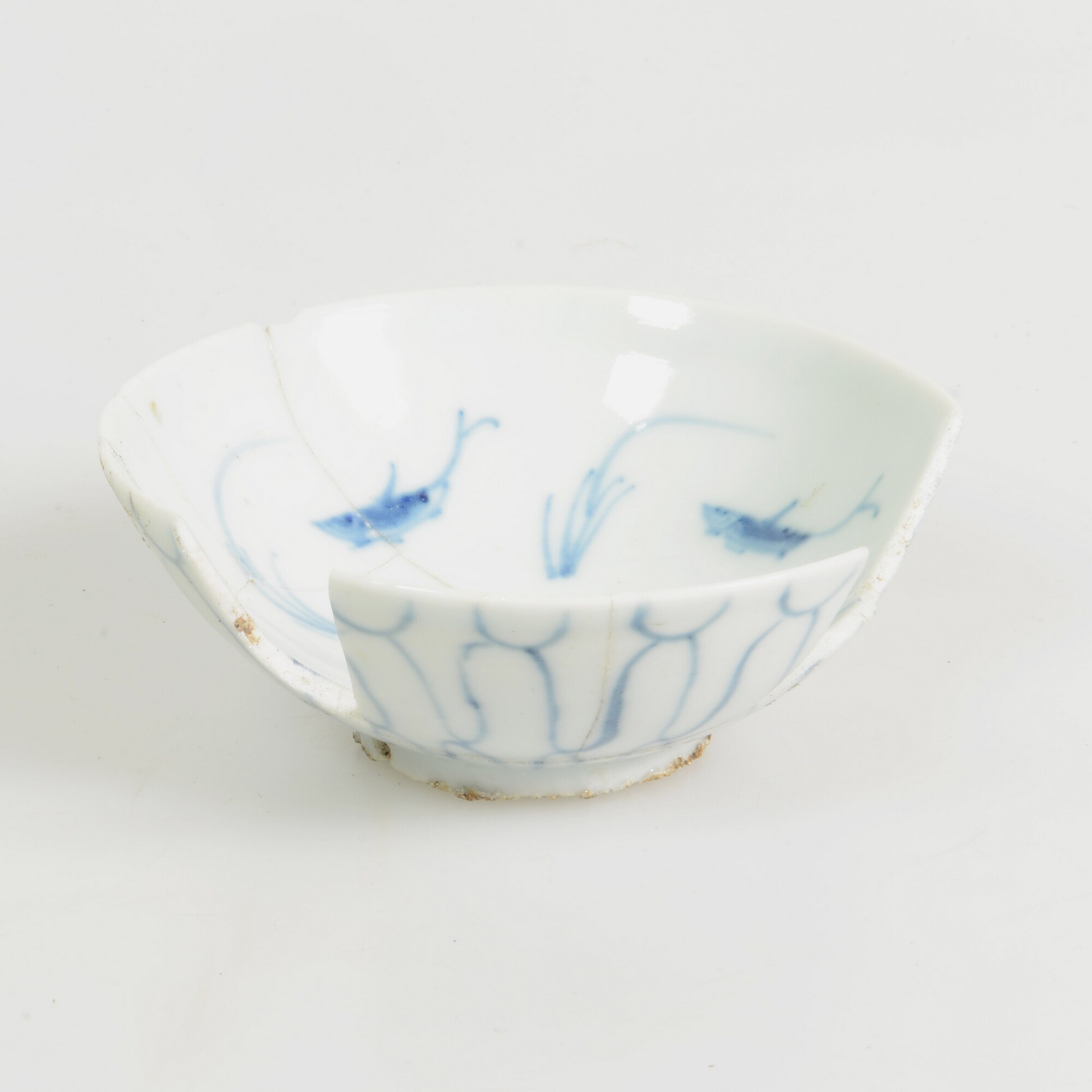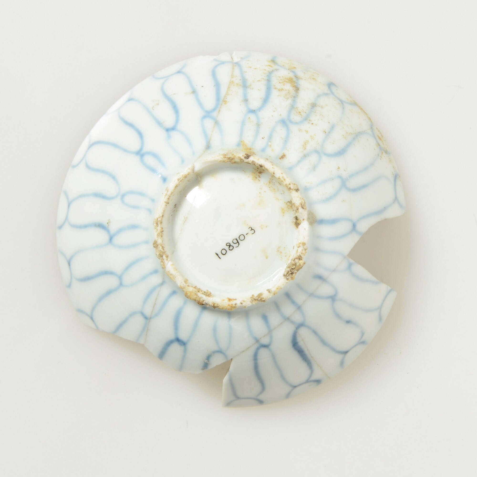 Bord; p-bor-6; diep afgerond bord zonder vlag met rechte rand, standring; Aziatisch porselein; veldspaatglazuur; op zand gebakken; blauwe beschildering: bovenkant: krab, vissen en zeewier, achterkant: visnetmotief; secundair doorboorde standring; herkomst: China