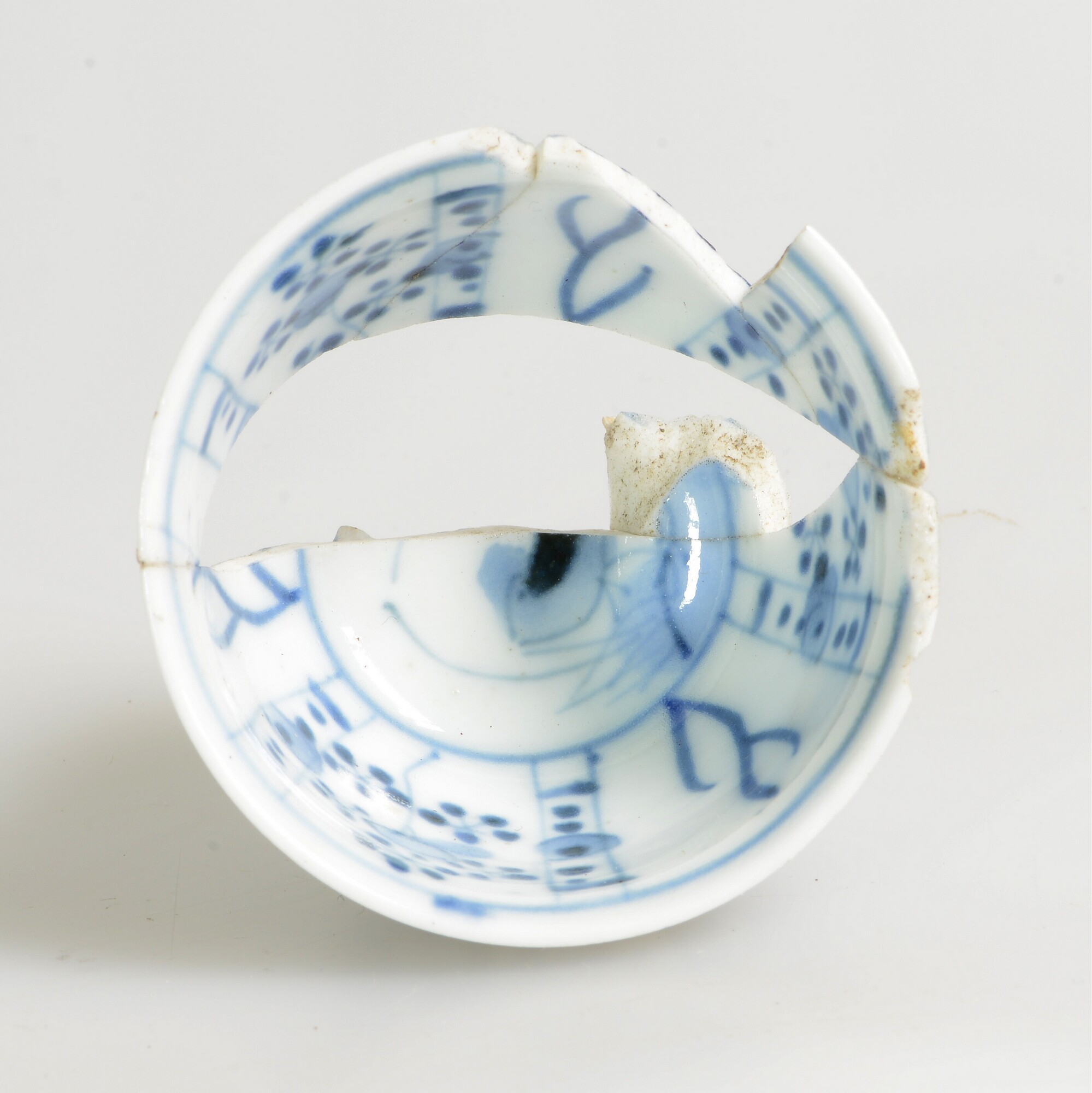 Kop; p-kop-8; diepe kop met rechte rand, standring; Aziatisch porselein; veldspaatglazuur; onderglazuur blauwe beschildering: kraakdecor, panelen met florale motieven, inwendig bodem: vogel, onderkant: karaktertekens; herkomst: Hizen, Japan