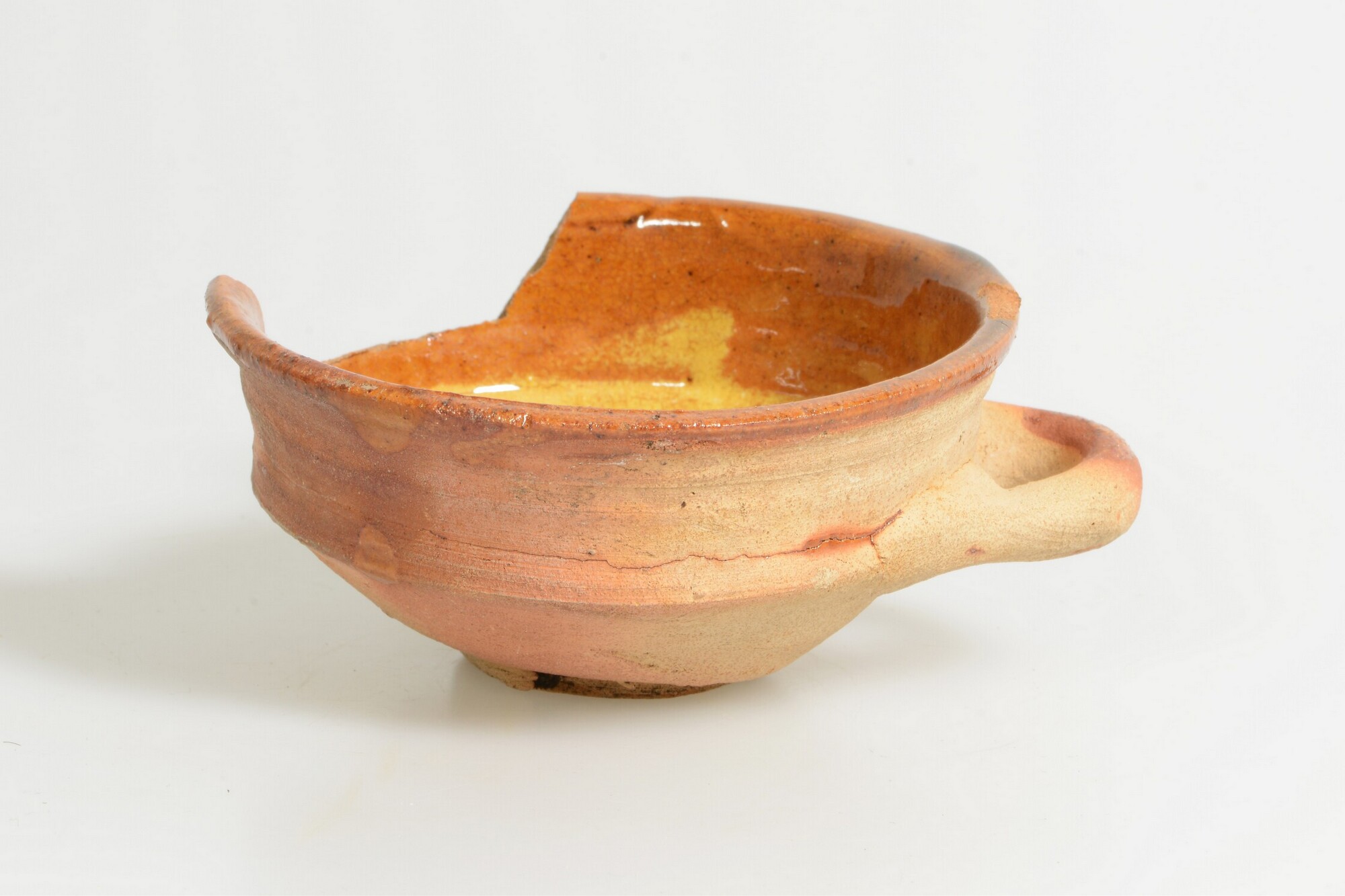 Kop; r-kop-16; kop met scherpe knik bodem-wand en iets uitgebogen wand, standvlak, horizontaal oor; roodbakkend aardewerk; inwendig loodglazuur, op bodem witte slib