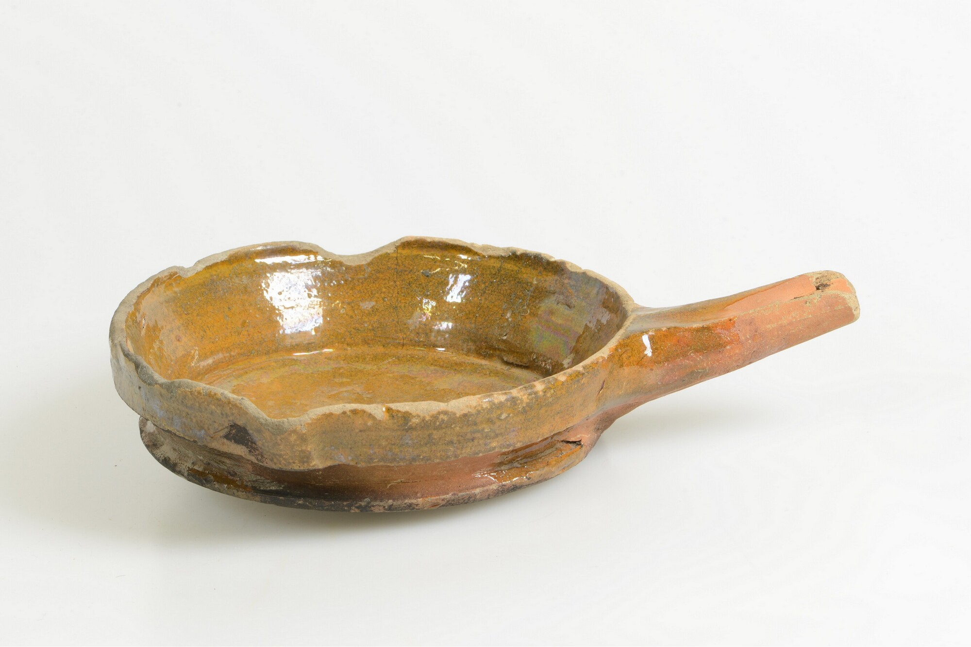 Bakpan; r-bak-6; bakpan met hoge zijwand en hoge kraagrand, beroet standvlak, massieve steel, schenklip; roodbakkend aardewerk; inwendig loodglazuur; herkomst: Bergen op Zoom?