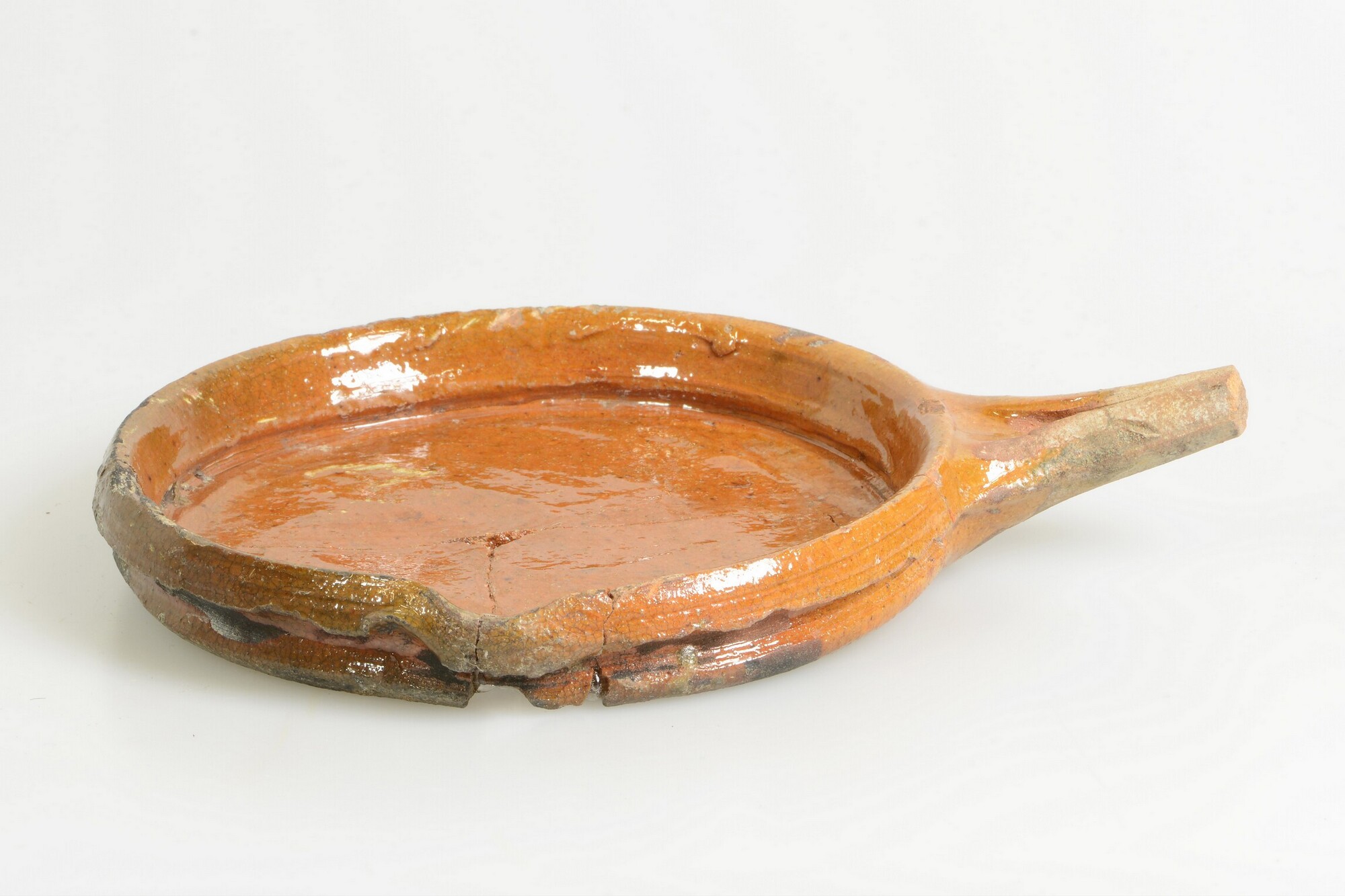 Bakpan; r-bak-48; ondiepe platte bakpan met kraagrand, beroet standvlak, toegevouwen steel, schenklip; roodbakkend aardewerk; inwendig geheel en uitwendig deels loodglazuur; herkomst: Gouda?