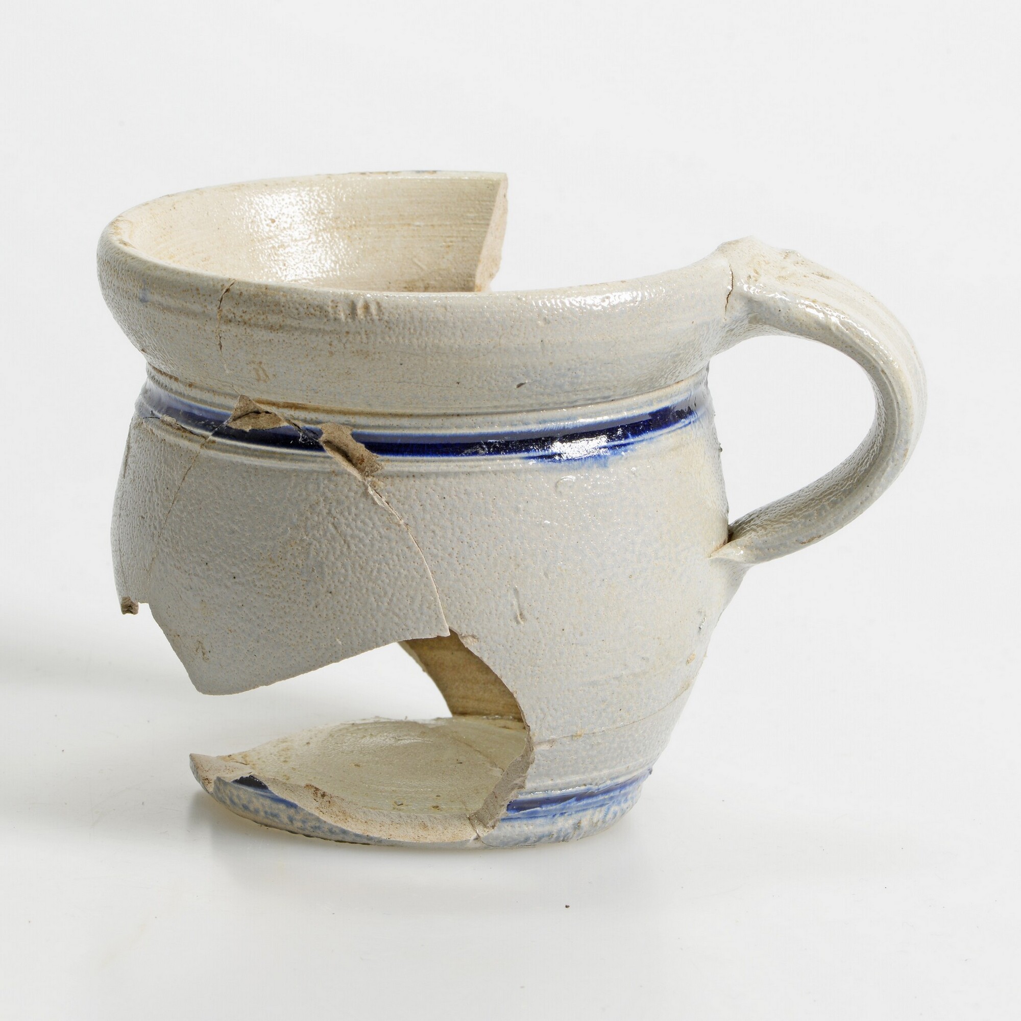 Pispot, spuugpot?; s2-pis-2; tonvormige pispot met naar buiten geknikte rand met dekselgeul, standvlak, een lintoor; steengoed met oppervlaktebehandeling, zoutglazuur met plekken kobaltoxide; herkomst: Westerwald