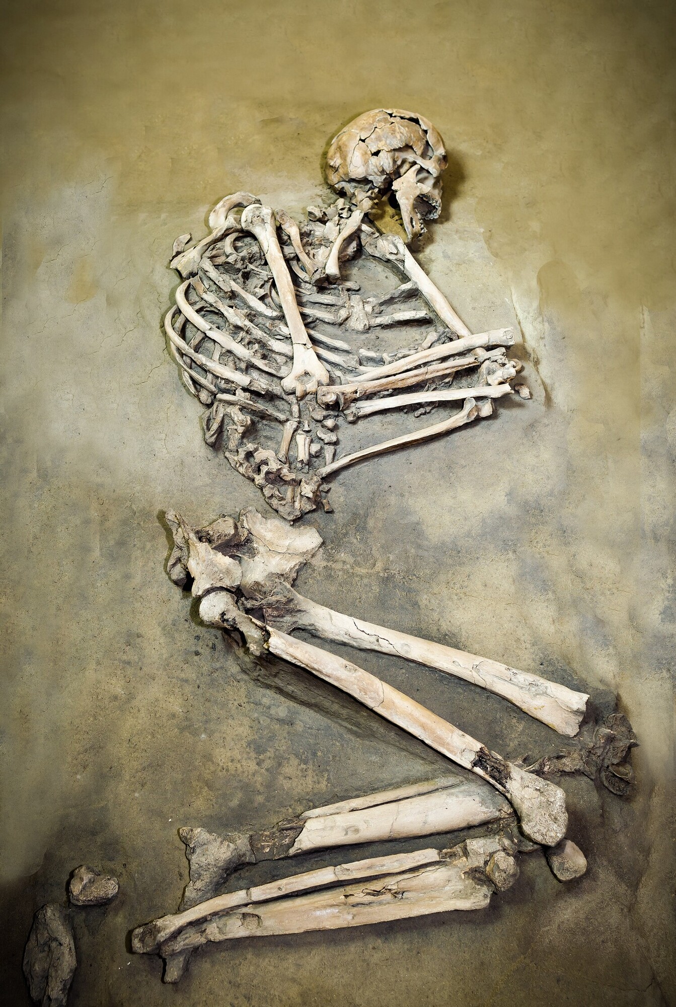 Inhumatiegraf; hurkgraf; menselijk skelet van een man tussen de 30-40 jaar met een lengte van 1.79 man was in hurkhouding op zijn linker zijde in een grafkuil gelegd die aan drie zijden met dikke eiken planken was verstevigd; voeten zijn vóór de begraving afgezet