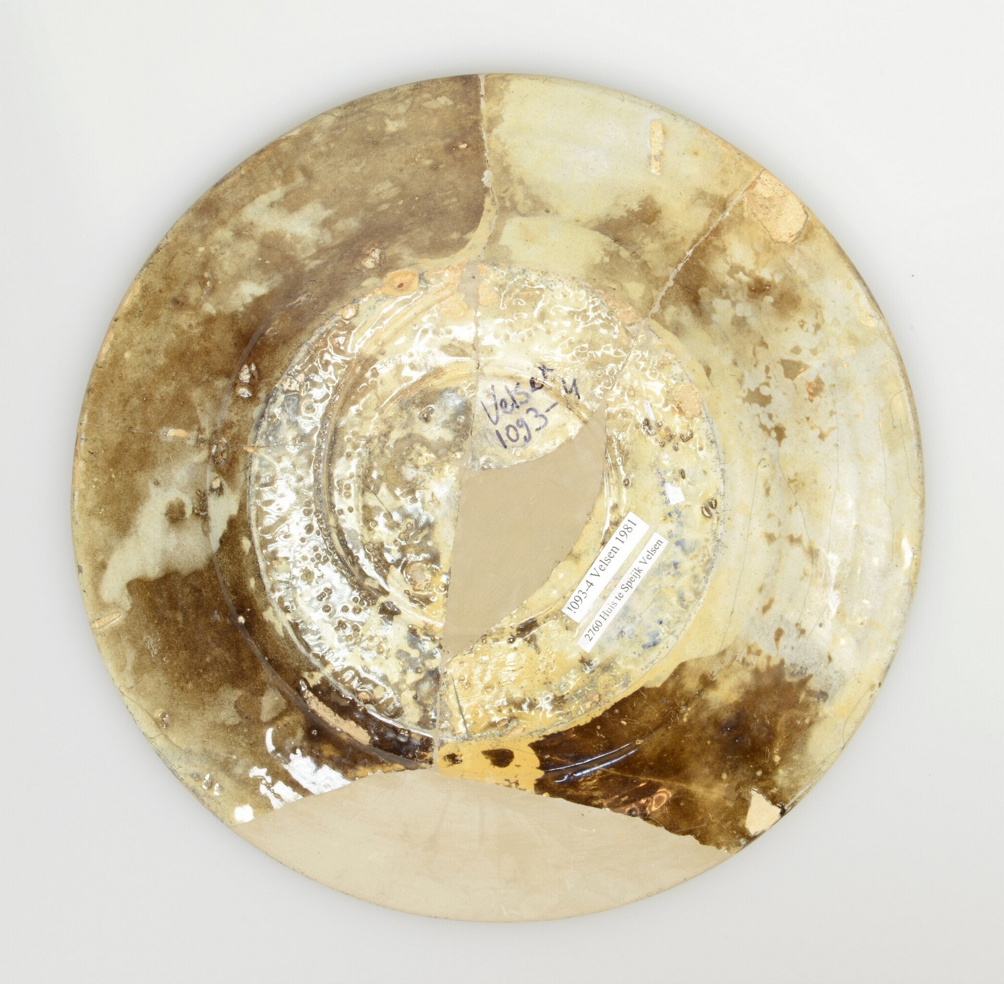 Bord; f-bor-2; faience; tinglazuur; blauw, sp: doedelzakspeler op vat; standvlak