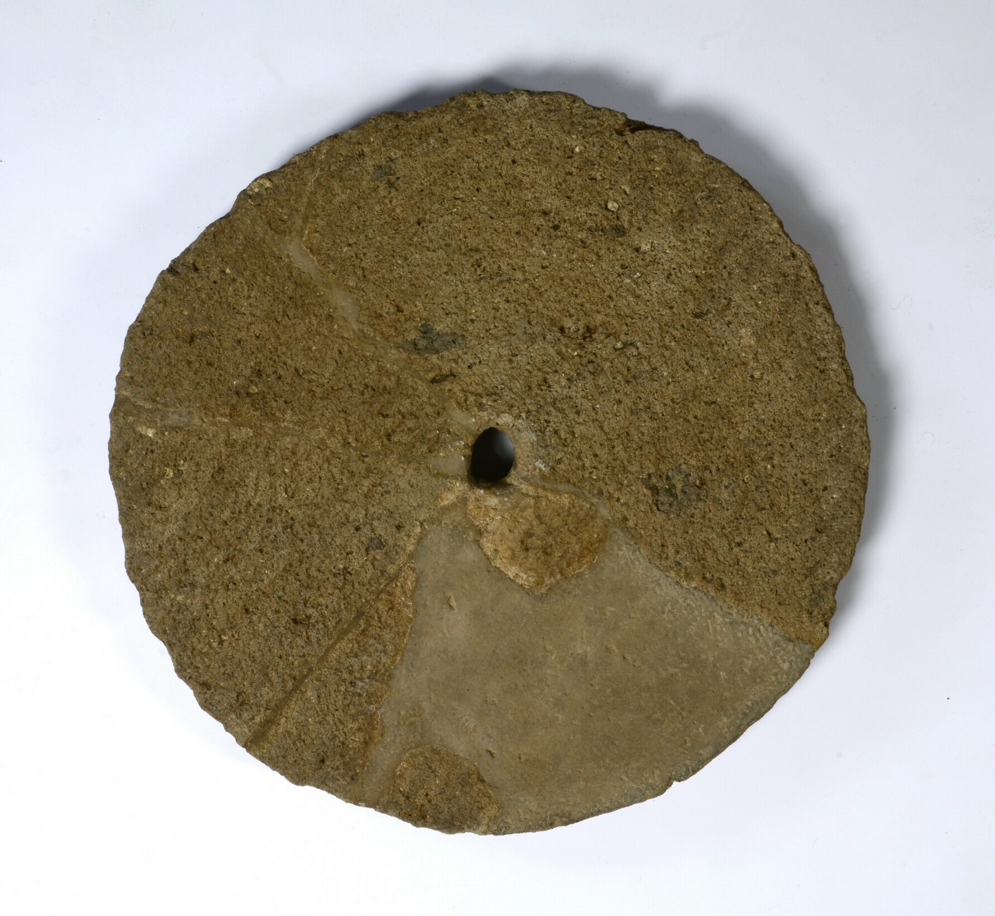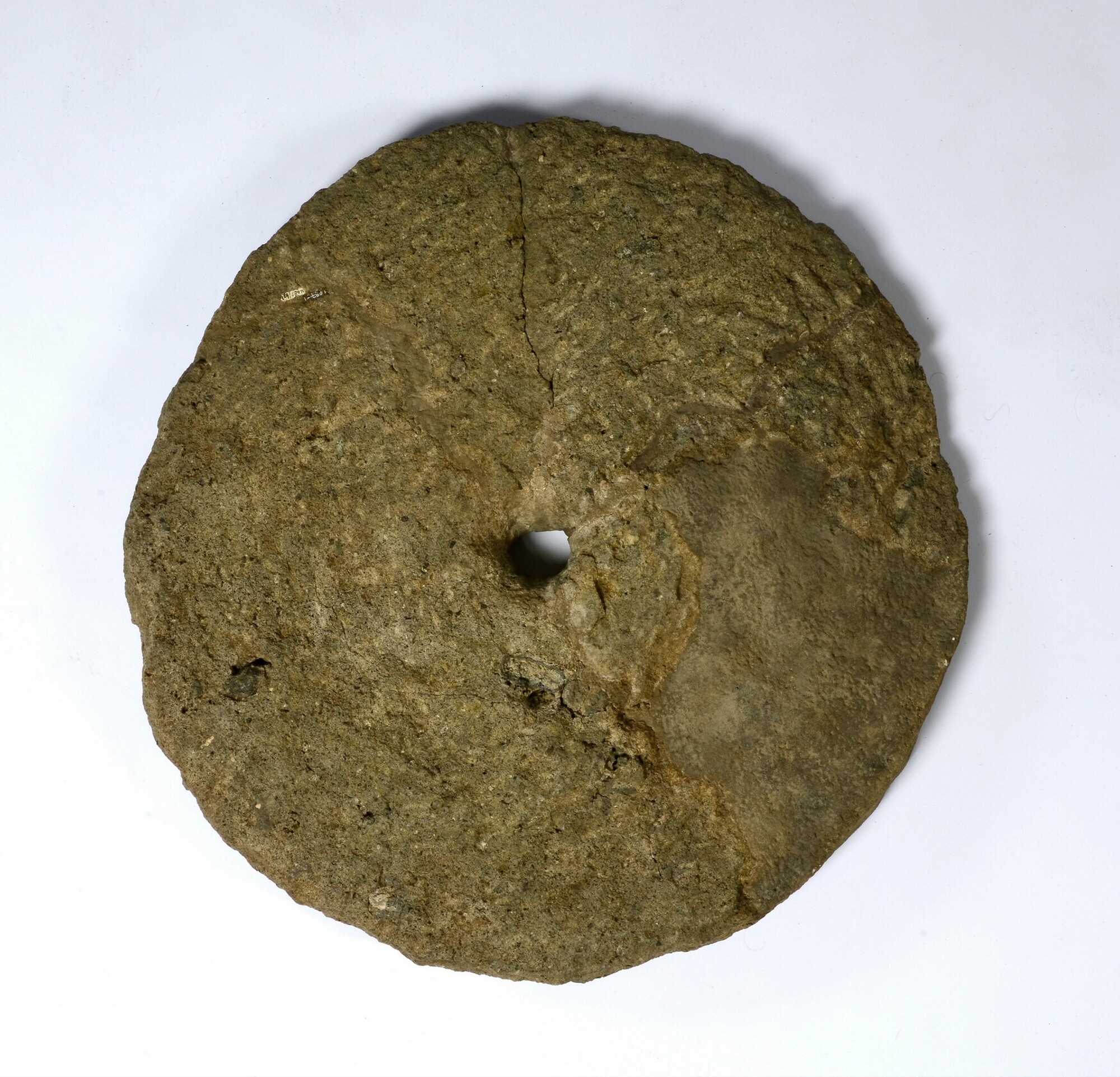 Maalsteen; loper; herkomst: Eifelgebied, Rheinland-Pfalz (?); gewicht: 14.6 kg; diameter gat: 4.0