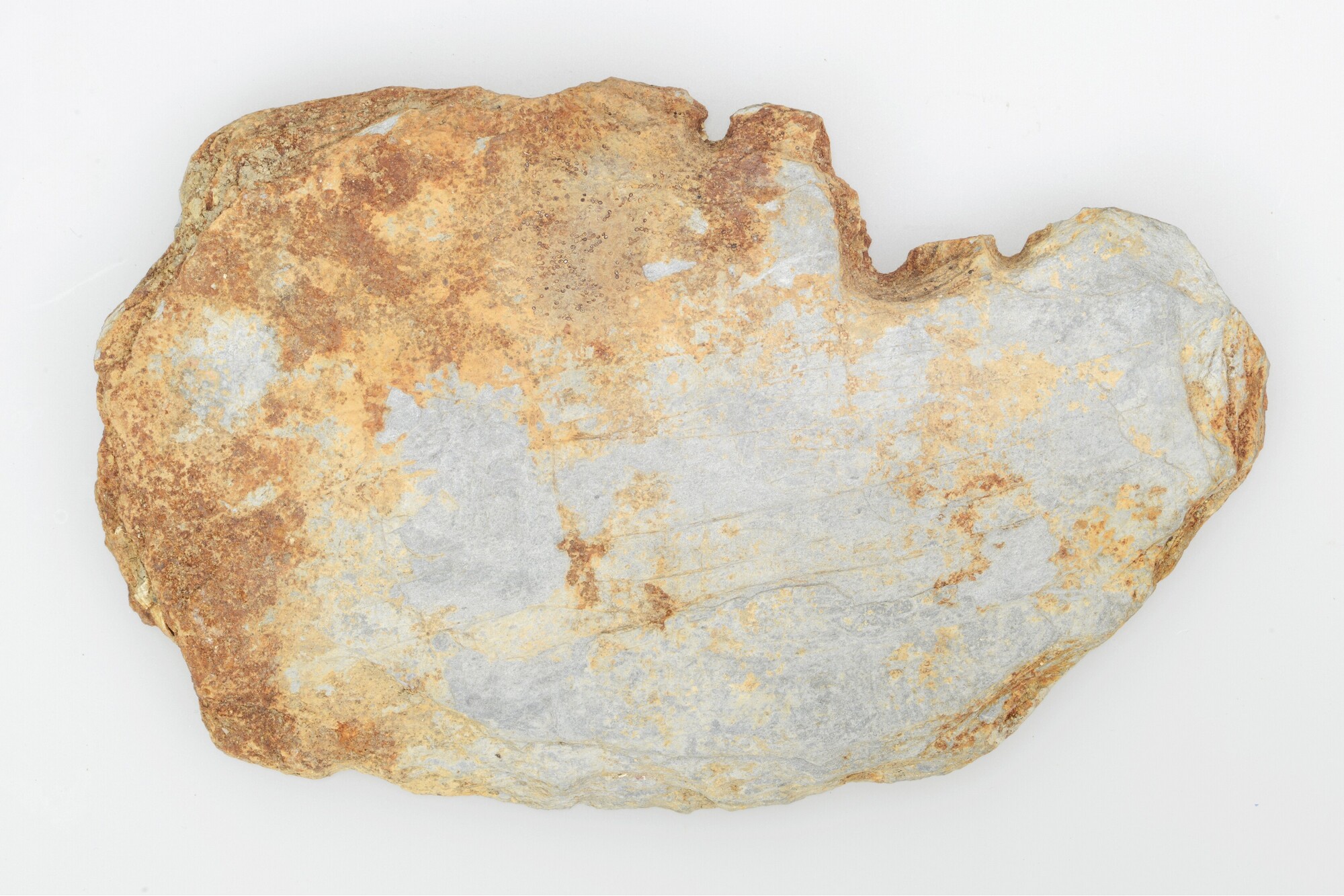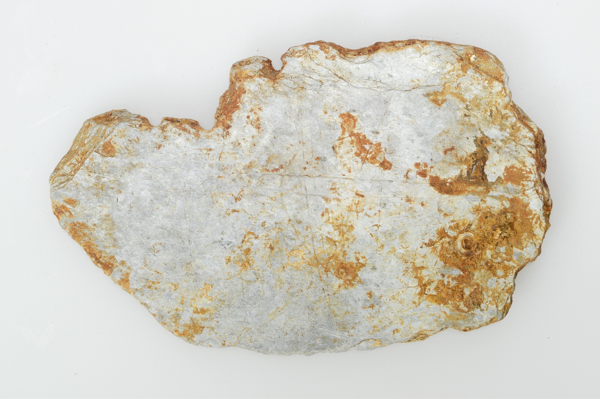 Daklei; drie nagelgaten; secundair gebruikt als snijplank; snijsporen op voor- en keerzijde