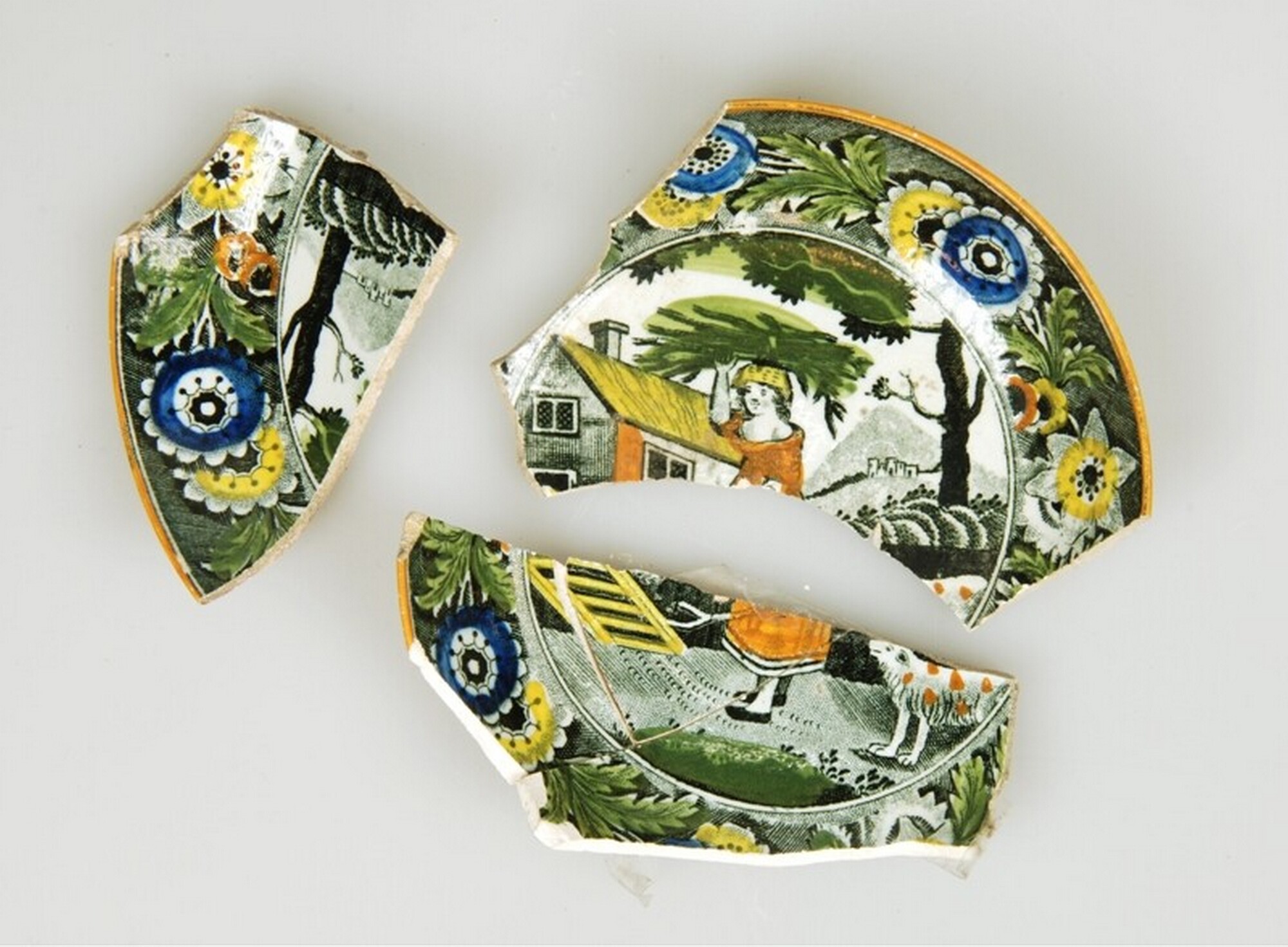 Schotel; iw-bor-3; afgerond bord zonder vlag, standring; industrieel wit aardewerk (pearlware / transferware); onderglazuur zwart drukdecor met polycrome beschilderding: dame met takkenbos en hond in ruraal landschap; herkomst: Engeland