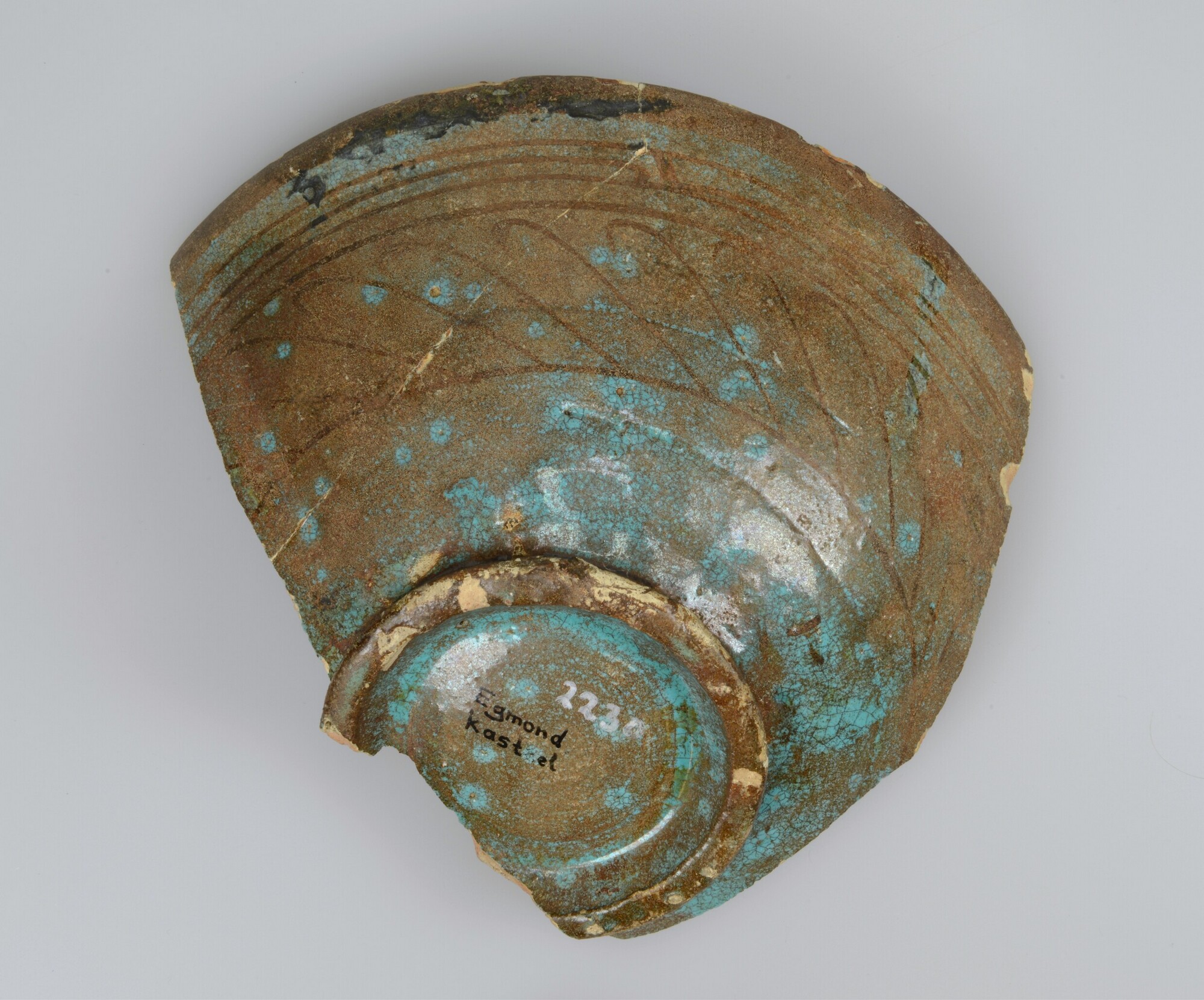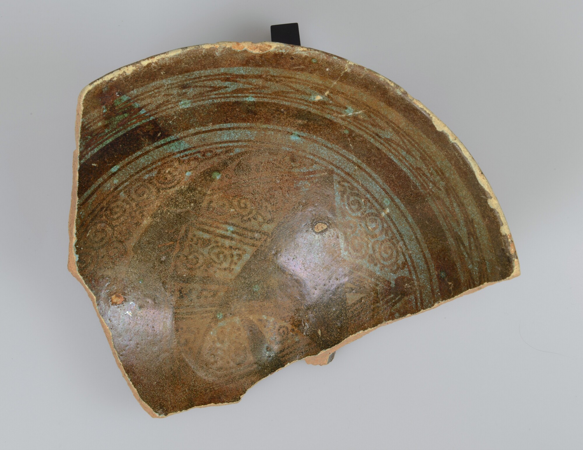 Kom; sp-kom-3; bolle kom met rechte rand, standring; Spaans tinglazuuraardewerk (goudlustermajolica); geometrische motieven in goudluster; herkomst Spanje