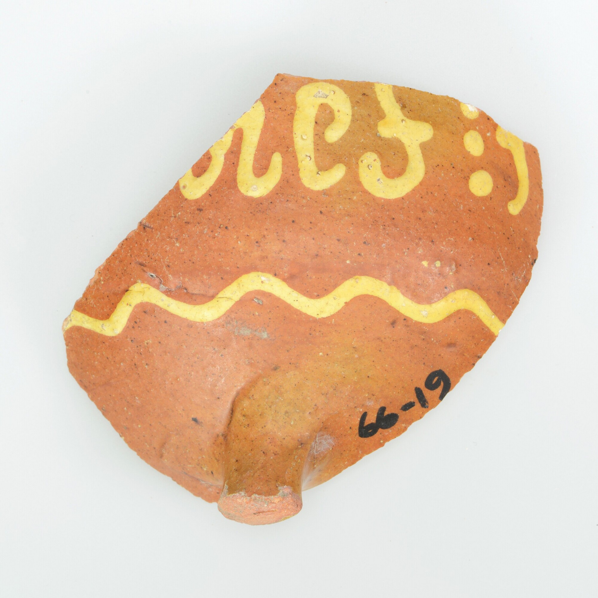 Grape; r-gra-87; fragment van buik en bodem; grape met hoge afgeronde buikknik en S-vormig gebogen hals en rand; ringeloorversiering en tekst: LIEF; herkomst: Alkmaar