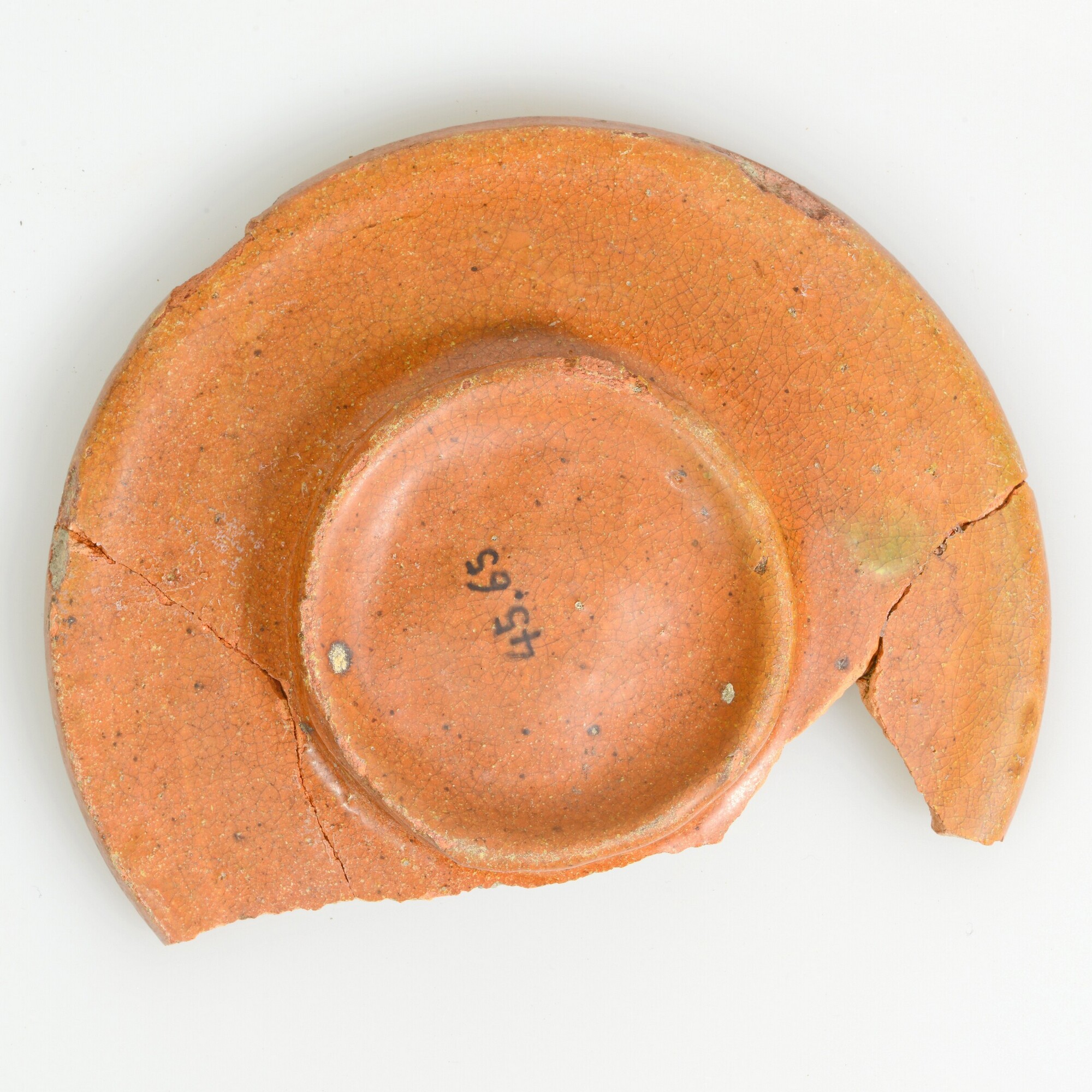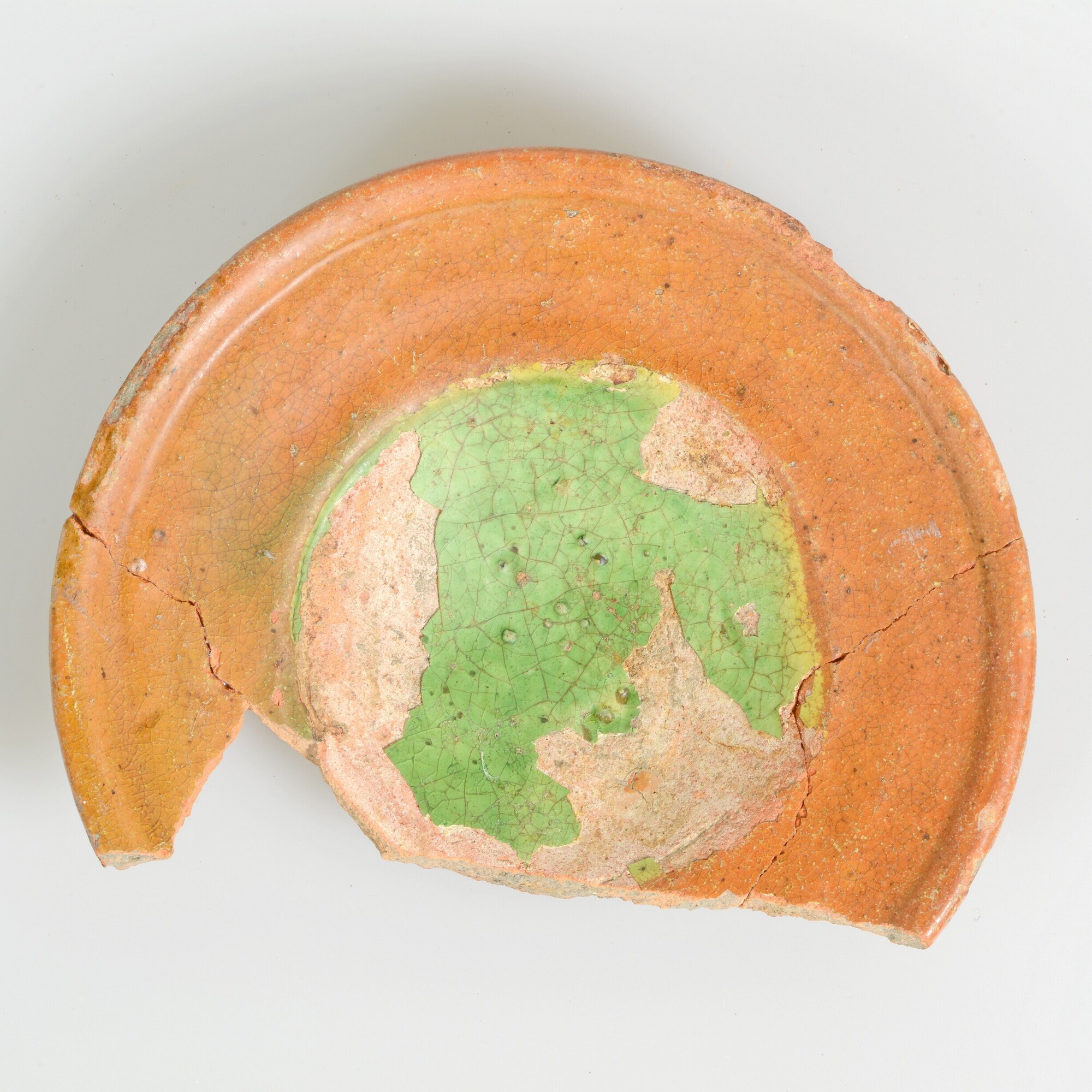 Bord; r-bor-9; afgerond bord, smalle vlag met verdikte lip; spiegel: witte sliblaag met loodglazuur met koperoxide; standring; herkomst: Oosterhout of Gouda