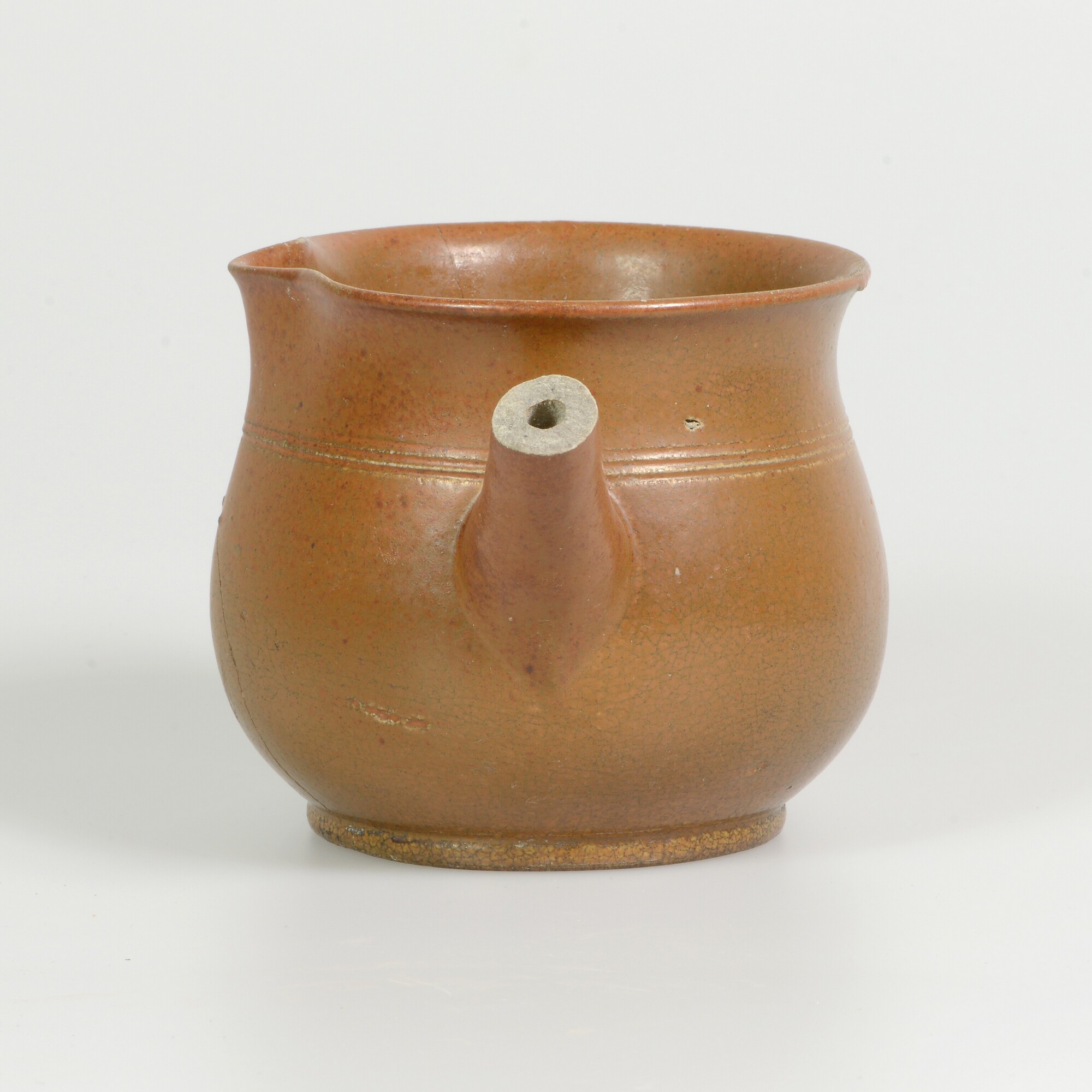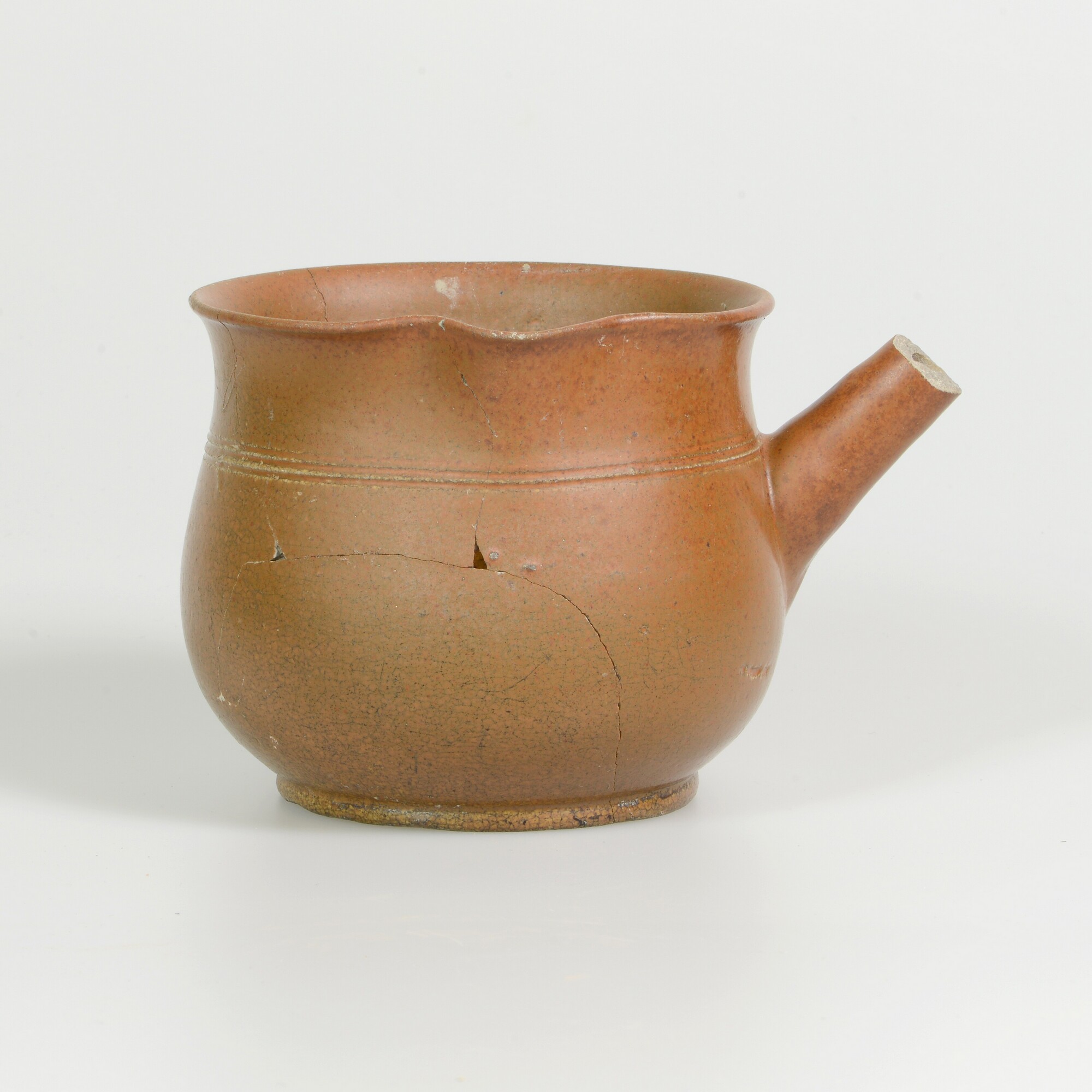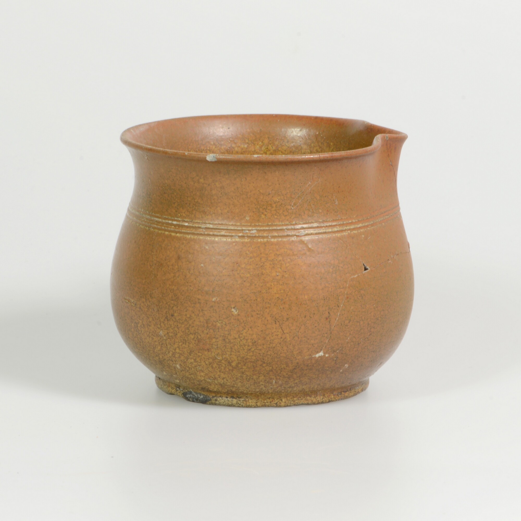 Kom; s3-kom-3; bolle kom met uitstaande rand; schenklip; standvlak; holle ronde steel met knop (uiteinde ontbreekt); herkomst: Engeland