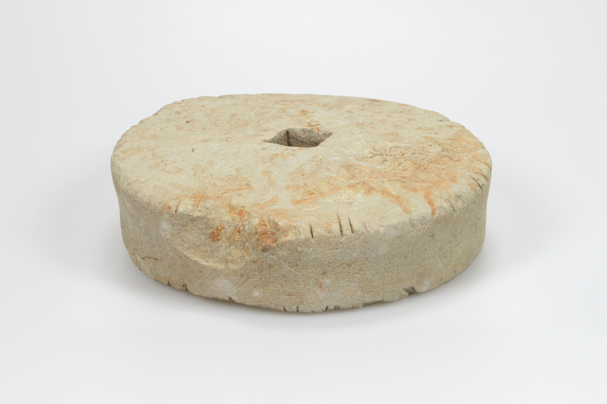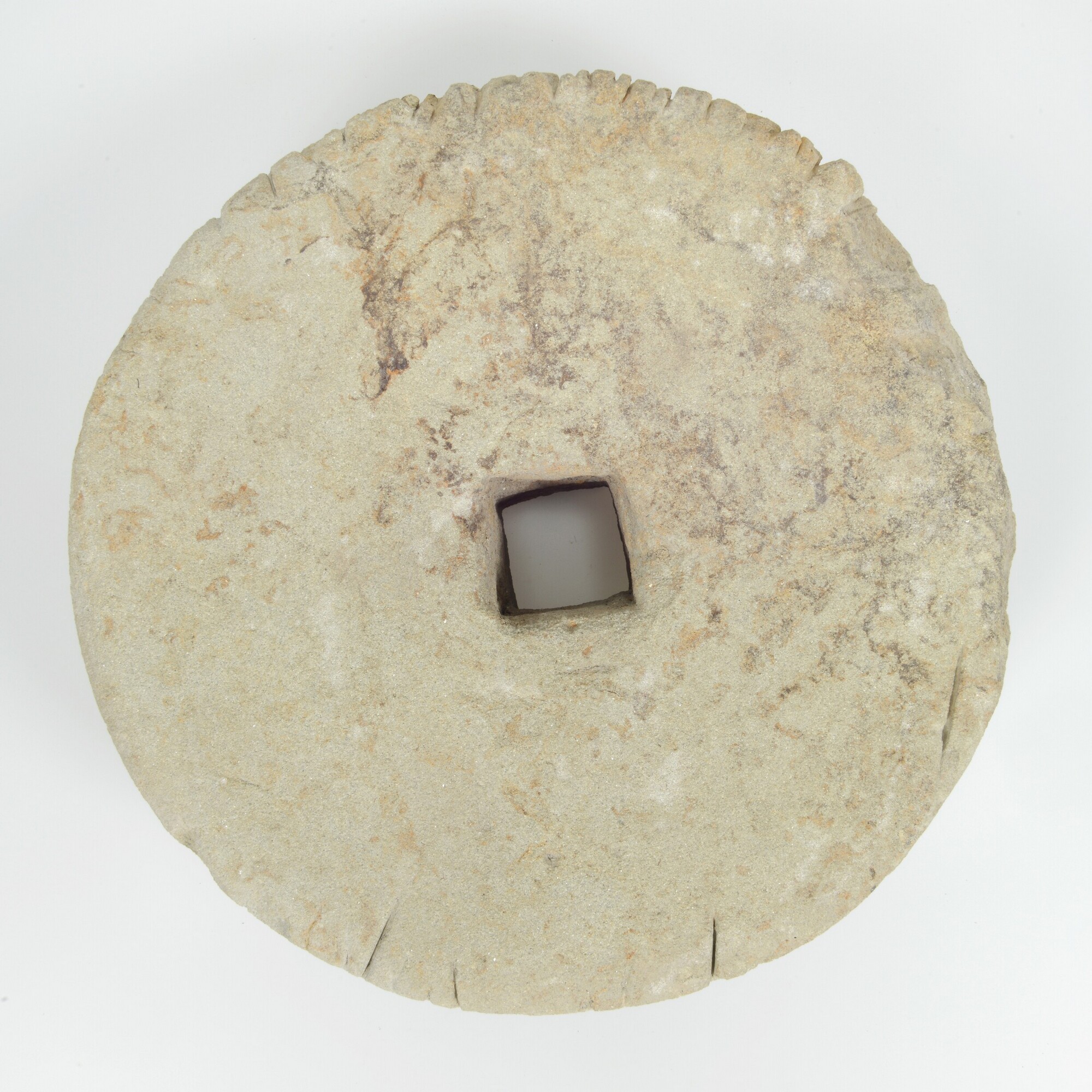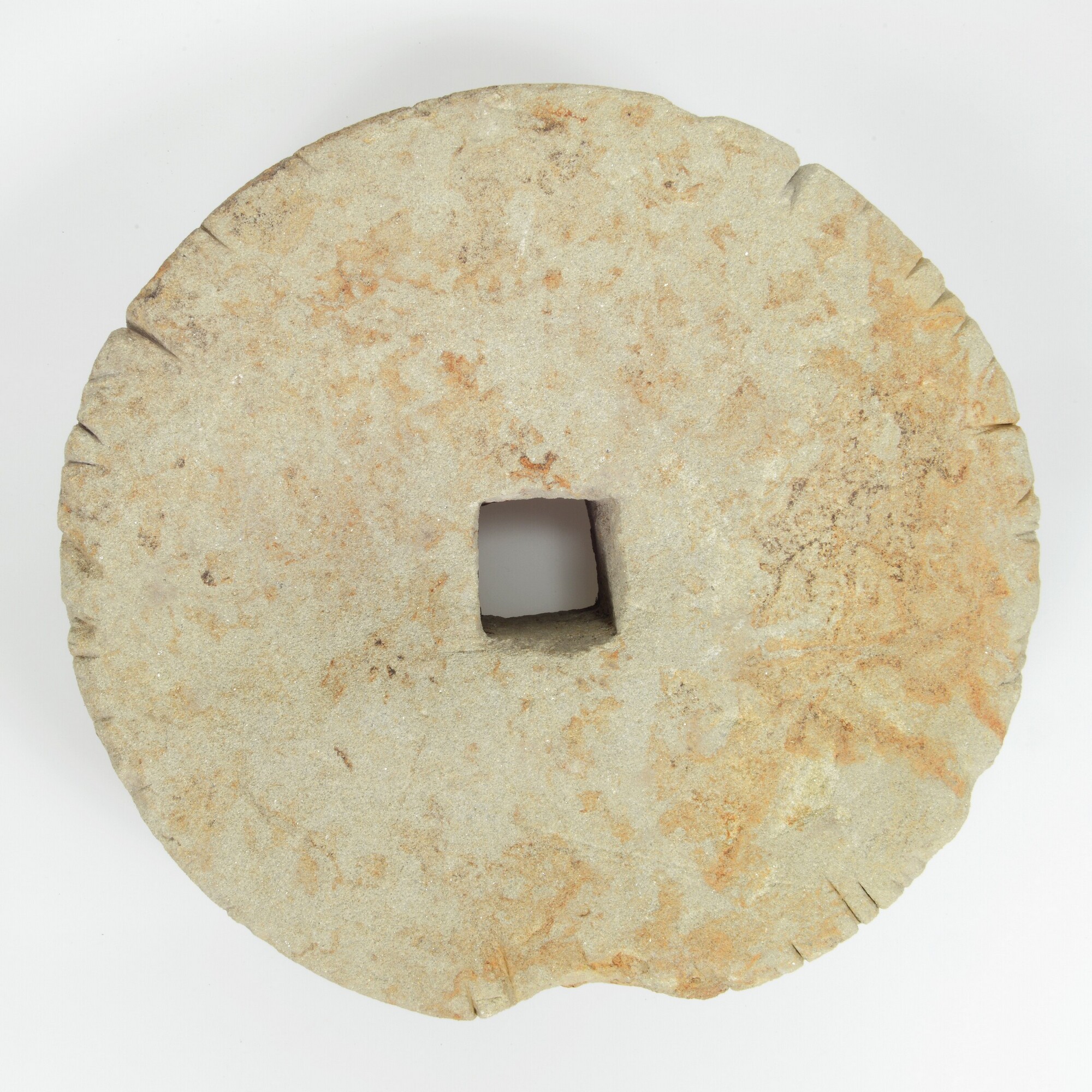 Sllijpsteen; rond; vierkant asgat; slijpkrassen langs de randen (hergebruikt als niet roterende slijpsteen); gewicht: 8,6kg