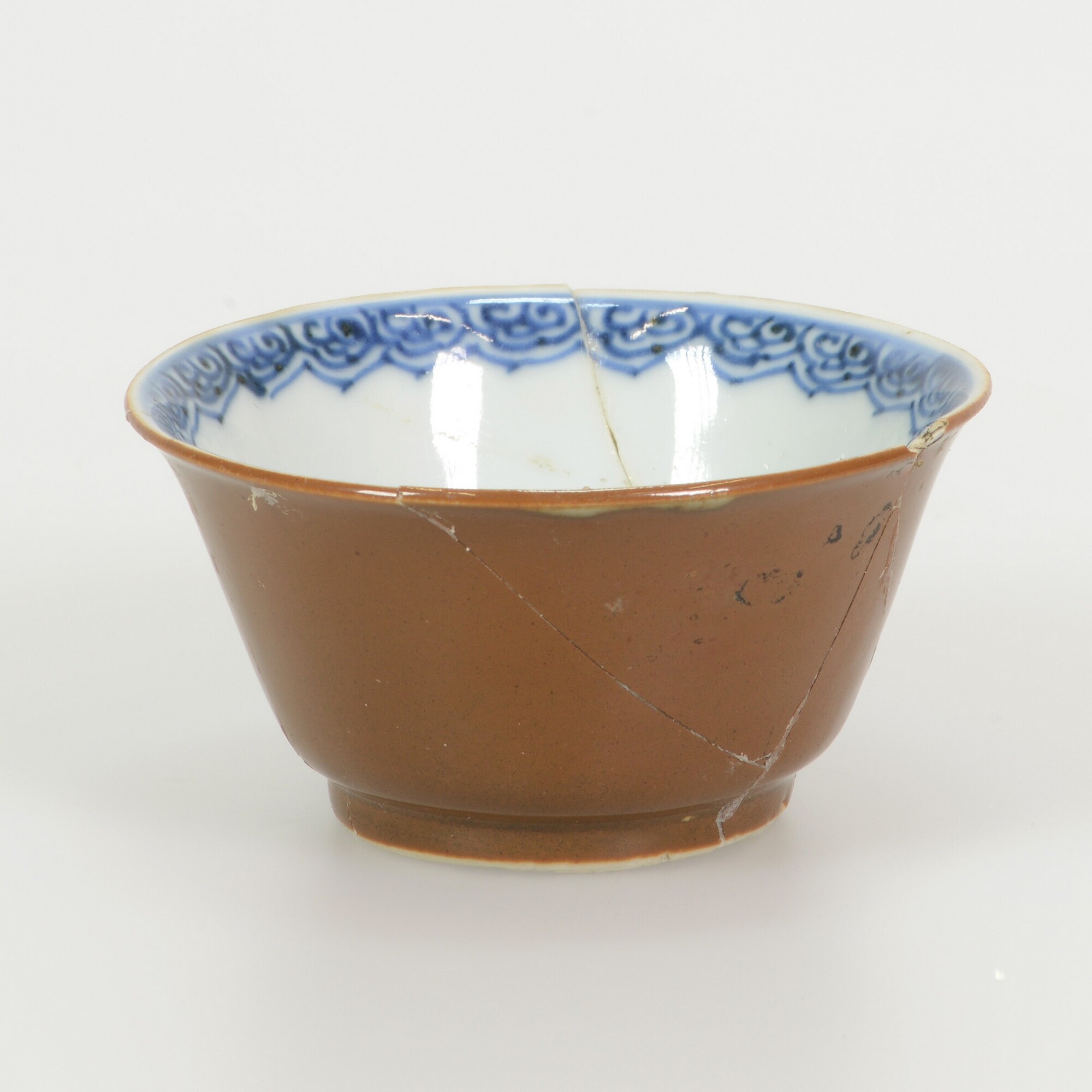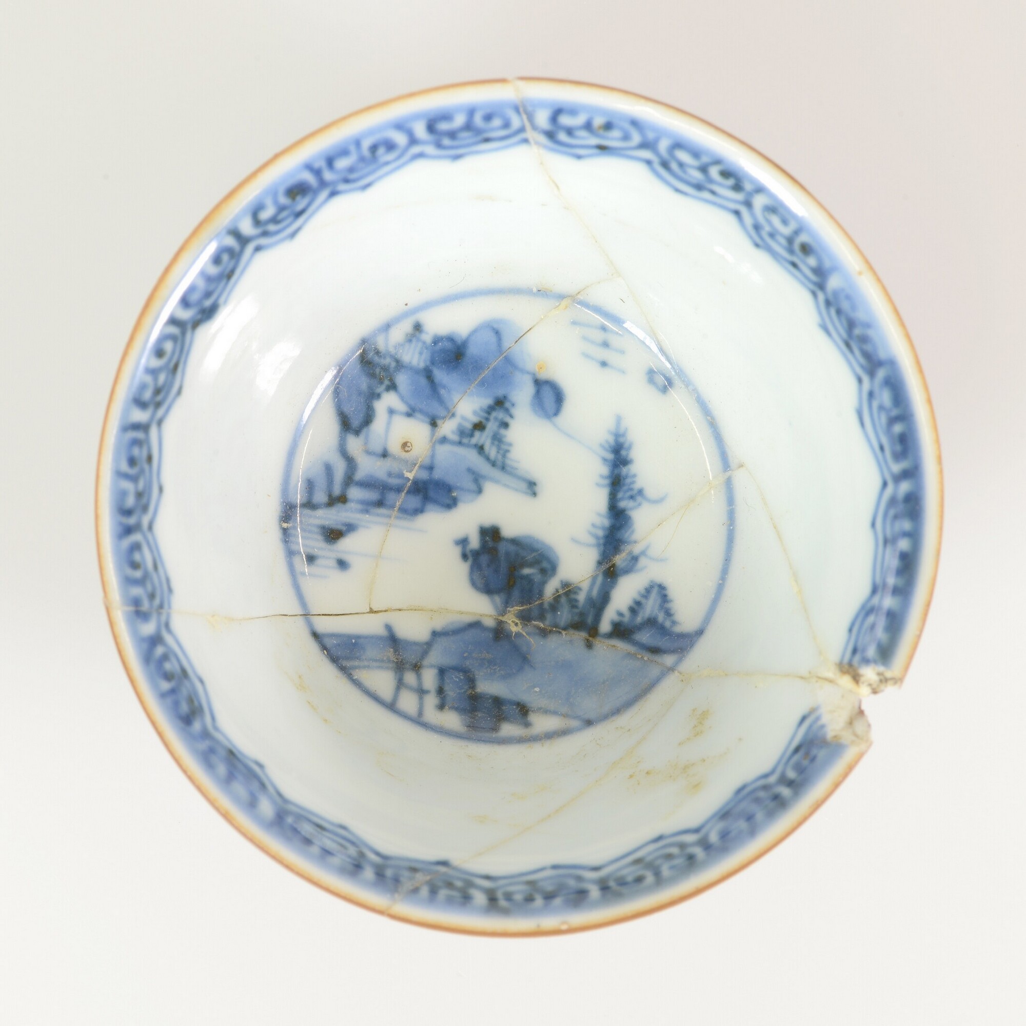 Kop; p-kop-1; kop met iets uitgebogen rand, standring; porselein; veldspaatglazuur; uitwendig kapucijnergoed; inwendig blauwe beschildering: landschap en sierrand; herkomst: China