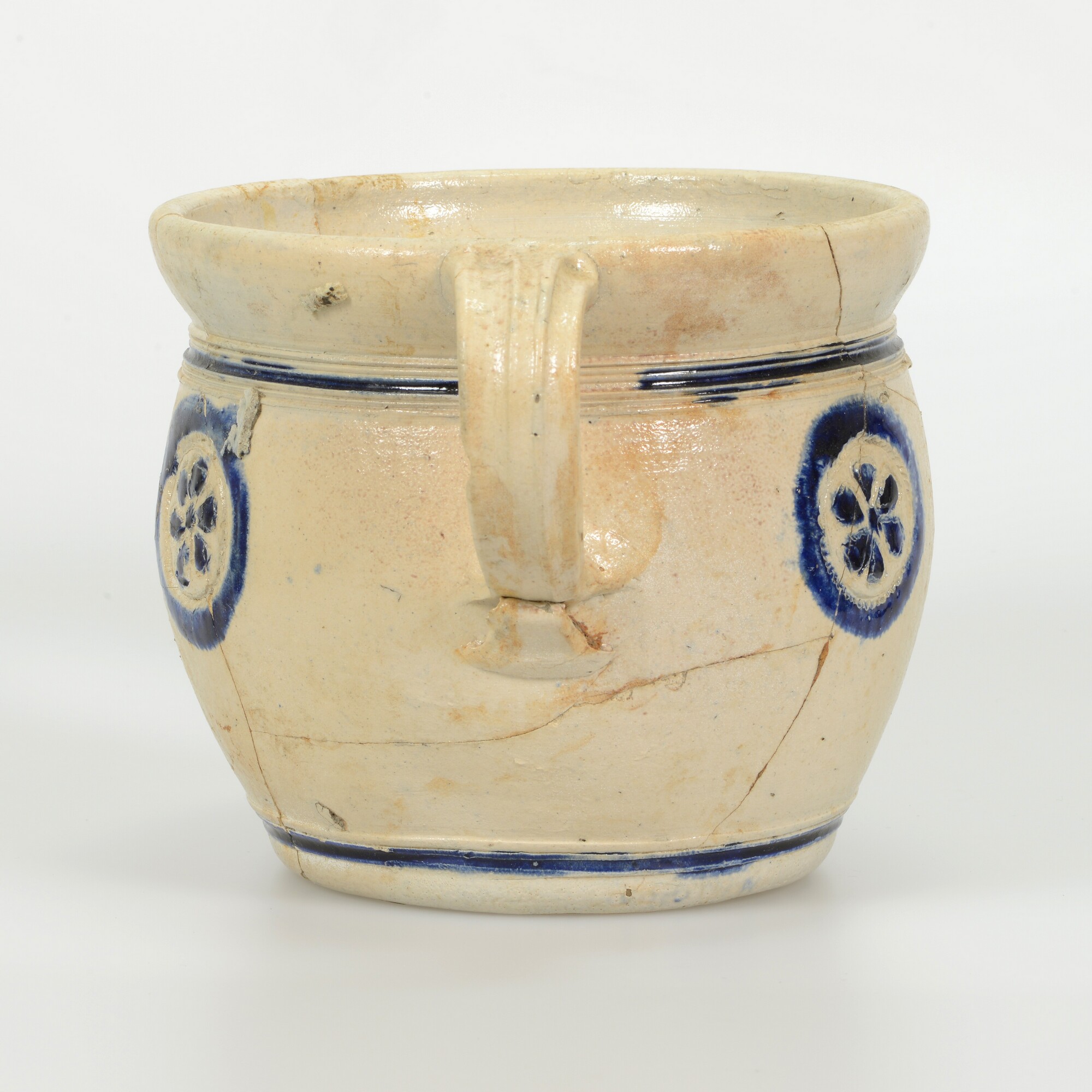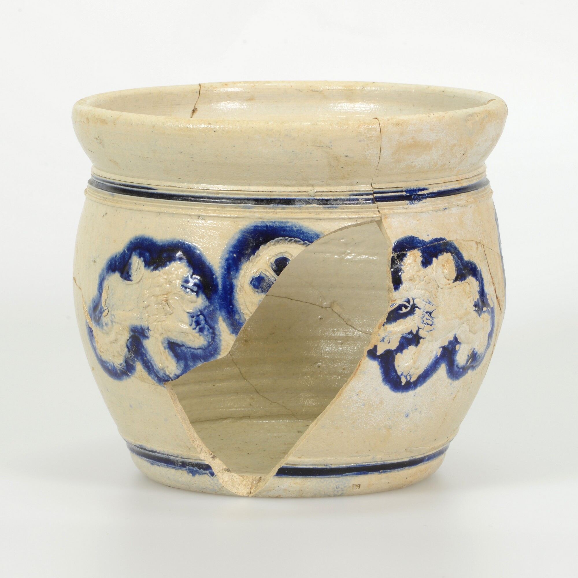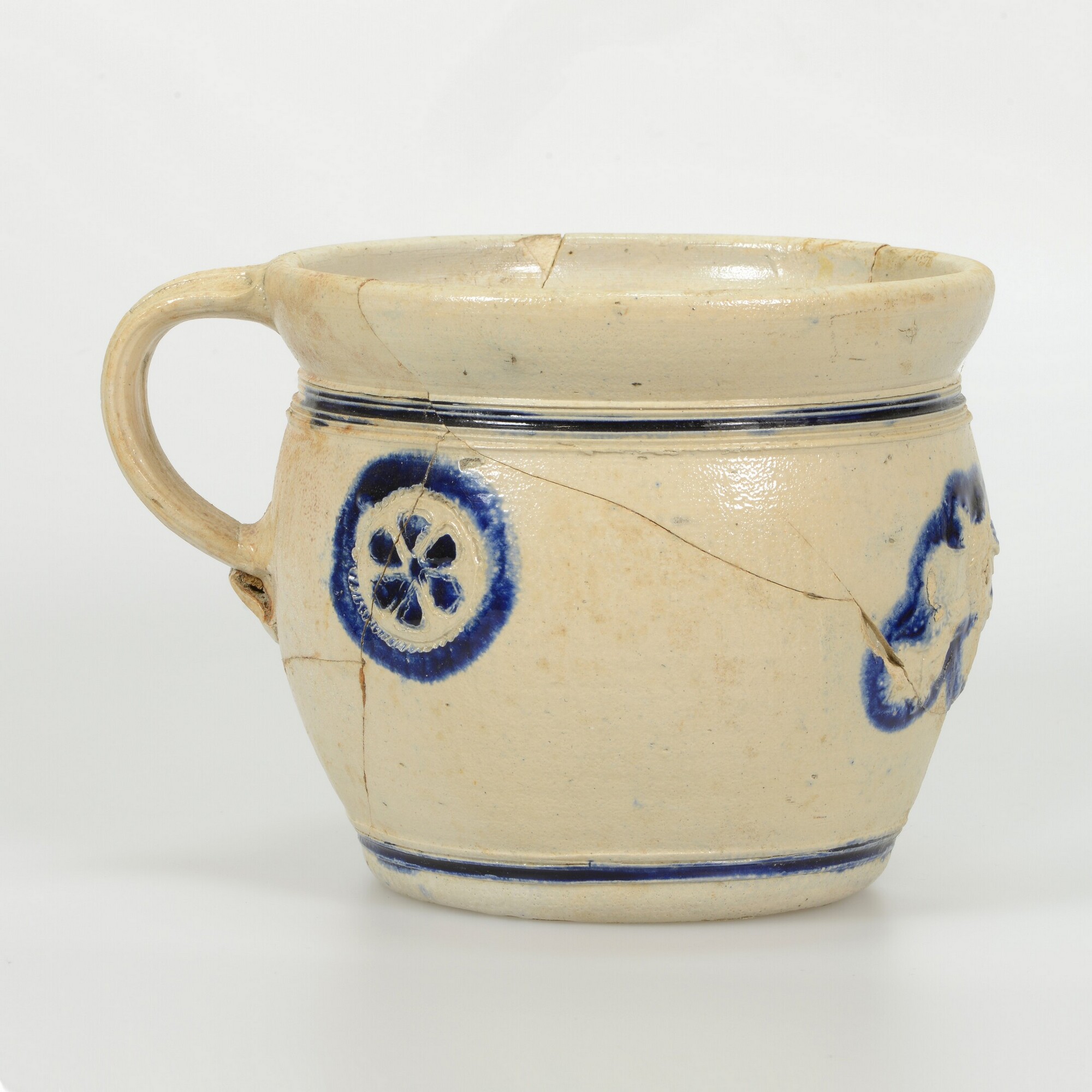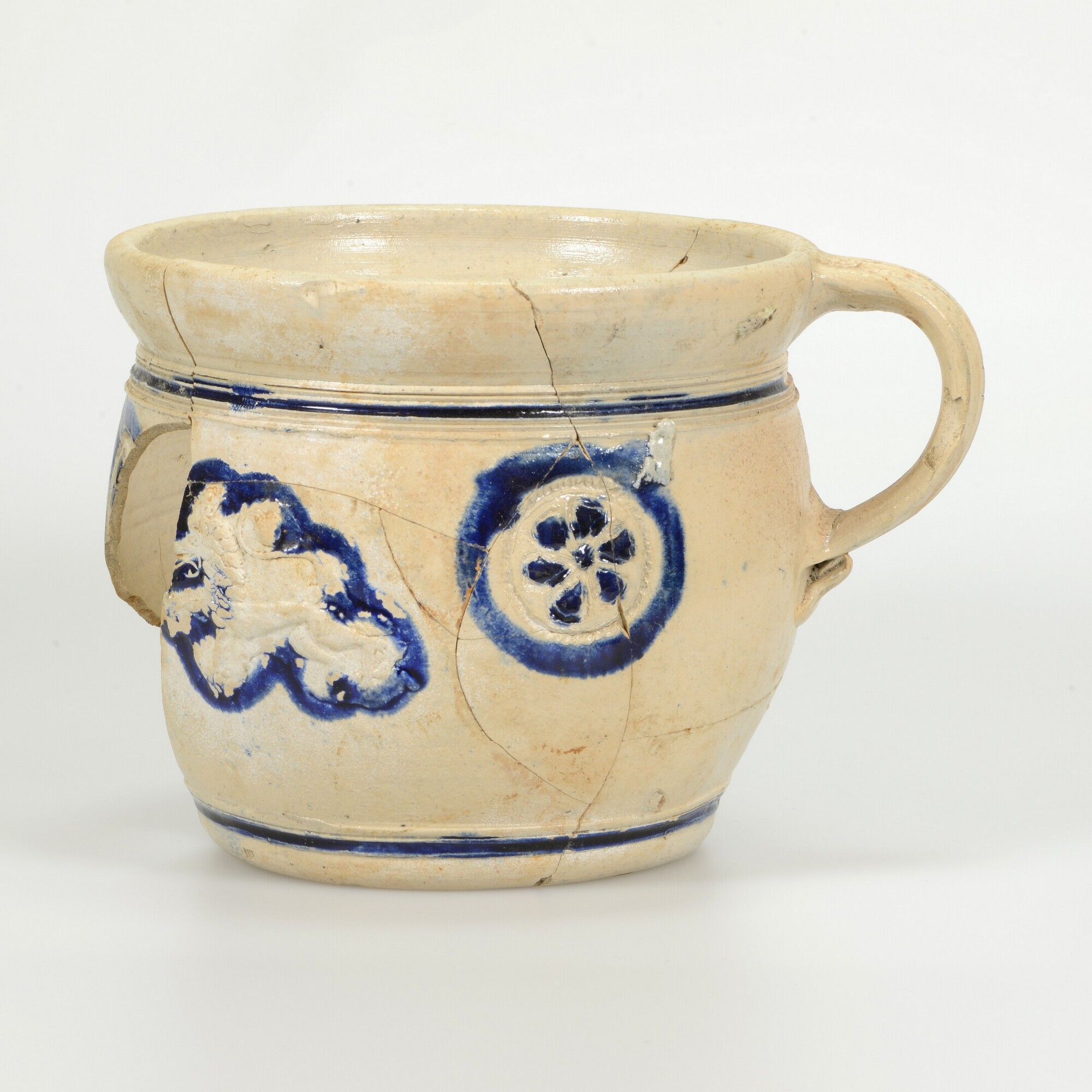 Pispot; s2-pis-2; tonvormige pispot met naar buiten geknikte rand met dekselgeul, standvlak, een lintoor; steengoed, zoutglazuur met kobaltoxide; drie ingesneden rozetten, waarvan de middelste wordt geflankeerd door twee gekroonde leeuwen; herkomst: Westerwald
