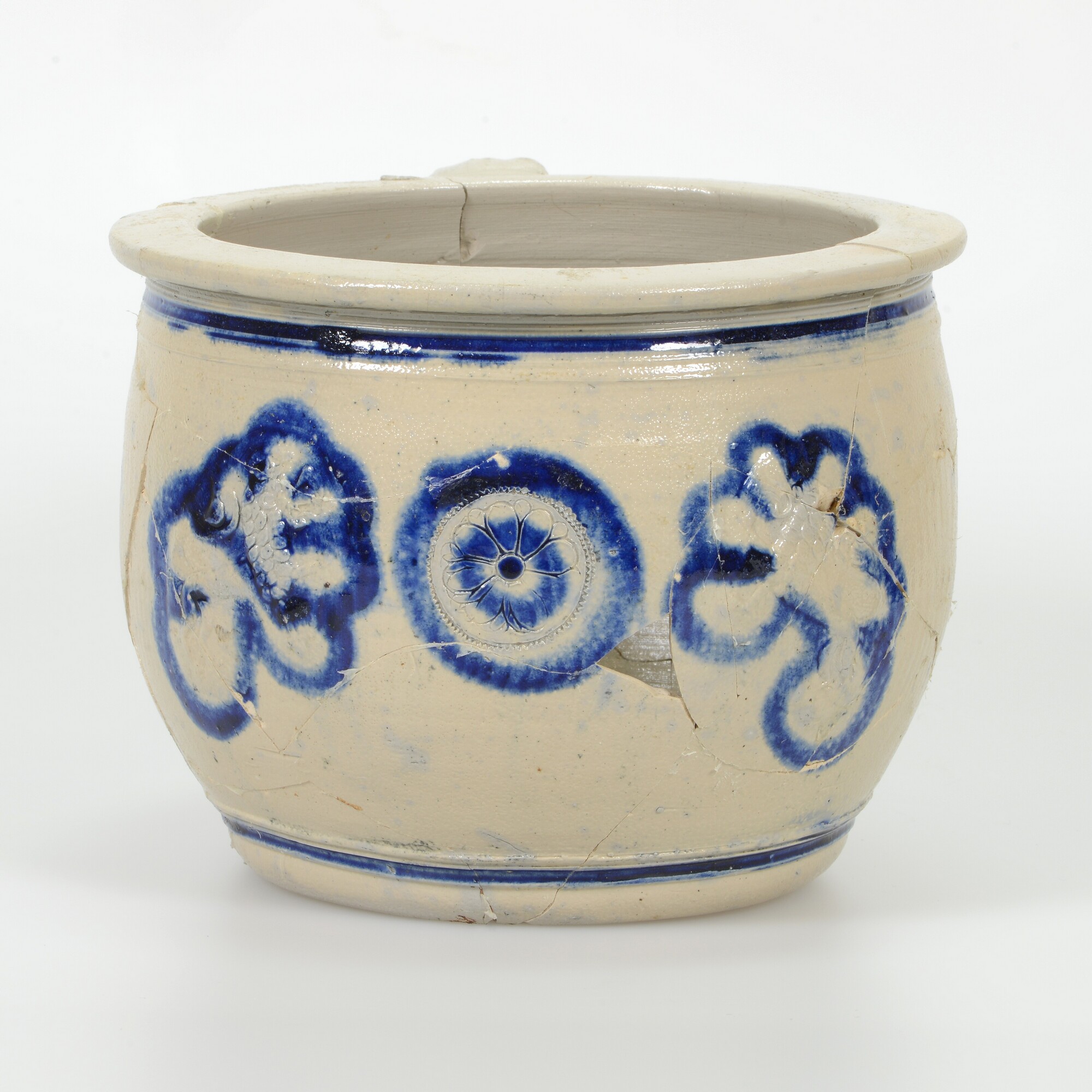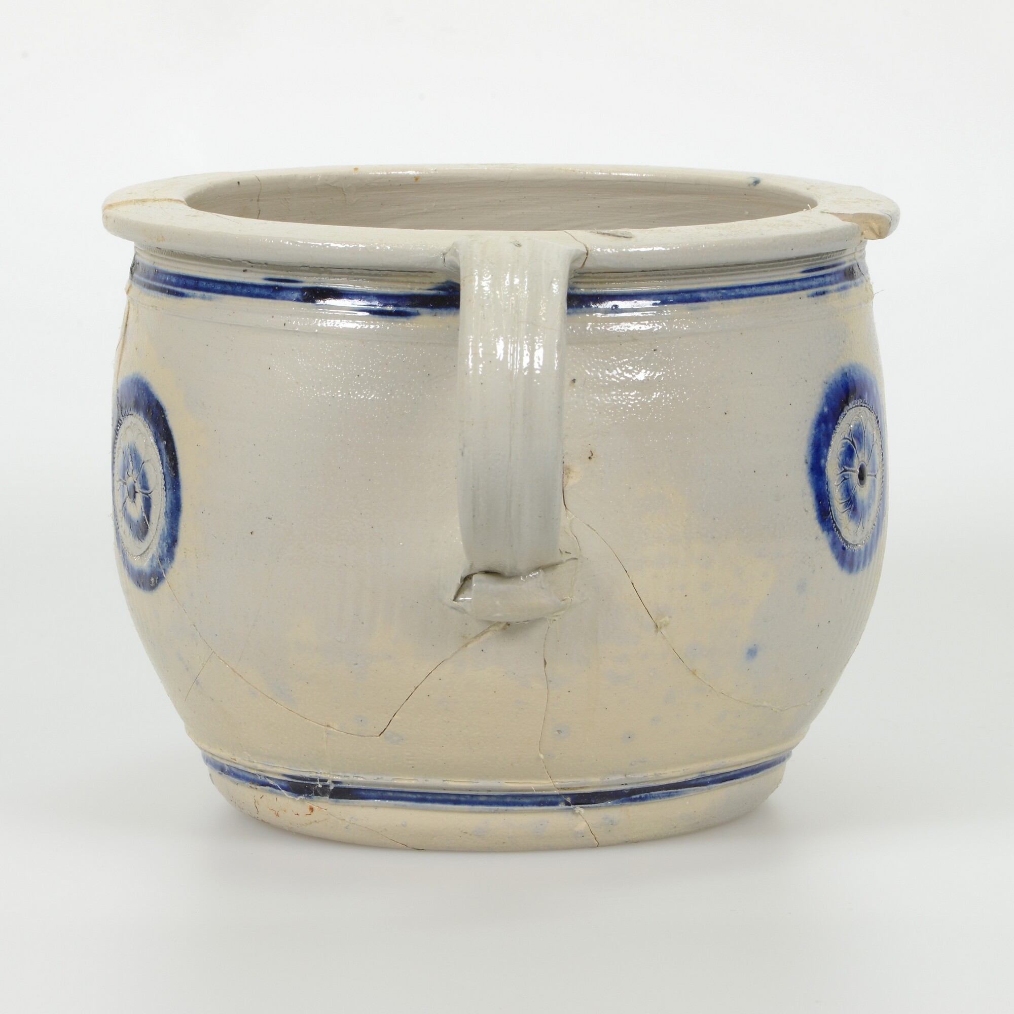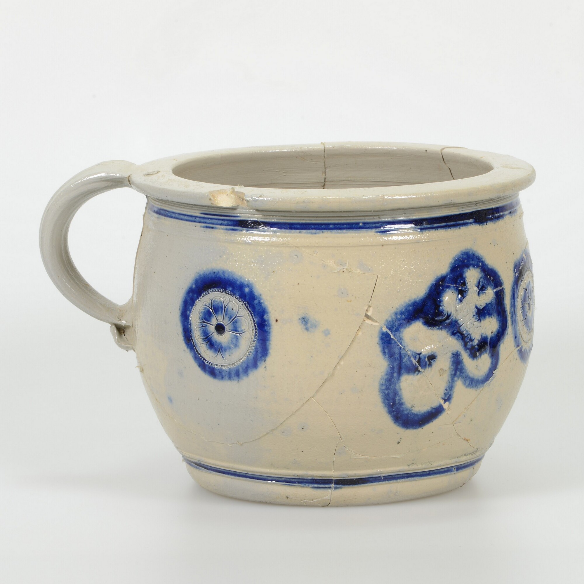 Pispot; s2-pis-3; tonvormige pispot met kraagrand, standvlak, een lintoor; steengoed, zoutglazuur met kobaltoxide; drie ingesneden rozetten, waarvan de middelste wordt geflankeerd door twee gekroonde leeuwen; herkomst: Westerwald