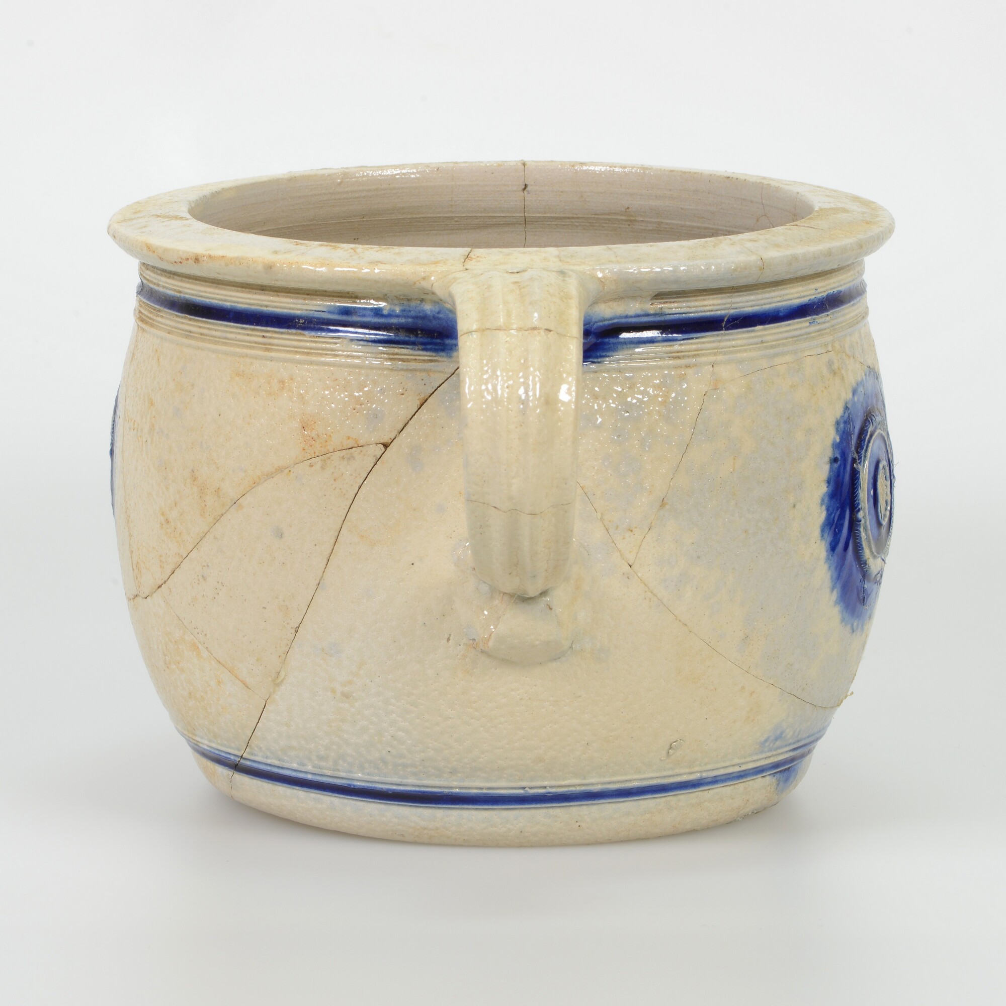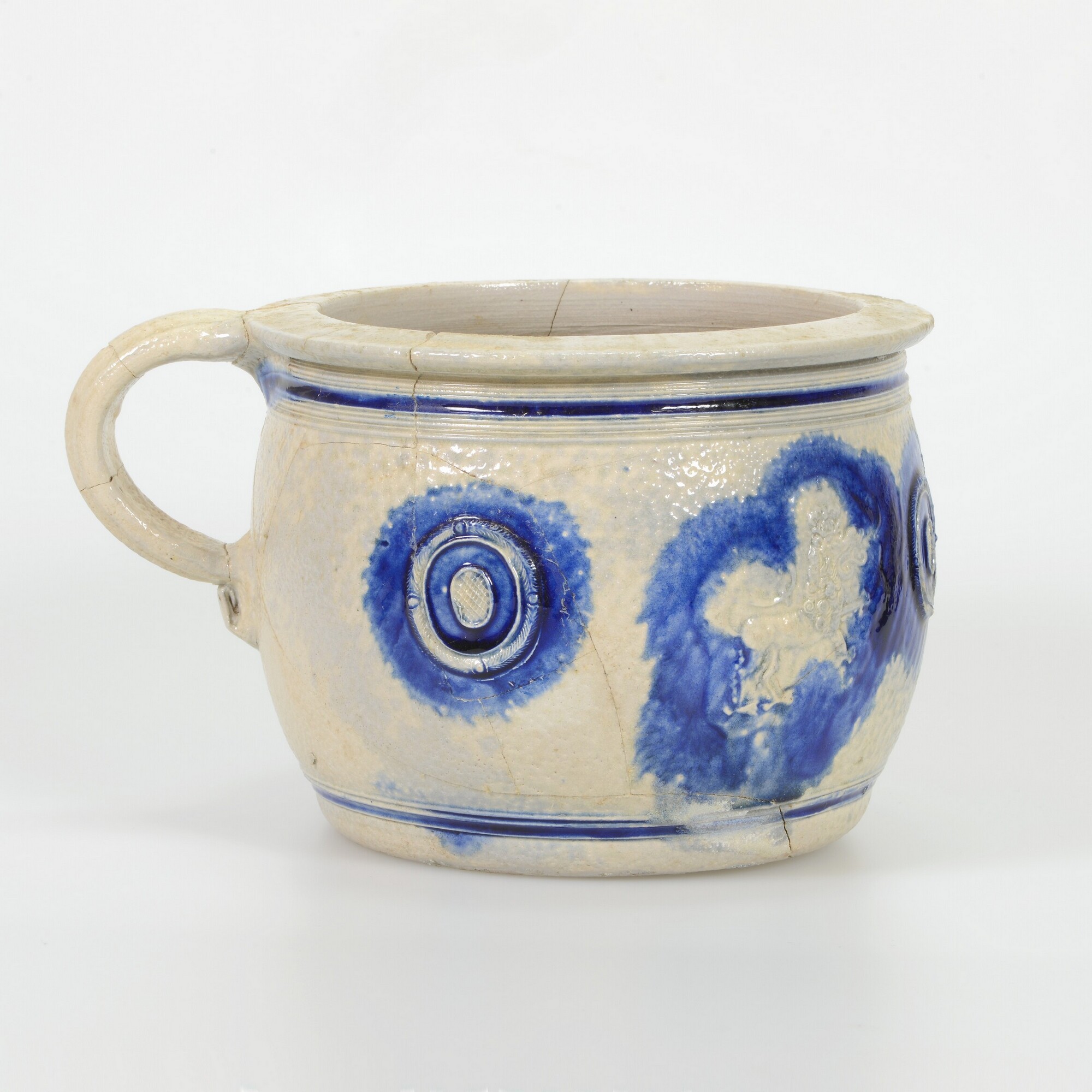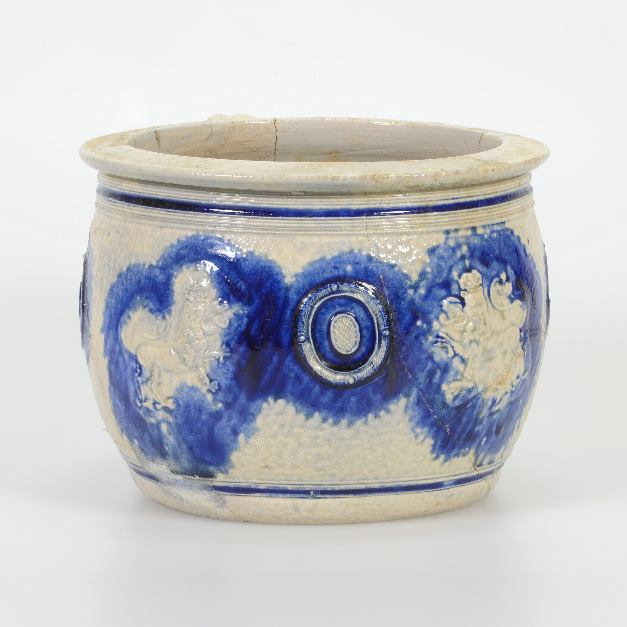 Pispot; s2-pis-3; tonvormige pispot met kraagrand, standvlak, een lintoor; steengoed, zoutglazuur met kobaltoxide; drie ovale appliques, waarvan de middelste wordt geflankeerd door twee gekroonde leeuwen; herkomst: Westerwald
