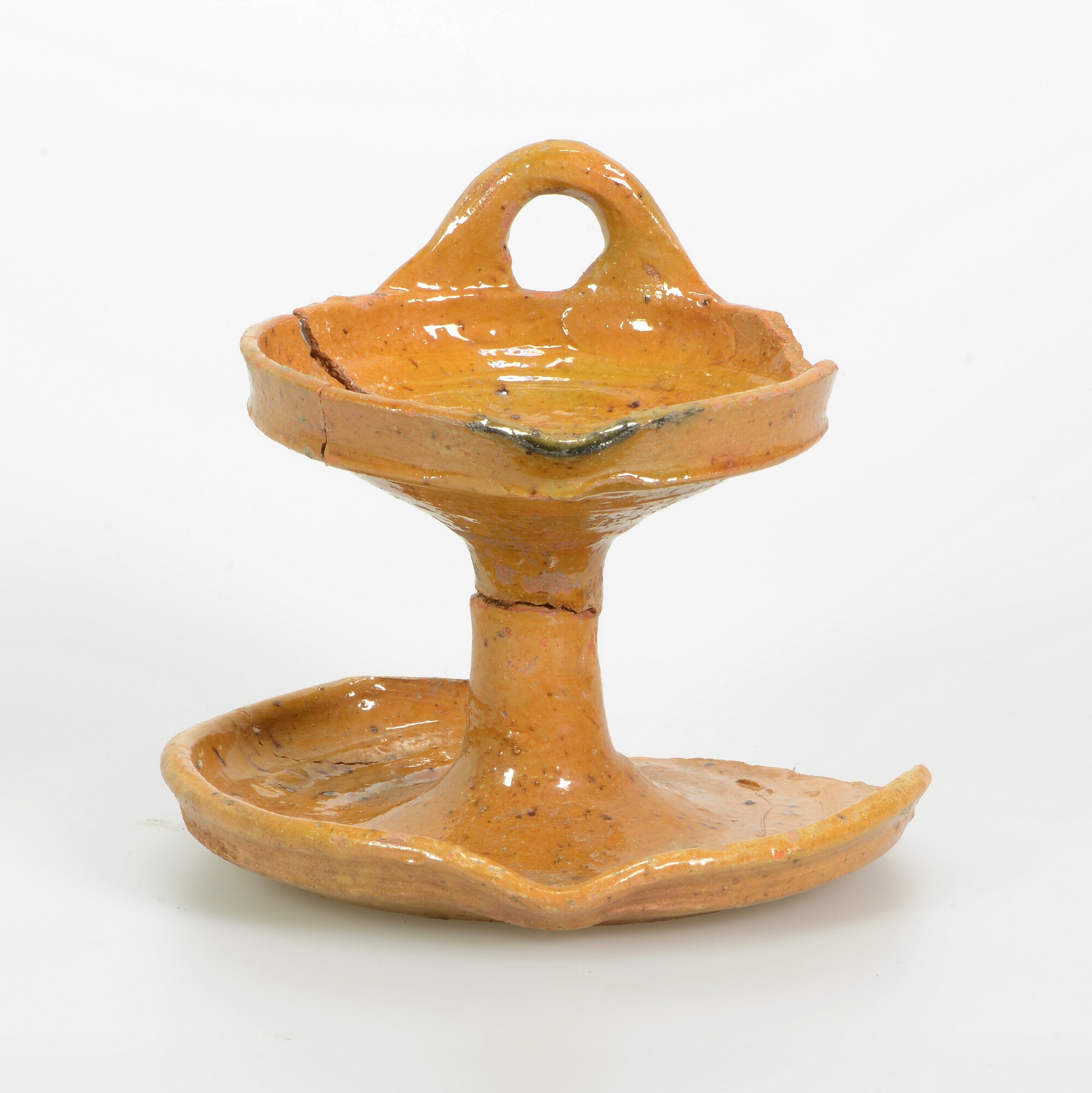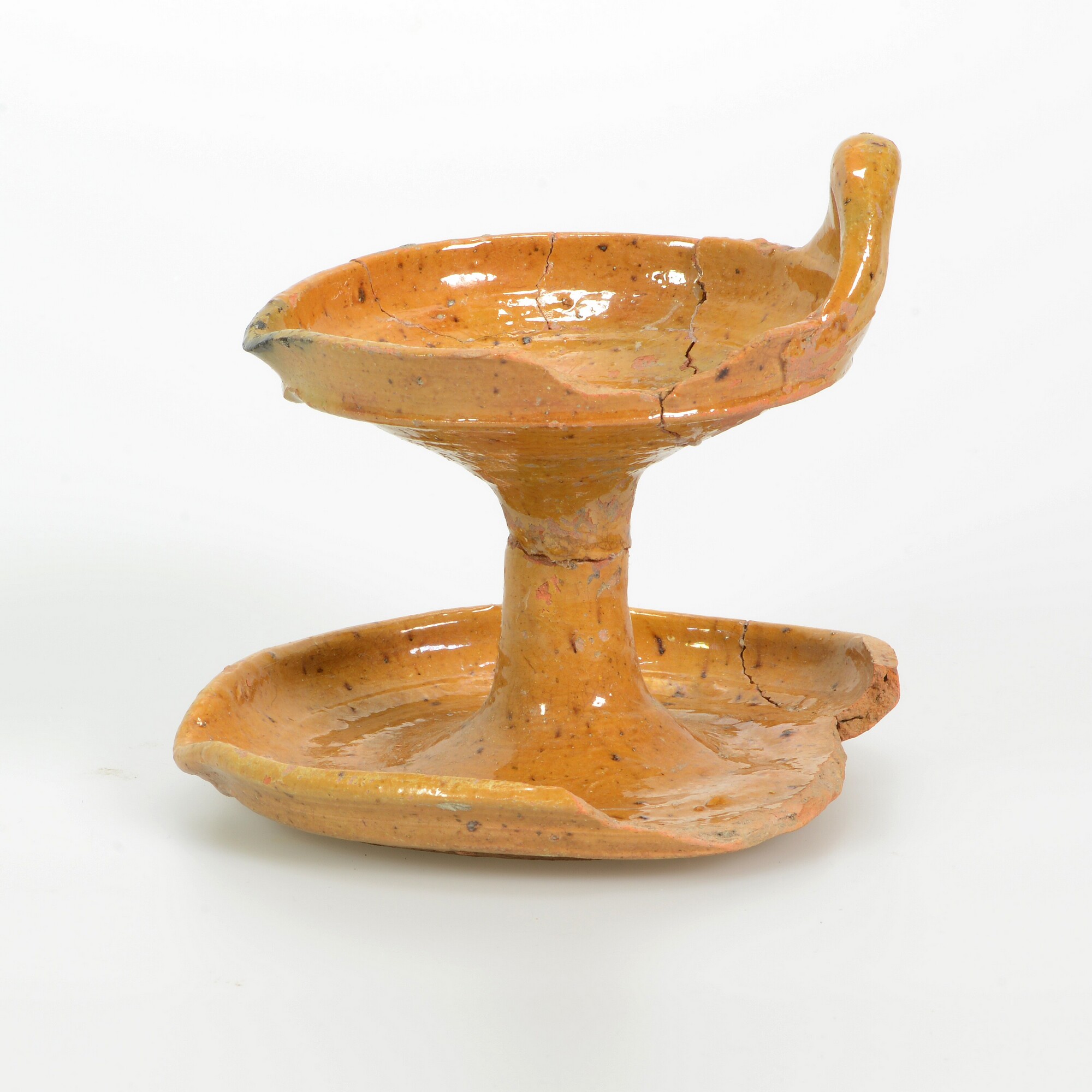 Olielamp; r-oli-2; olielamp met twee schalen en stam, een worstoor, lekschaal afgeplat, geknikte rand; roodbakkend aardewerk; in- en uitwendig loodglazuur; brandsporen aan de rand van de bovenste schaal