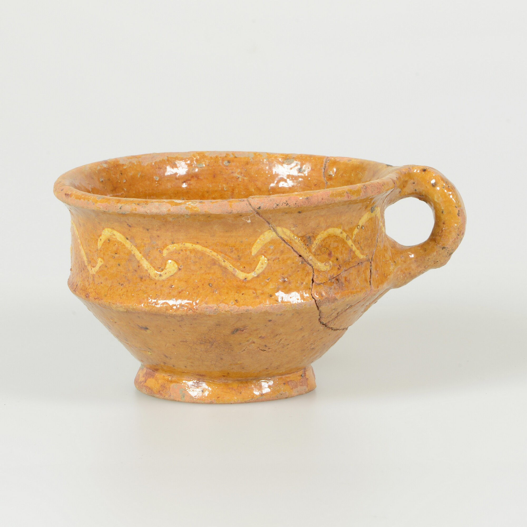 Kop; r-kop-4; kop met scherpe knik bodem-wand, hoge wand, iets uitgebogen rand; roodbakkend aardewerk; in- en uitwendig loodglazuur; standring; één ingeknepen verticaal worstoor; ringeloorboogjes in witte slib op de wand; binnenzijde gemarmerd; herkomst: Friesland