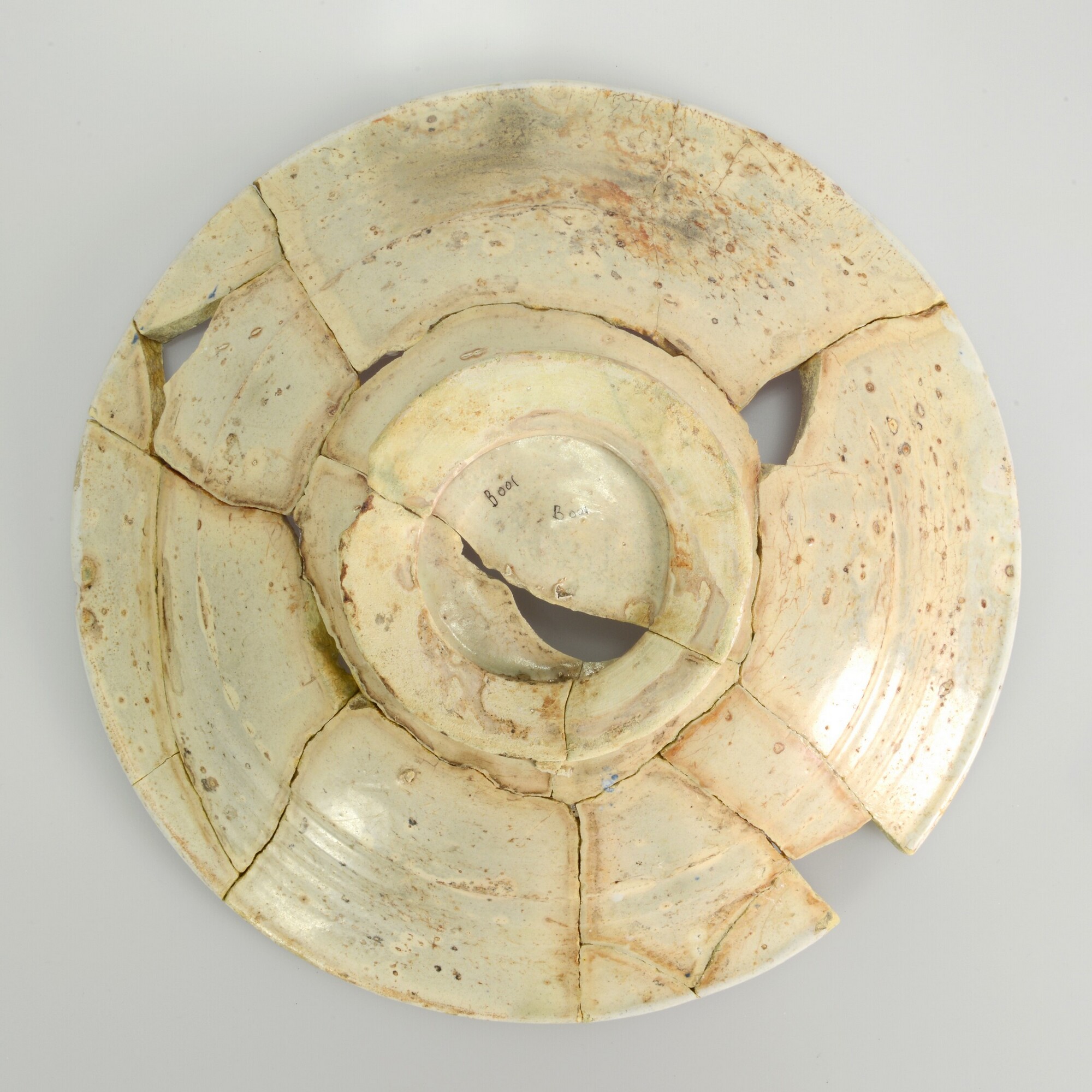 Bord; m-bor-3; bord met vlakke spiegel, knik spiegel-vlag en uitgebogen rand, standring; majolica; inwendig tinglazuur, uitwendig loodglazuur; blauwe beschildering: spiegel: fruitschaal met peren en granaatappels binnen drie concentrische cirkels; vlag: bladmotief en guirlandes; herkomst: Friesland?