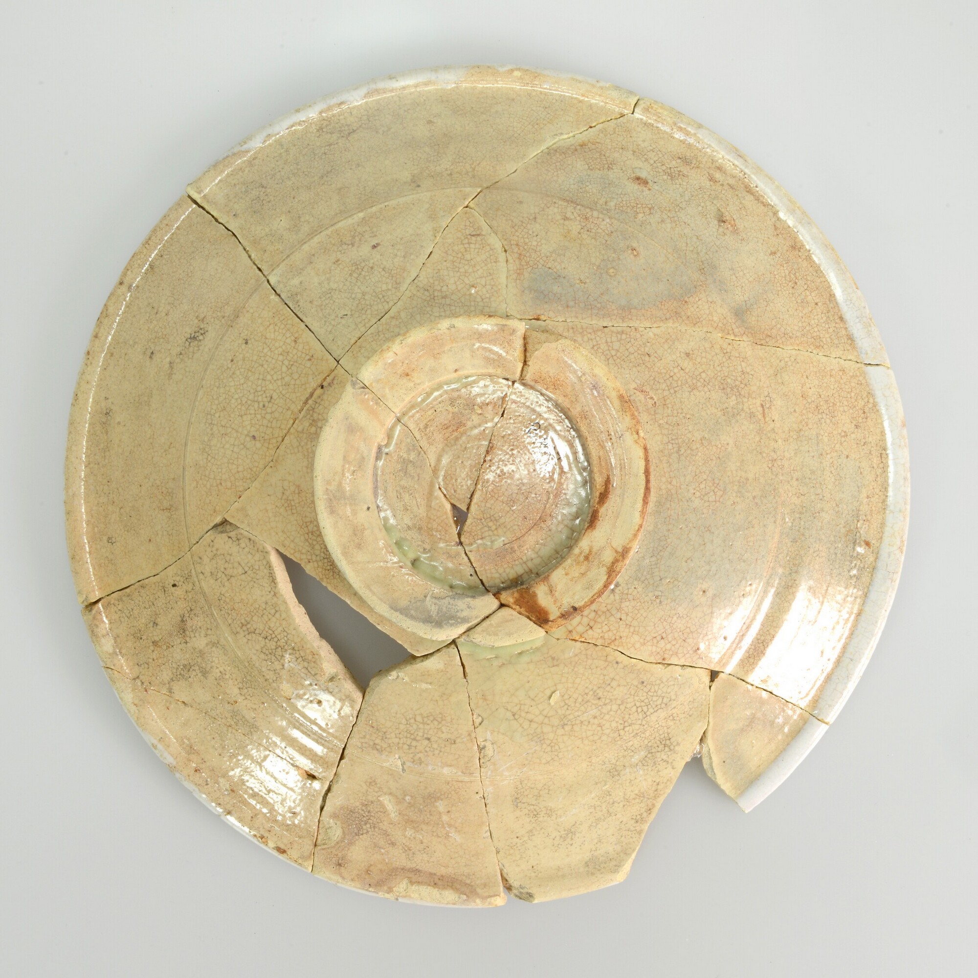 Bord; m-bor-3; bord met vlakke spiegel, knik spiegel-vlag en uitgebogen rand, standring; majolica; inwendig tinglazuur, uitwendig loodglazuur; beschildering in paars, geel en blauw: spiegel: naar links lopende man met staf binnen twee concentrische cirkels; vlag: boogsegmenten/ossenkoppen; herkomst: Friesland