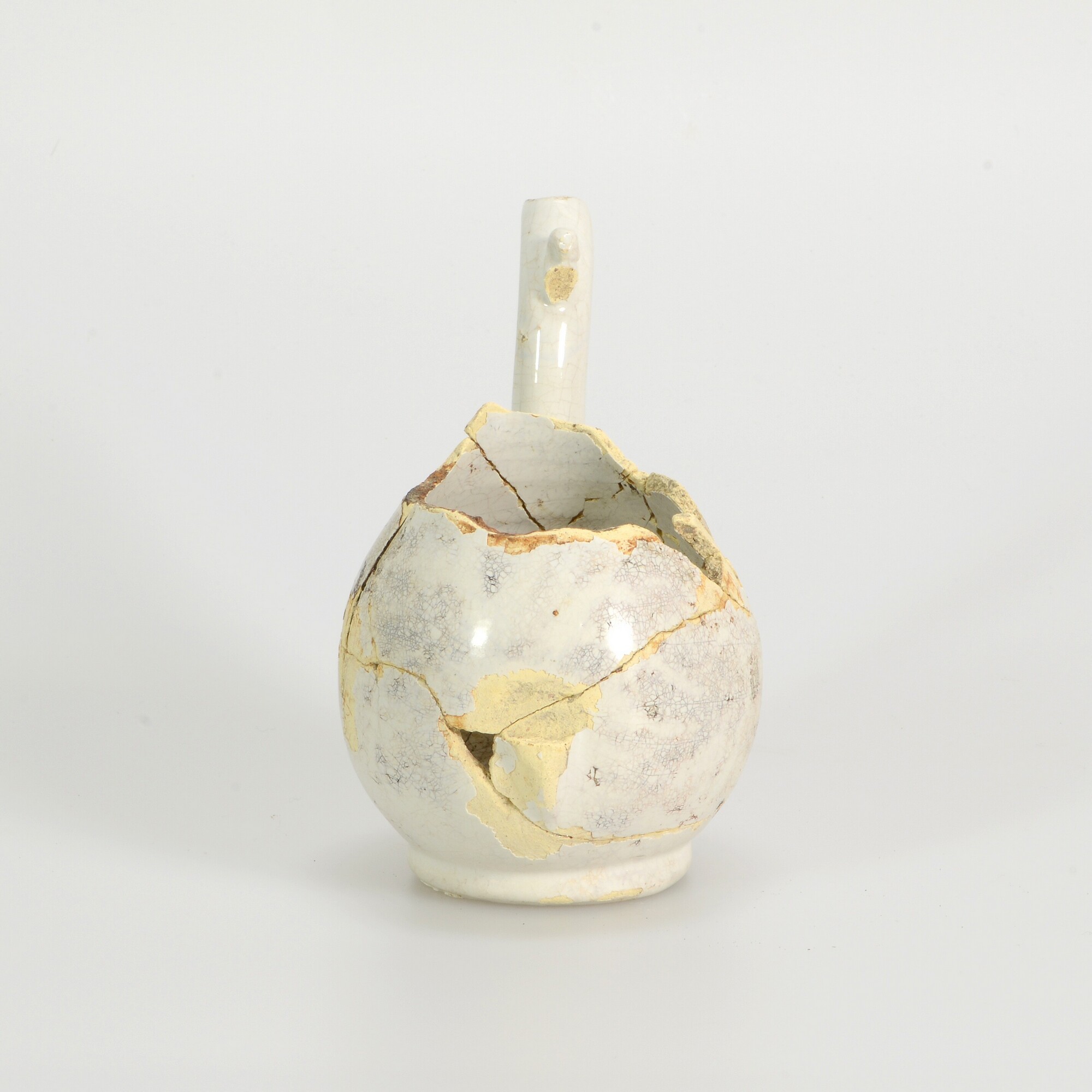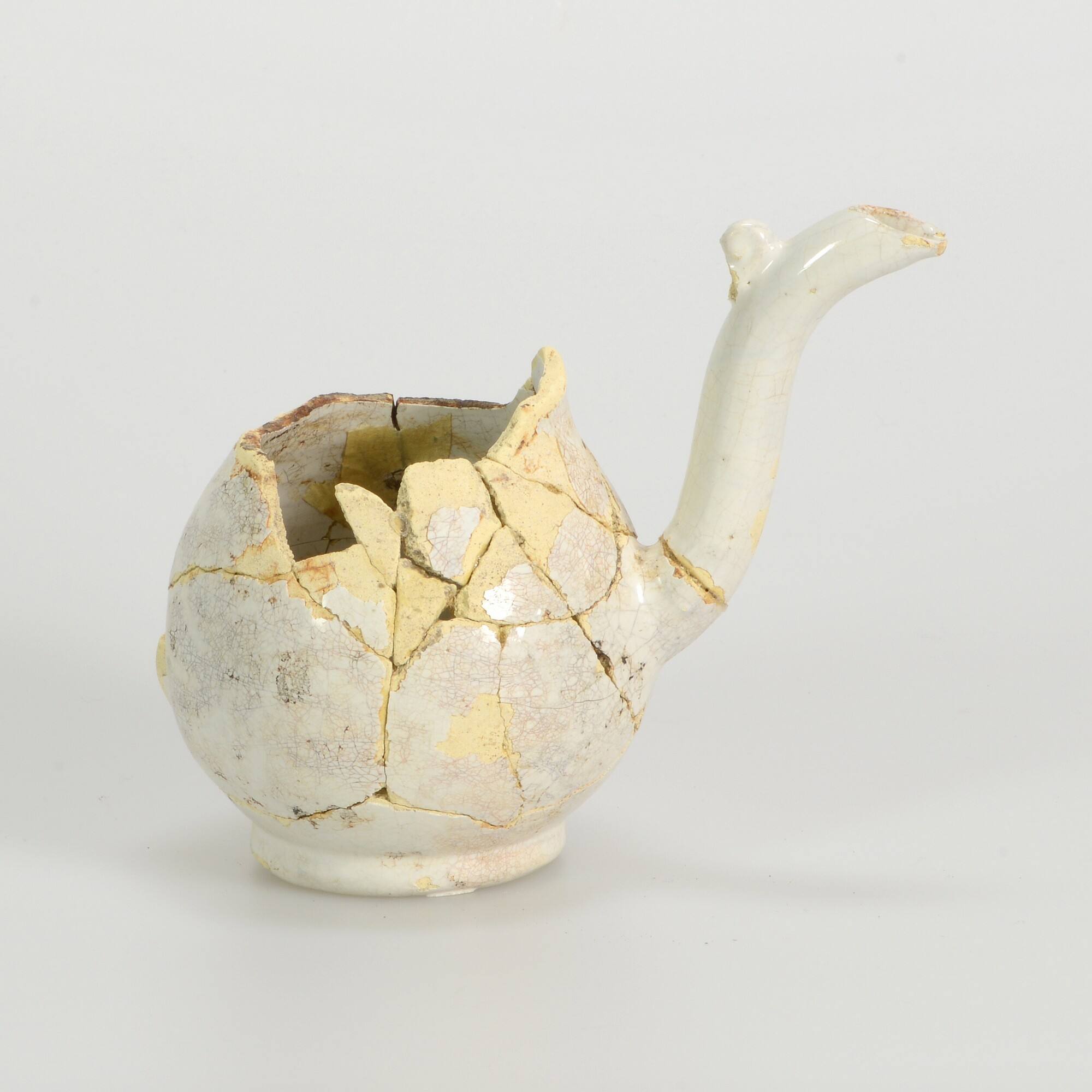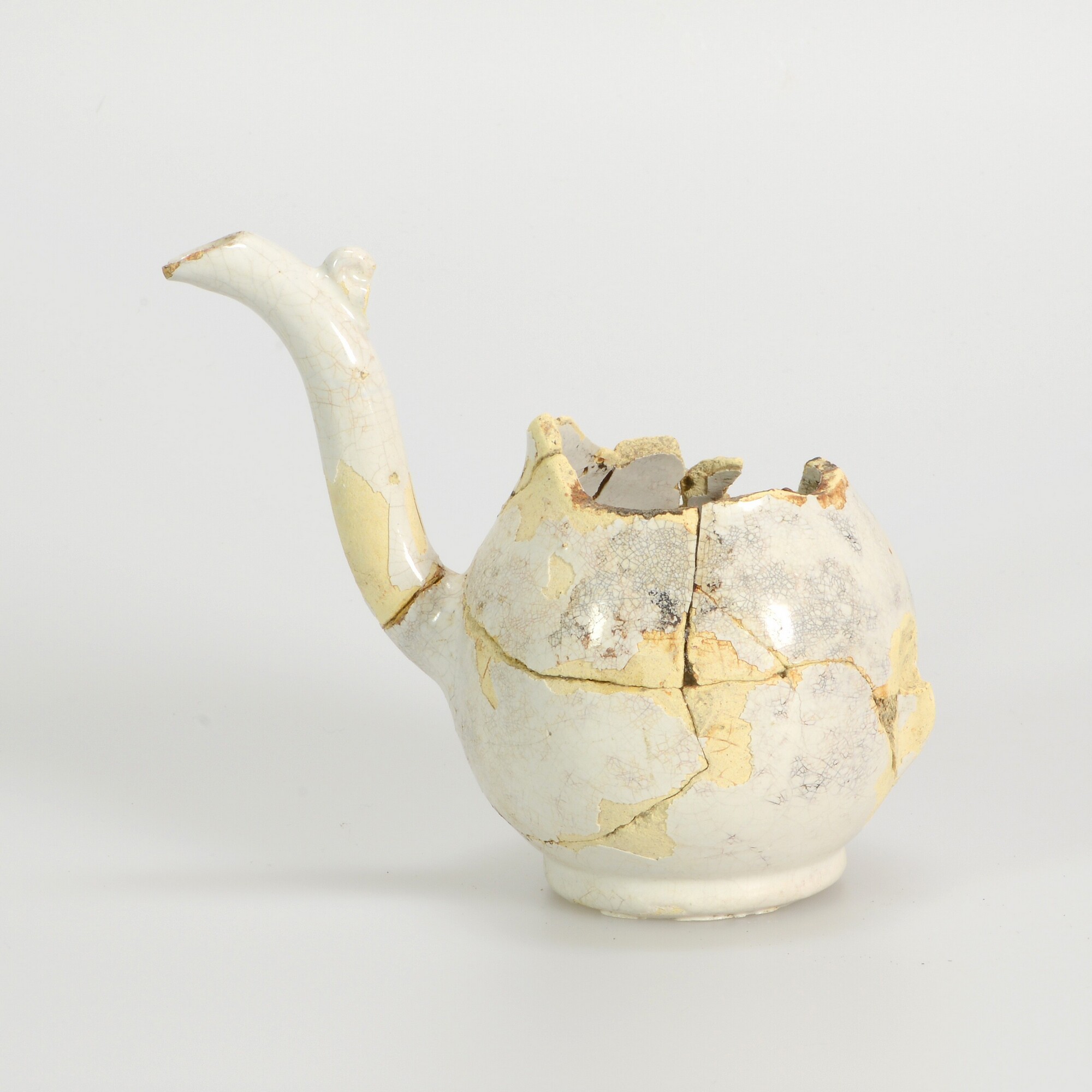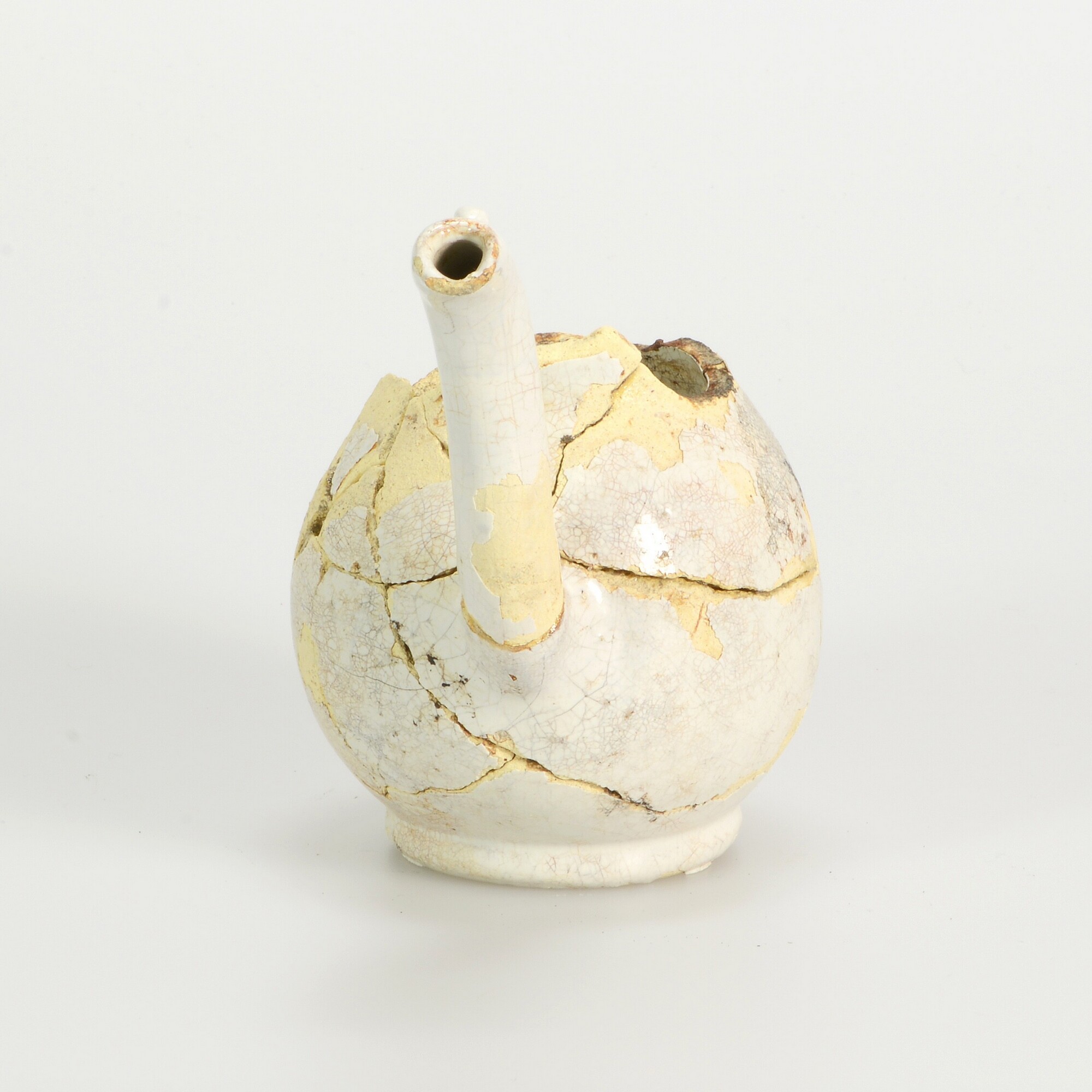 Theepot; f-the-3; bolle theepot met oorspronkelijk cilindrische hals (niet meer aanwezig), standvlak; faience; tinglazuur; ooraanzet en tuit