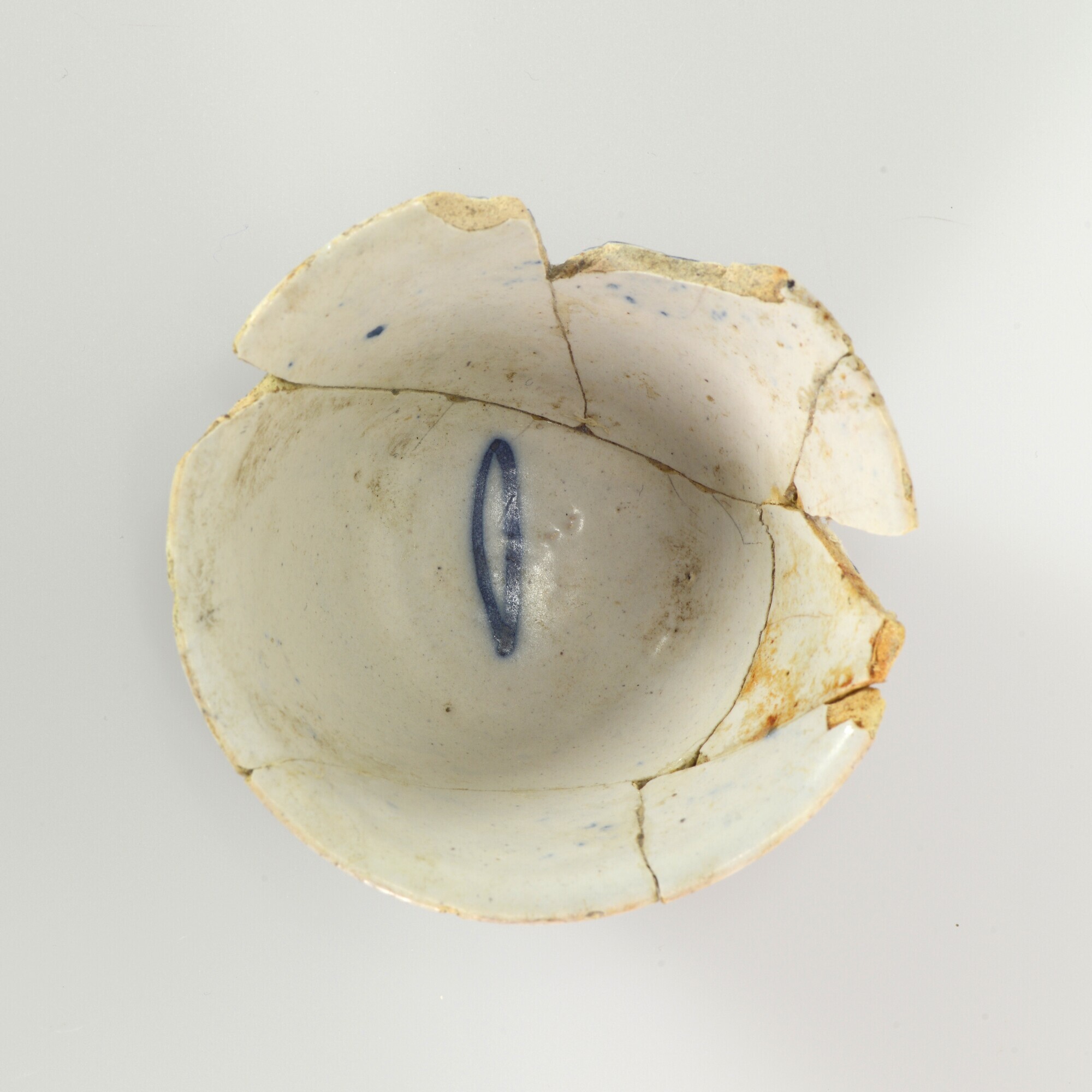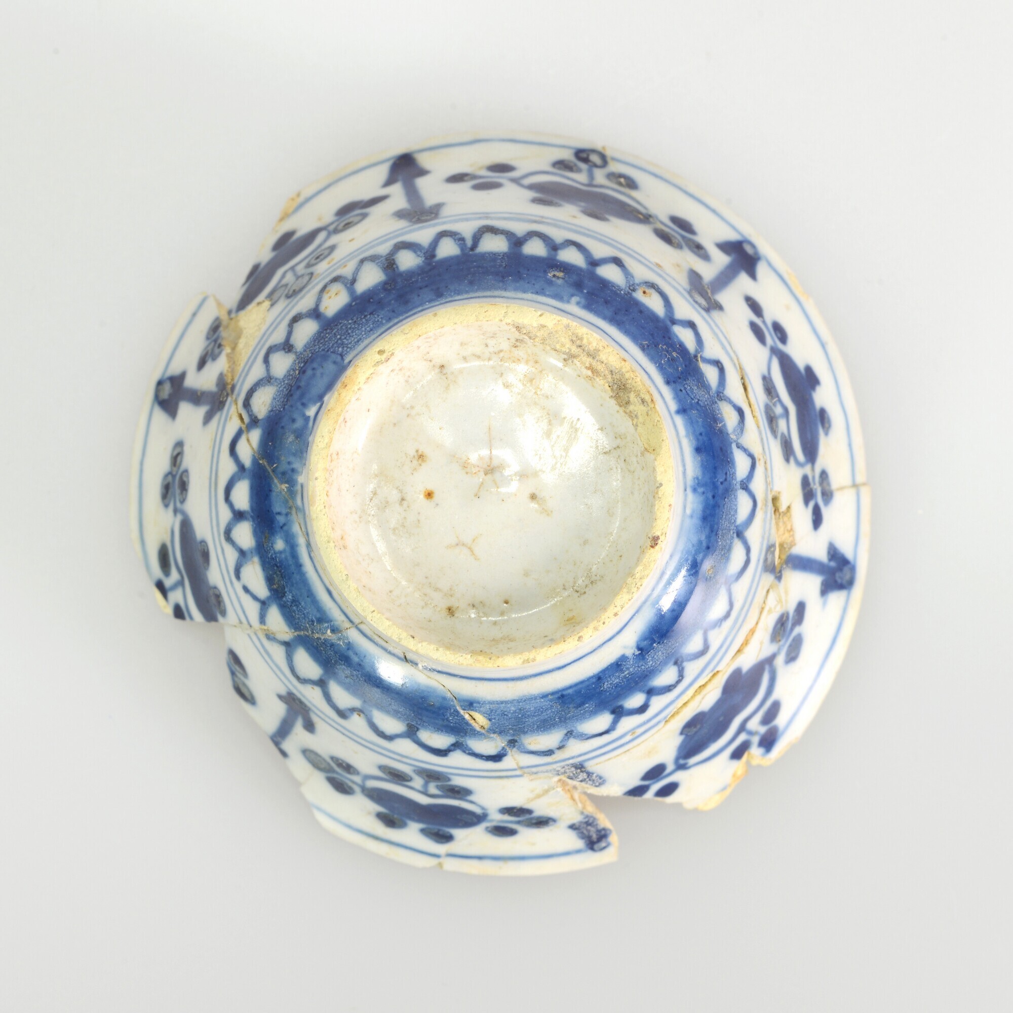 Kop; f-kop-2; steilwandige kop met uitgebogen rand, standring; Nederlandse faience; tinglazuur; blauwe beschildering: onderaan een sierrand met daarboven bloemmotieven tussen pijlen, bodem: veervormig blad; herkomst: Delft