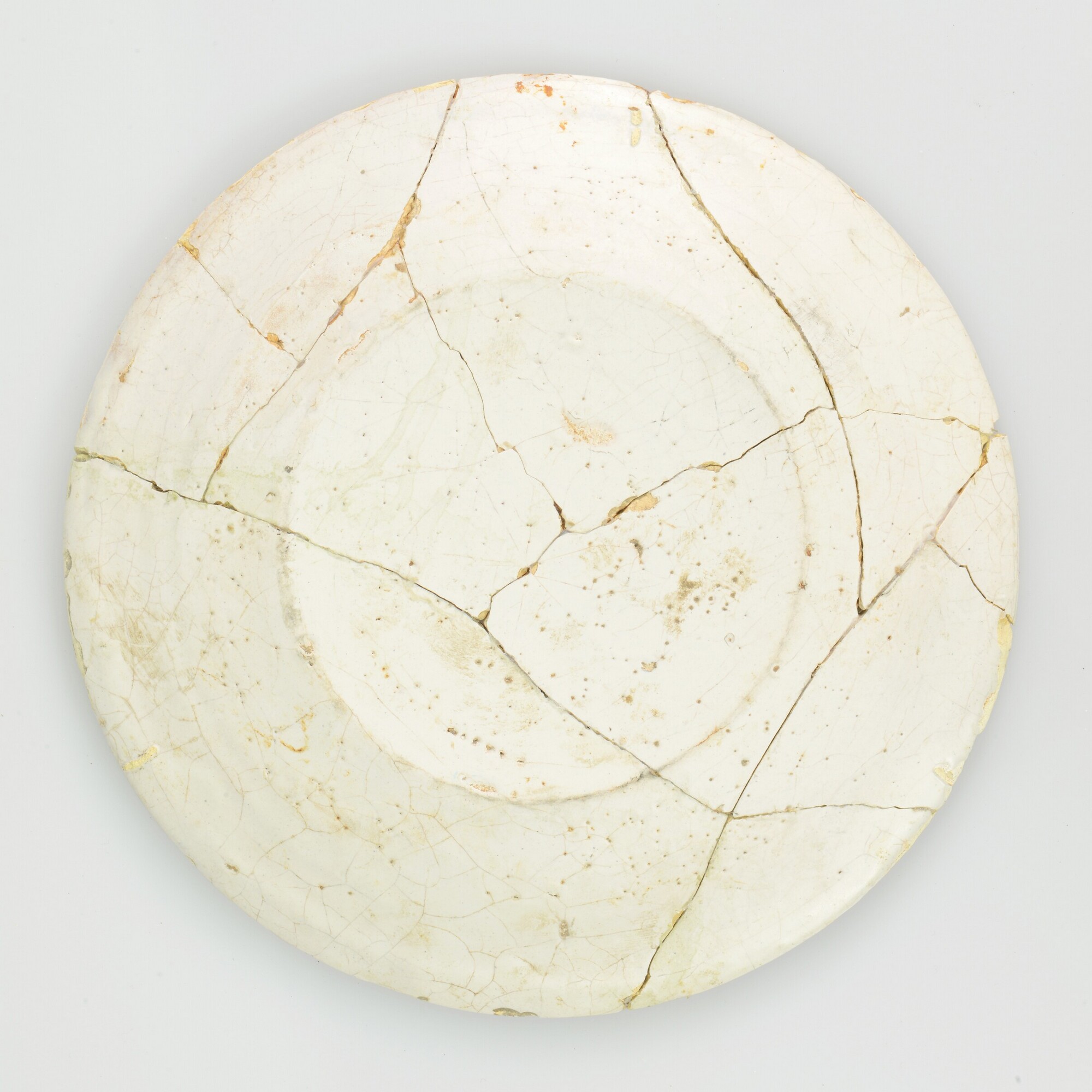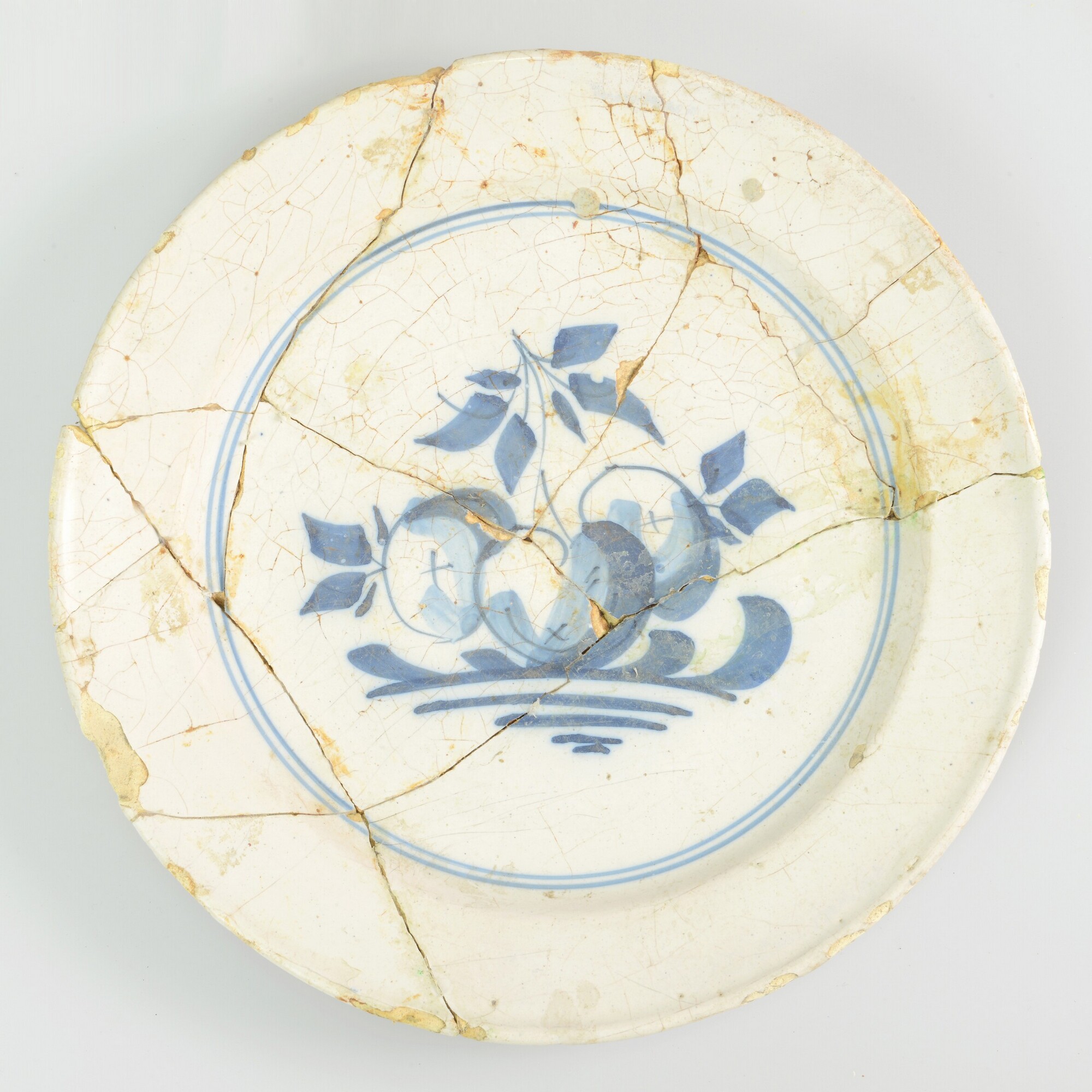 Bord; f-bor-2; Nederlandse faience; tinglazuur; plat bord met platte spiegel, platte vlag, inwendig met knik afgezet, standvlak; blauw op wit: spiegel: drie stuks fruit binnen twee cirkels; herkomst: Delft