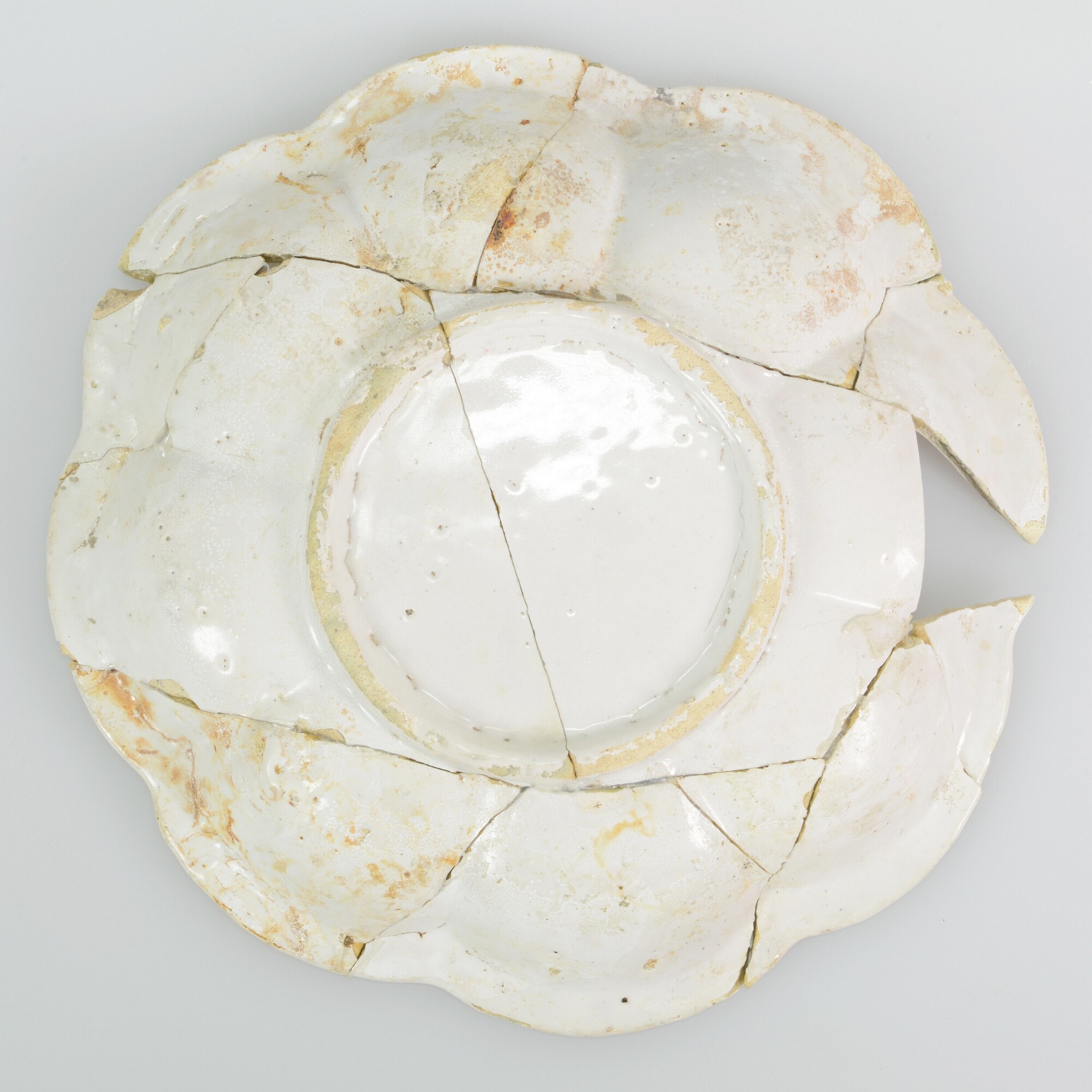 Plooischotel; f-plo-9; plooischotel met vlakke bodem en vloeiende overgang van spiegel naar vlag, uitgebogen rand, acht plooien; standring; faience; tinglazuur; geheel wit