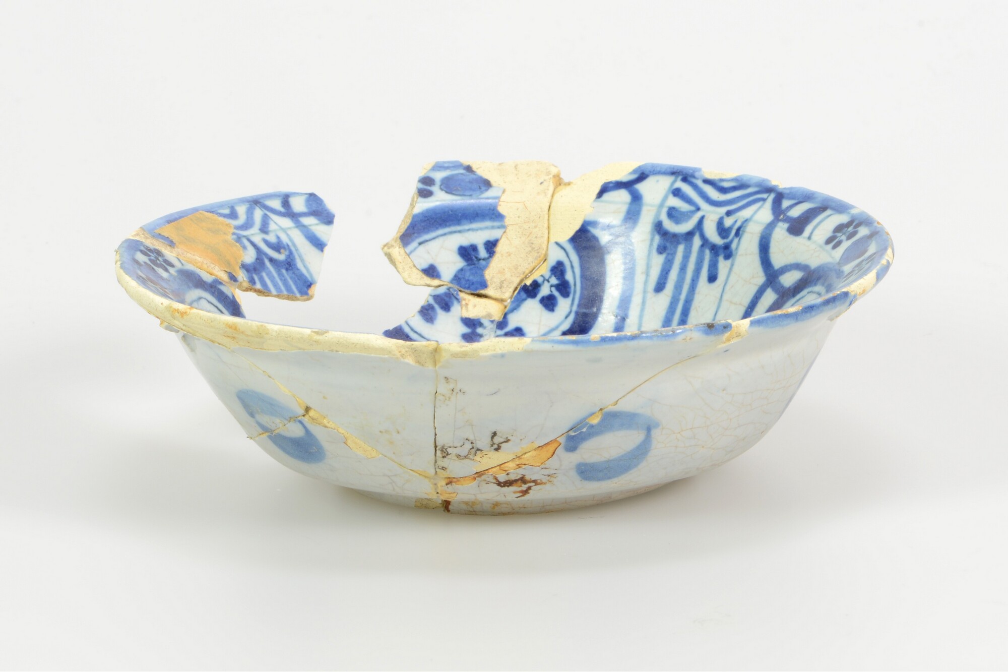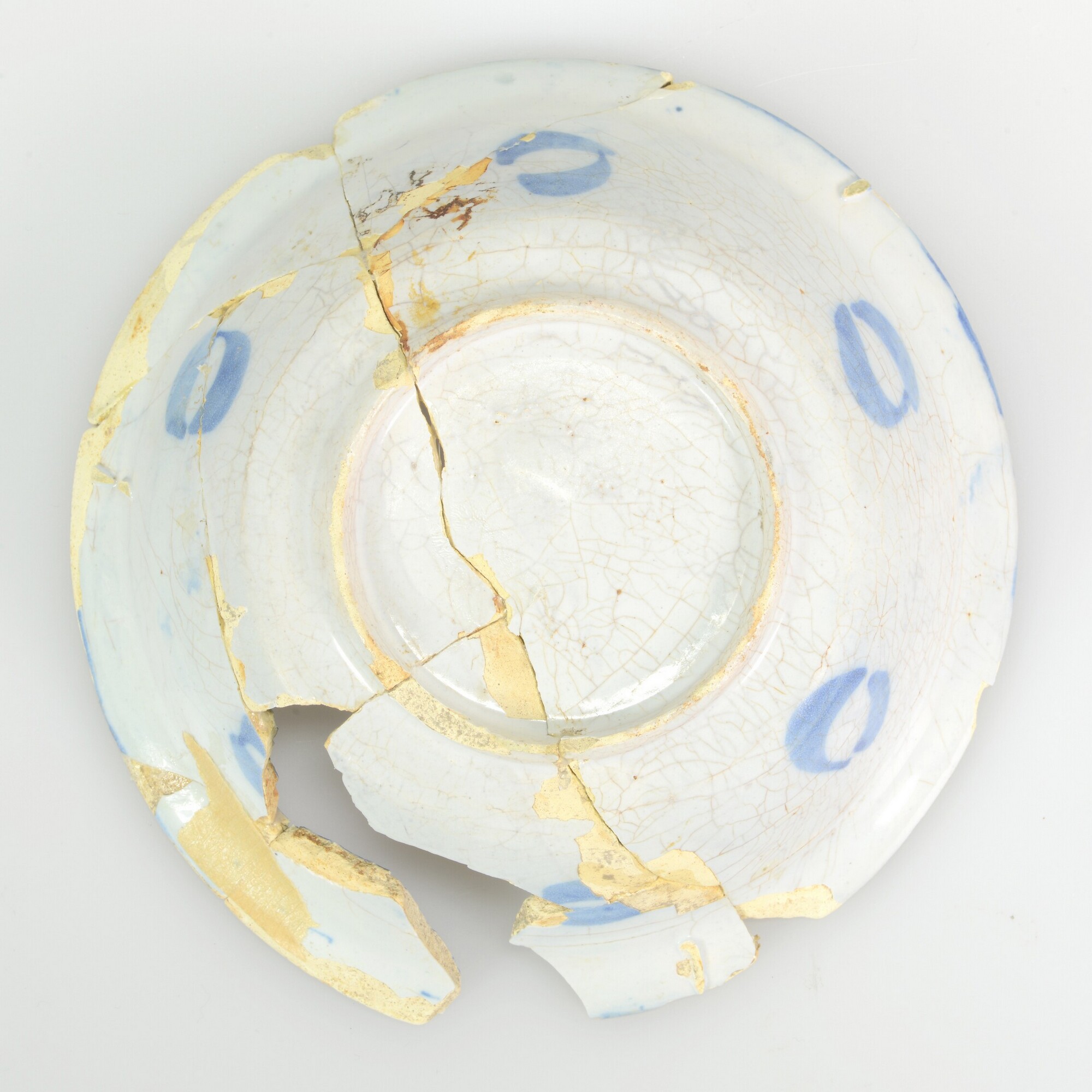 Kom; klapmuts; f-kom-14; Nederlandse faience; wijde bolle kom met naar buiten geknikte rand; standring; imitatie kraakporselein; spiegel: pauw met bloemen; wand/rand: vier brede en vier smalle perken met Chinese symbolen; onderzijde wand: zes cirkels; gat in standring; herkomst: Delft