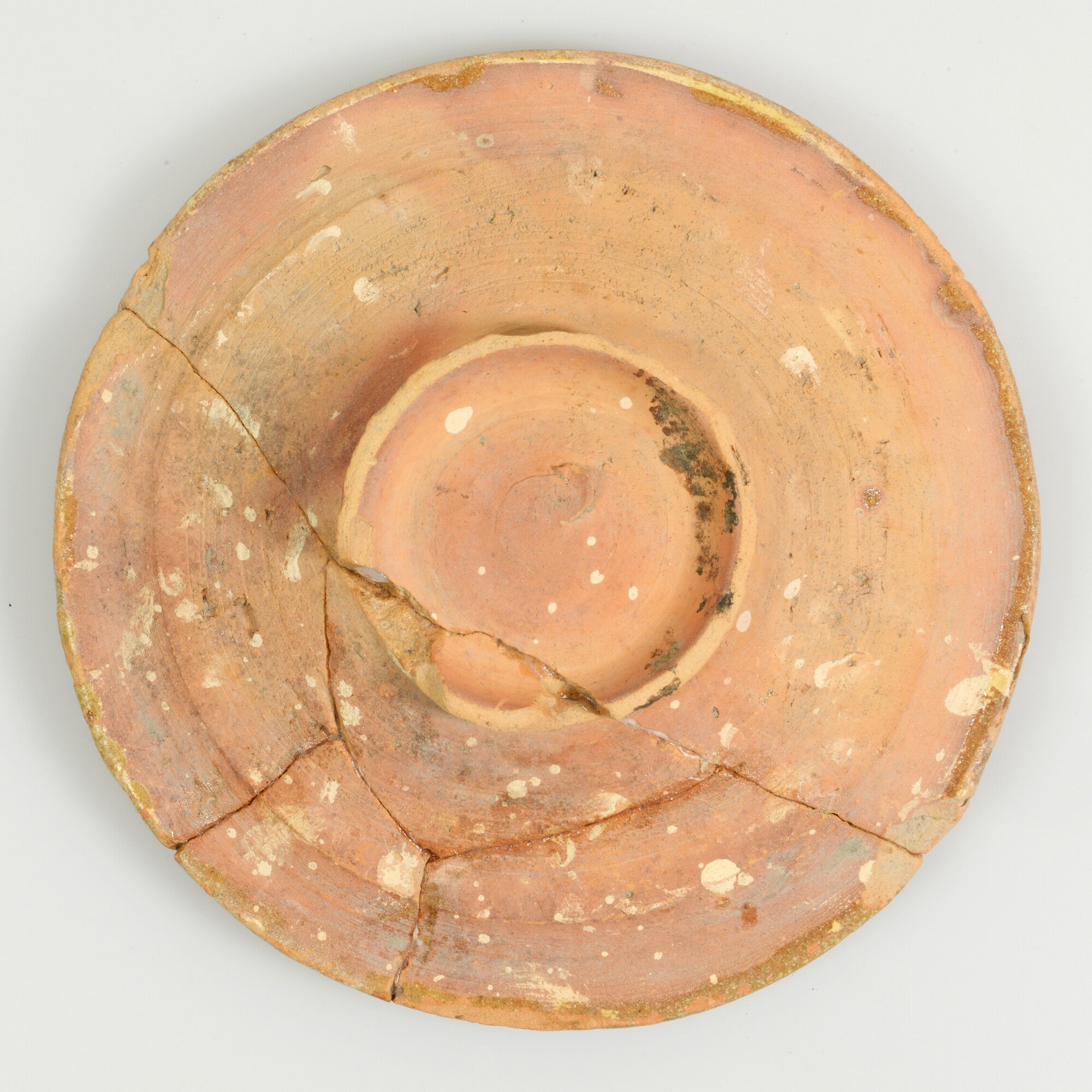 Bord; r-bor-3; bord zonder vlag met afgeronde kraagrand, standring; roodbakkend aardewerk; bovenzijde loodglazuur; inwendig gemarmerd met slib en koperoxide; herkomst: Friesland