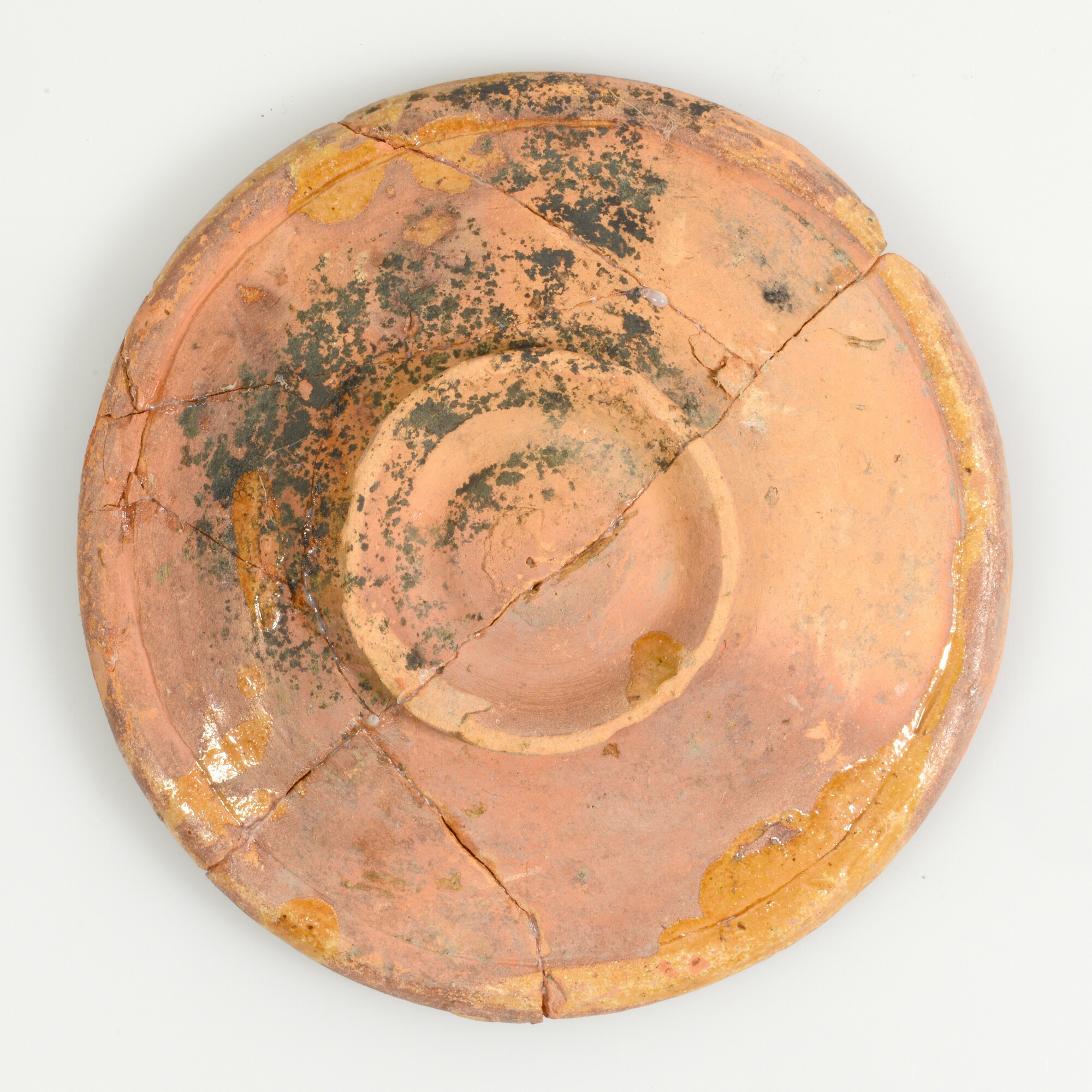 Bord; r-bor-3; bord zonder vlag met afgeronde kraagrand, standring; roodbakkend aardewerk; bovenzijde loodglazuur; inwendig gemarmerd met slib en koperoxide; herkomst: Friesland