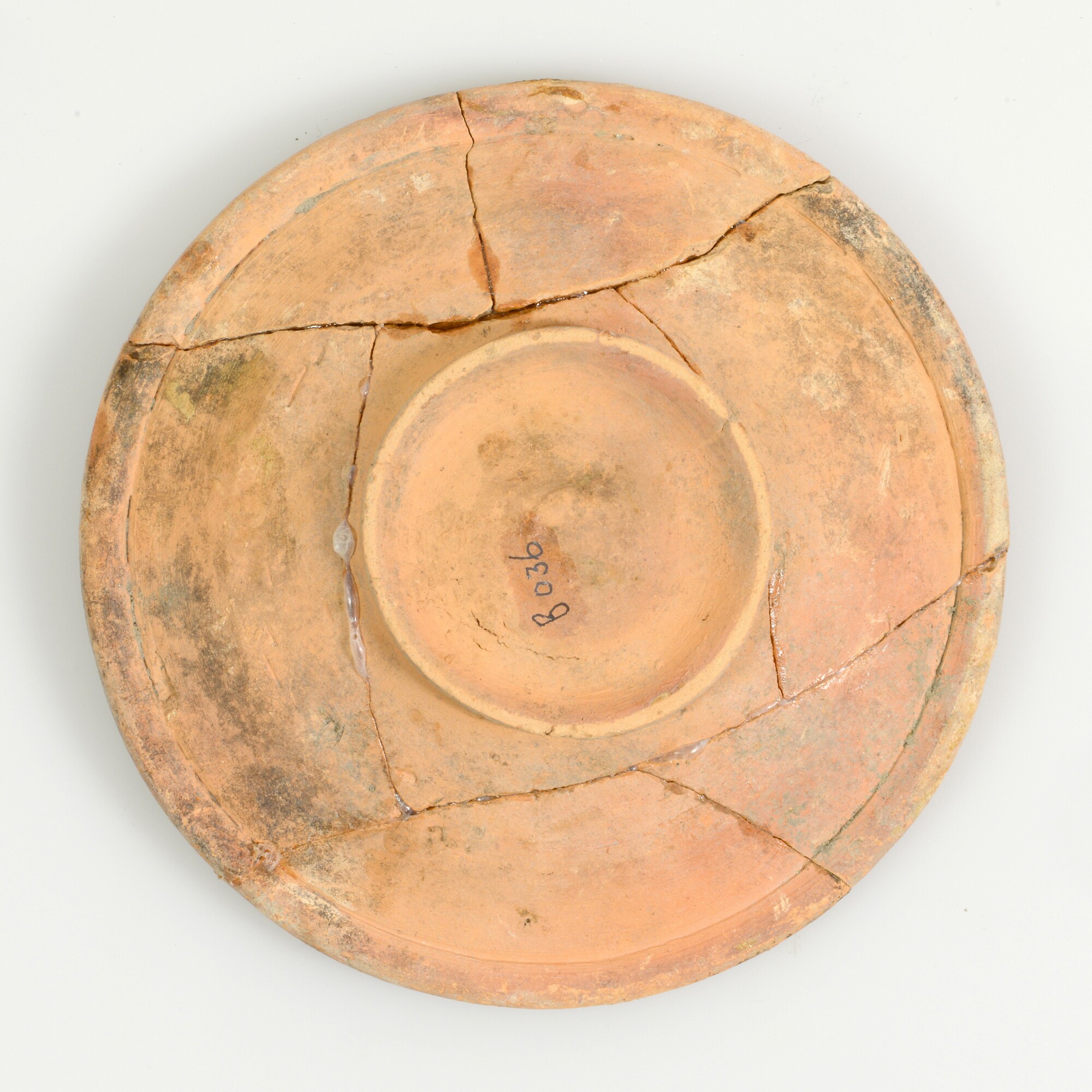 Bord; r-bor-3; bord zonder vlag met afgeronde kraagrand, standring; roodbakkend aardewerk; bovenzijde loodglazuur; inwendig gemarmerd met slib; herkomst: Friesland