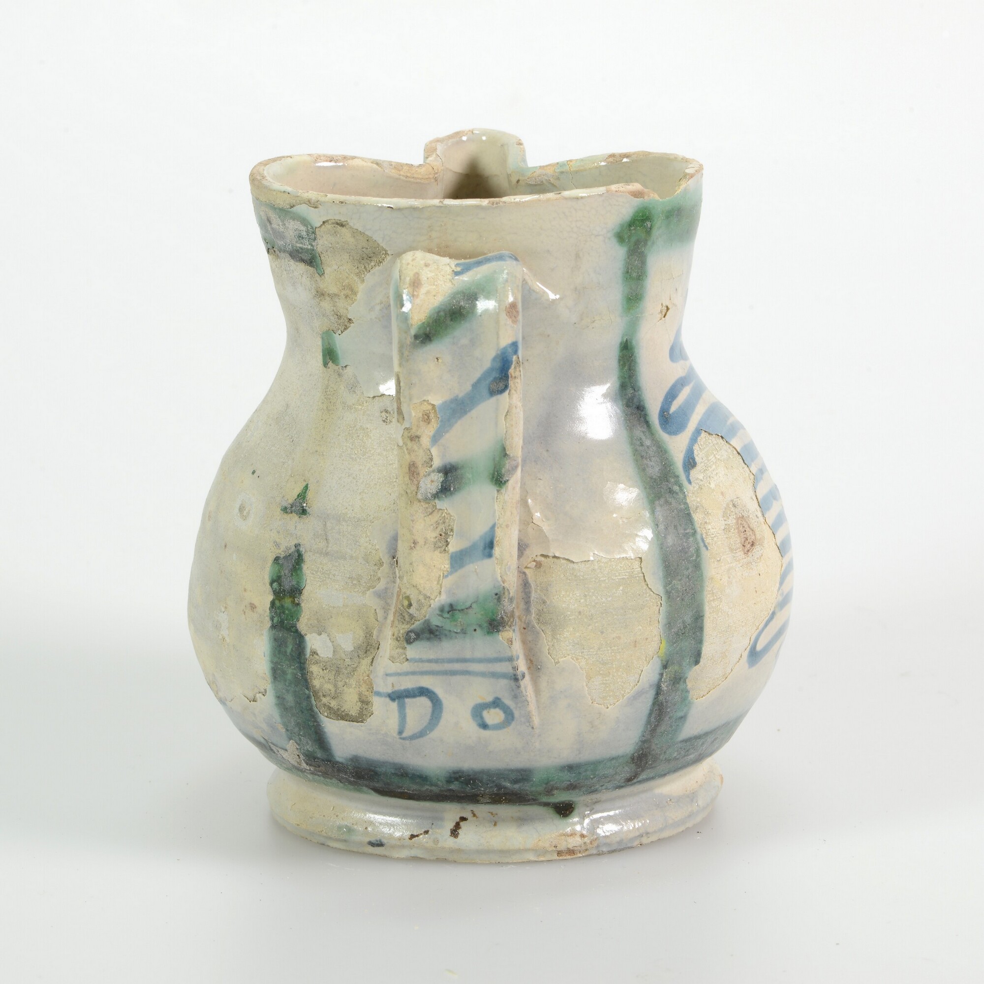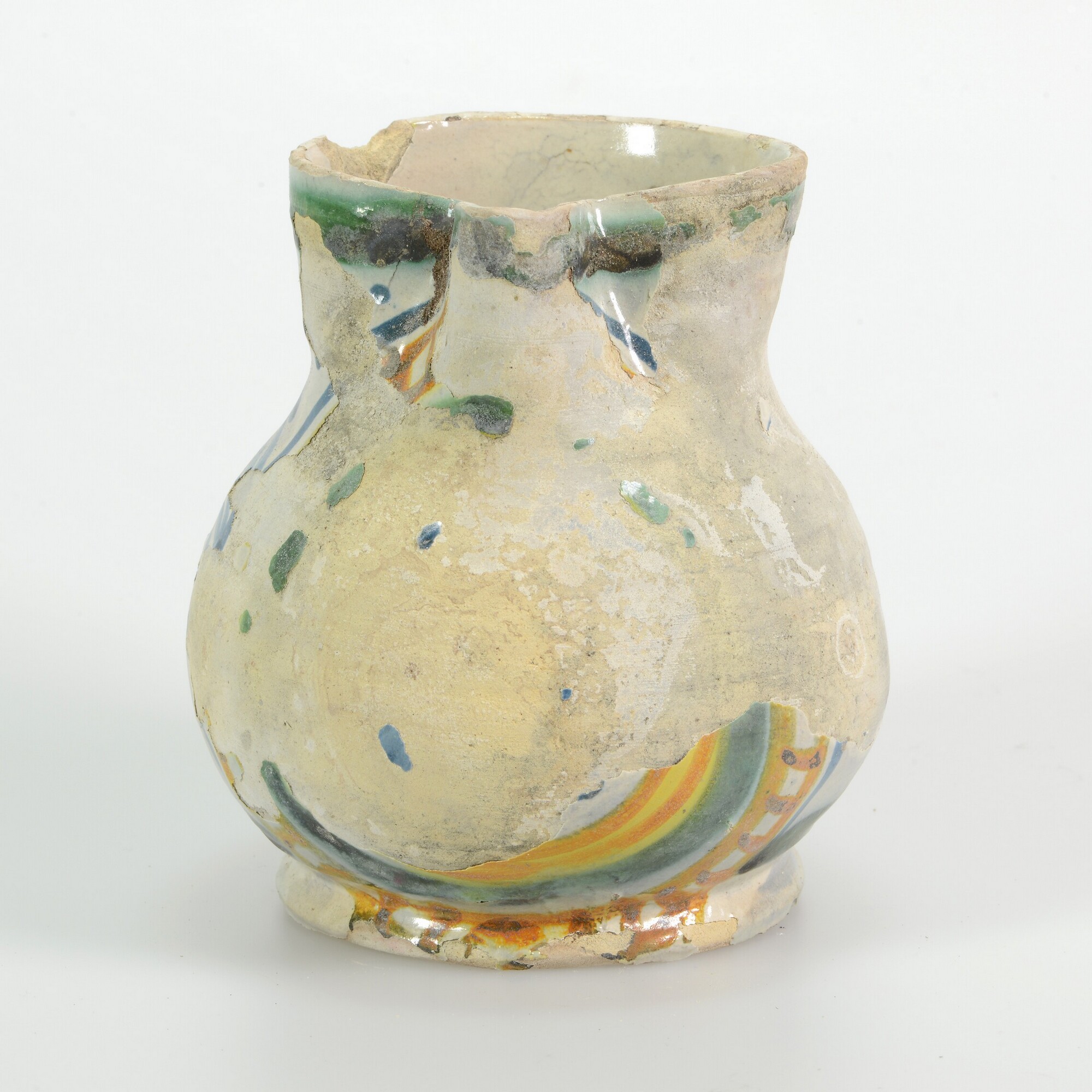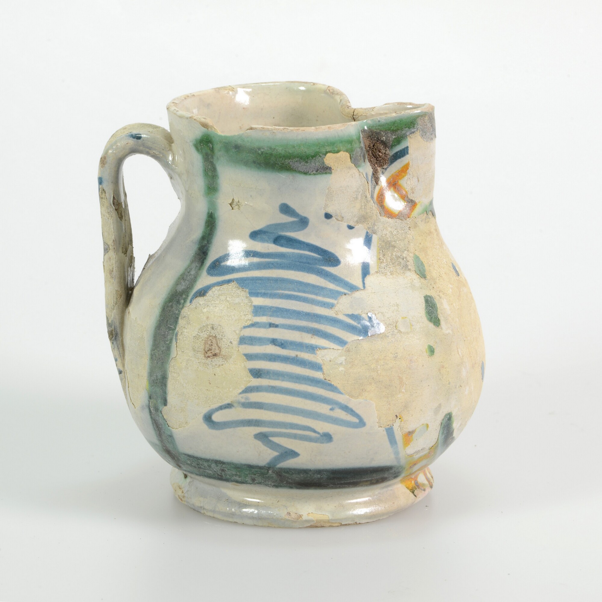 Kan; i-kan-6; peervormige kan met vloeiende overgang buik-schouder-hals met licht uitstaande rechte rand, standvoet; Italiaanse majolica; tinglazuur; beschildering: antimoongeel, ijzerbruin, kobaltblauw en kopergroen, voorkant buik: afgebladderd, zijkant: grof zigzag/spiraal-motief, achterzijde: wit; verticaal bandoor; herkomst: Italië, Montelupo