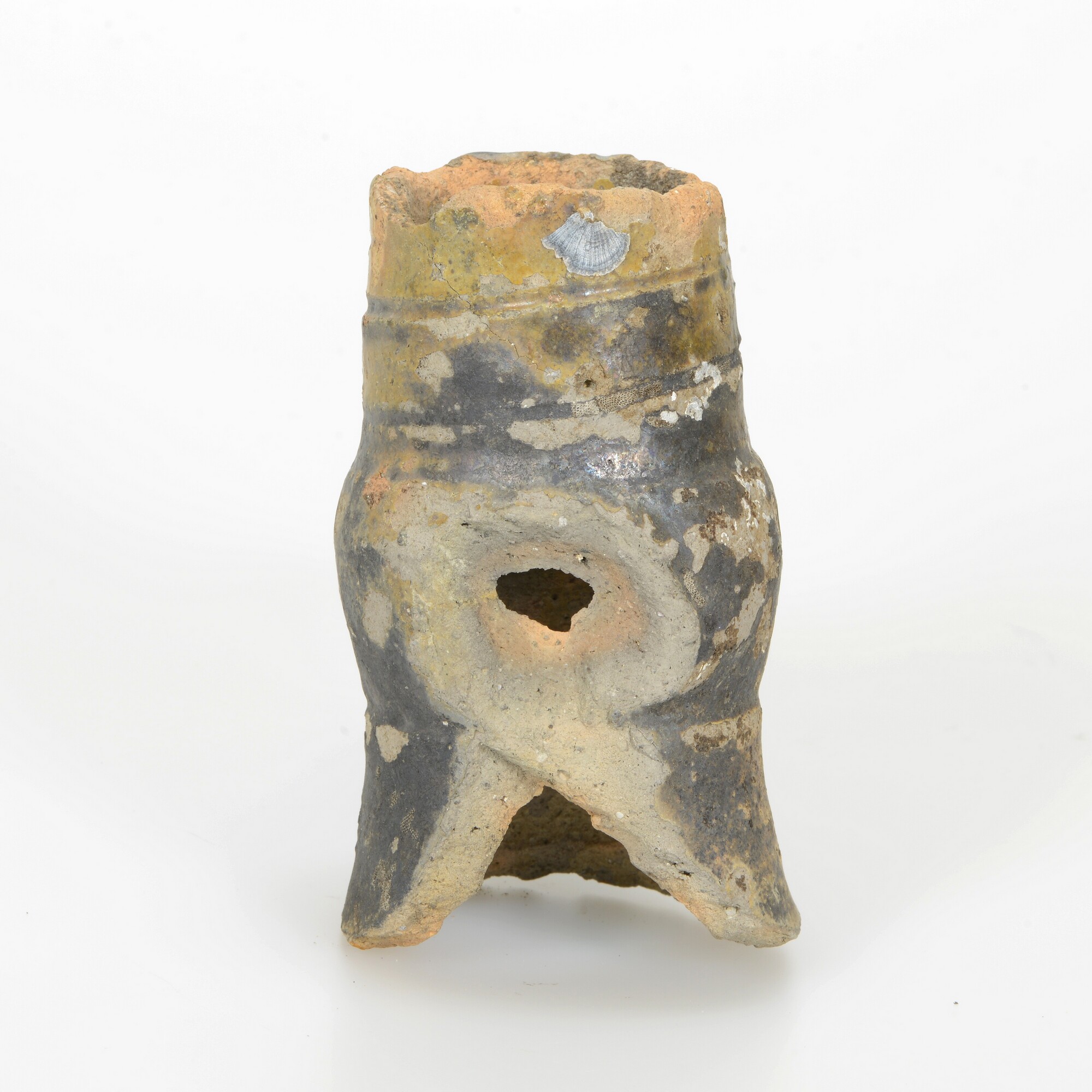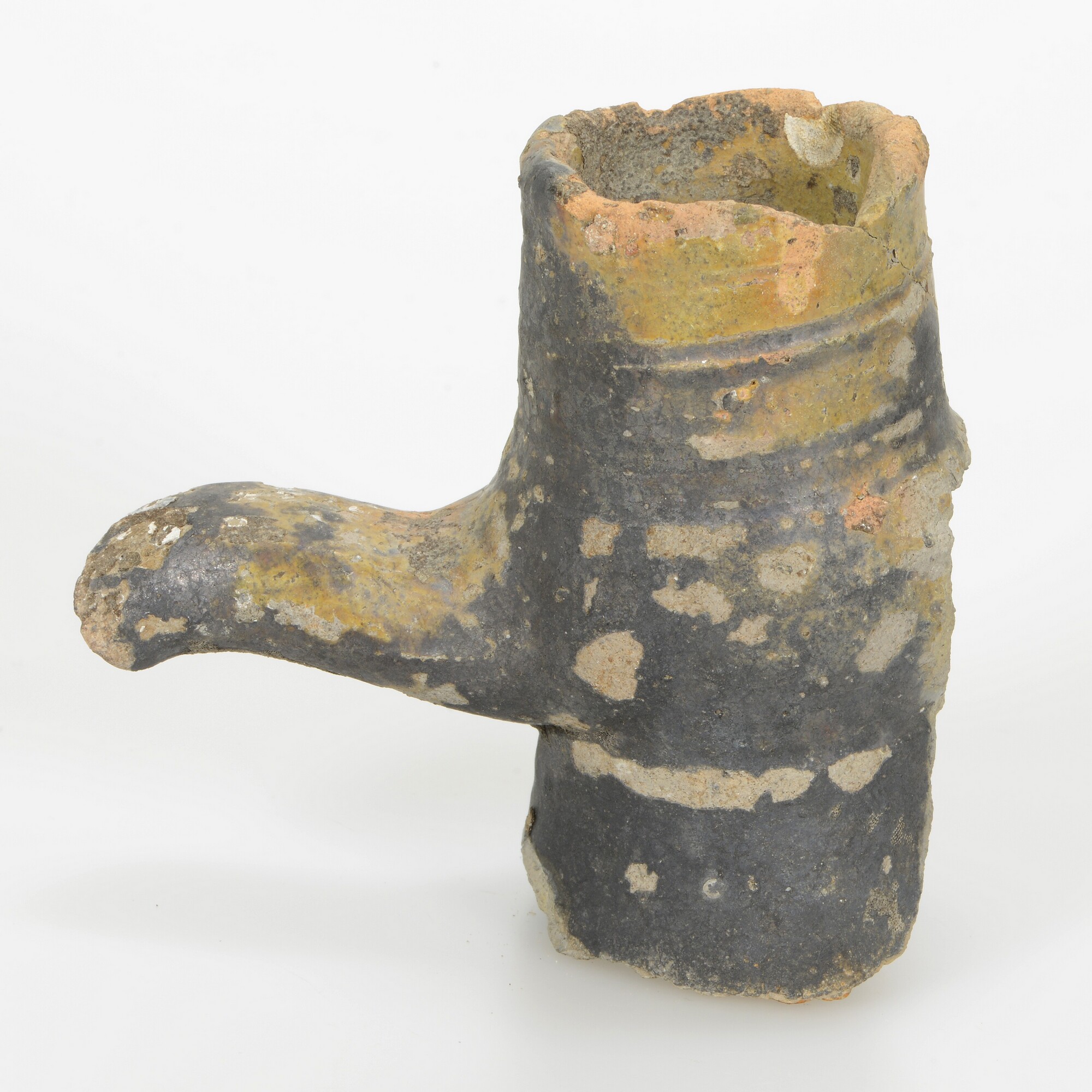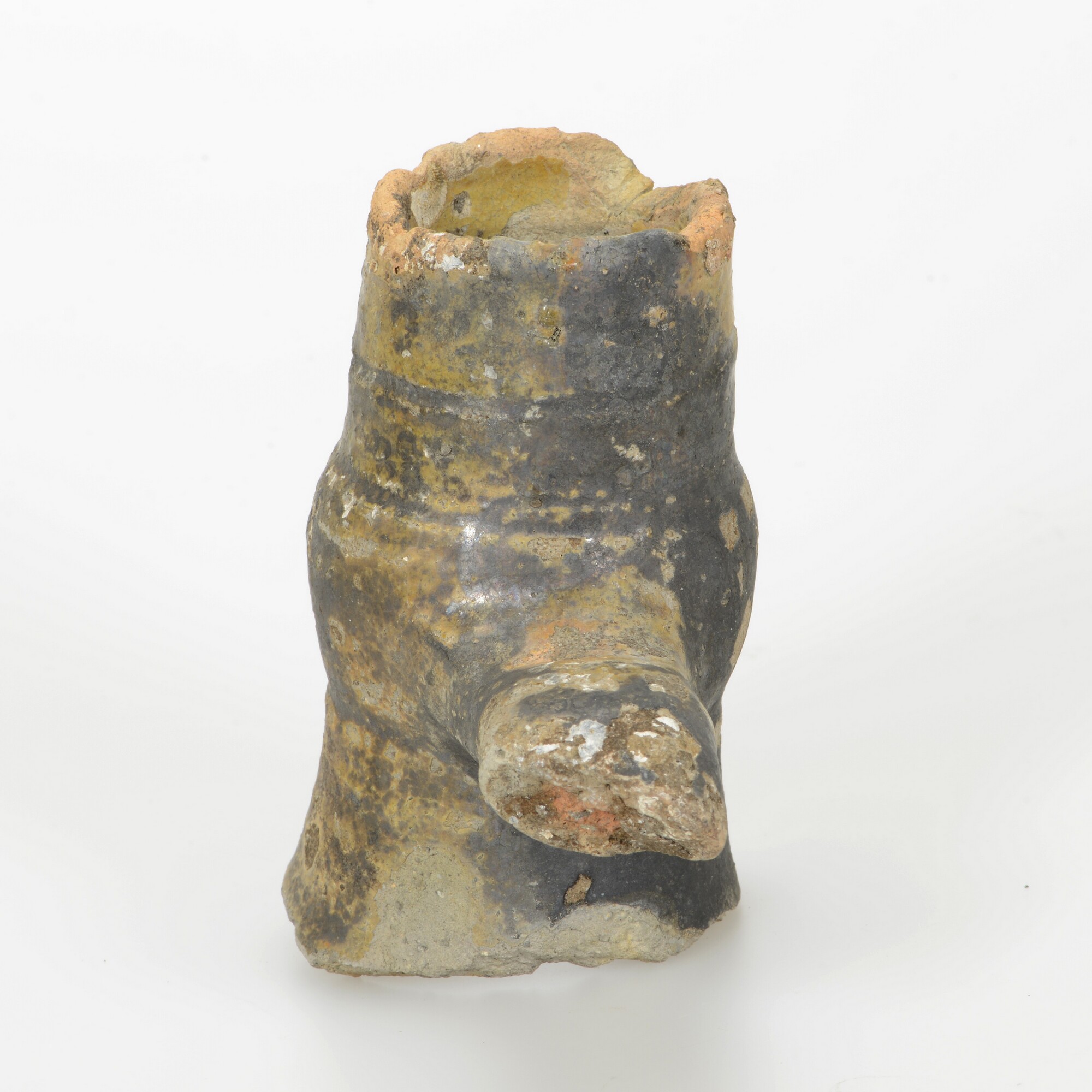 Kruik; s2-kru; steengoed met zoutglazuur; geel/zwarte ijzerengobe; oorspronkelijk twee verticale worstoren; spiraalvormige groef in de hals; herkomst: Bouffioulx (België)?