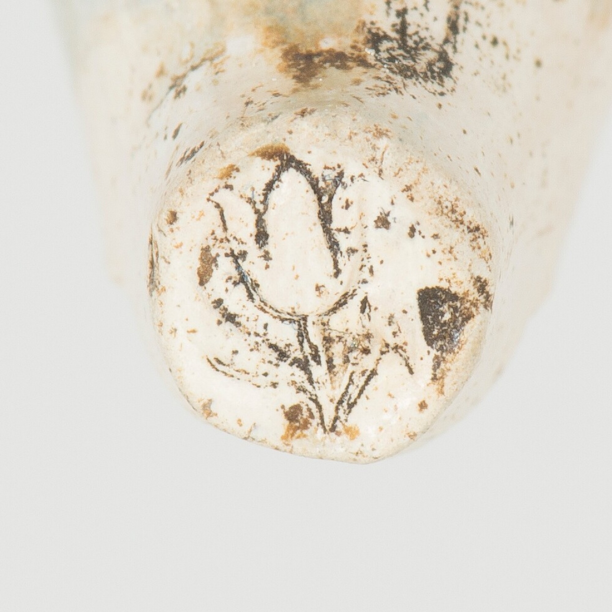 Pijpenkop; trechtervormig; ketelmerk: tulp; geglaasd; gebotterd; gehele radering rondom ketelopening; herkomst: Gouda; vervaardiger: Anthony Spitsbergen